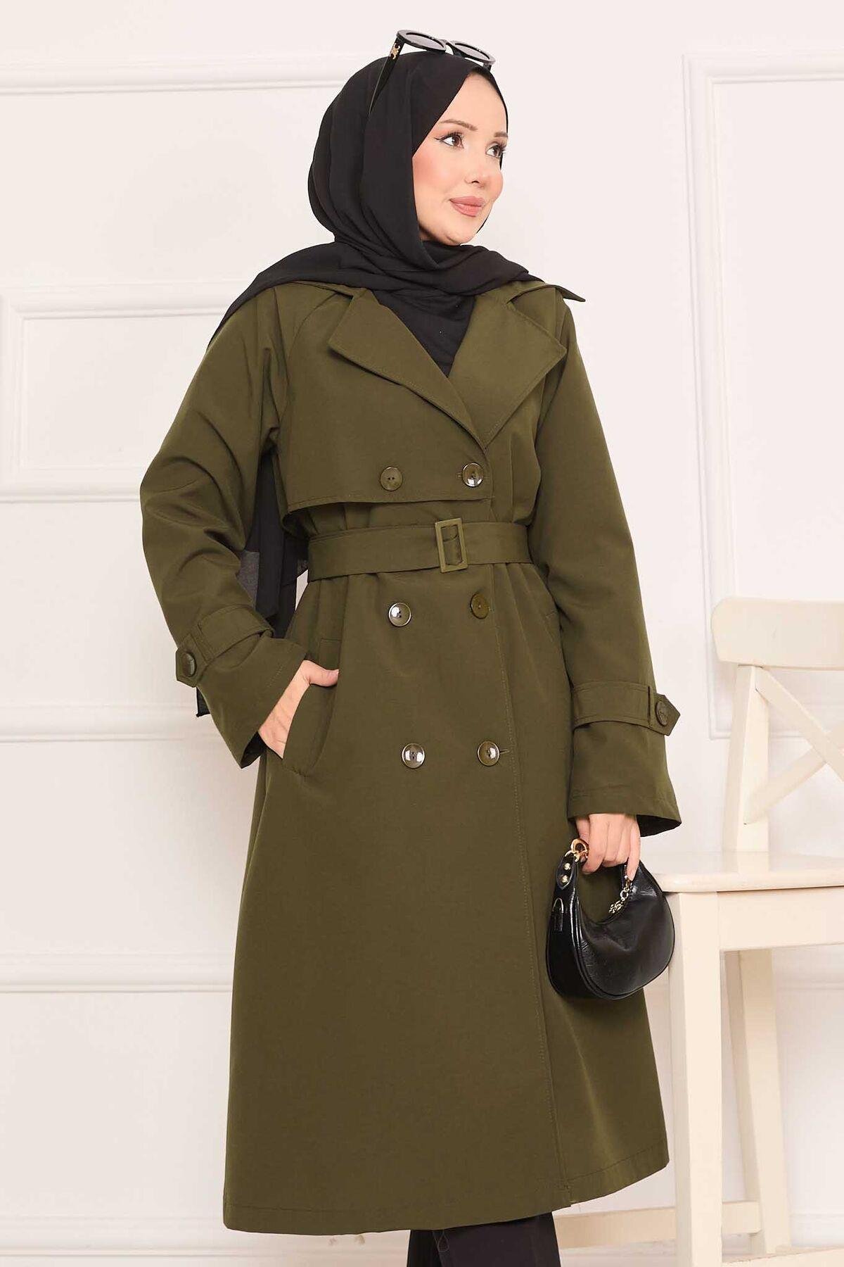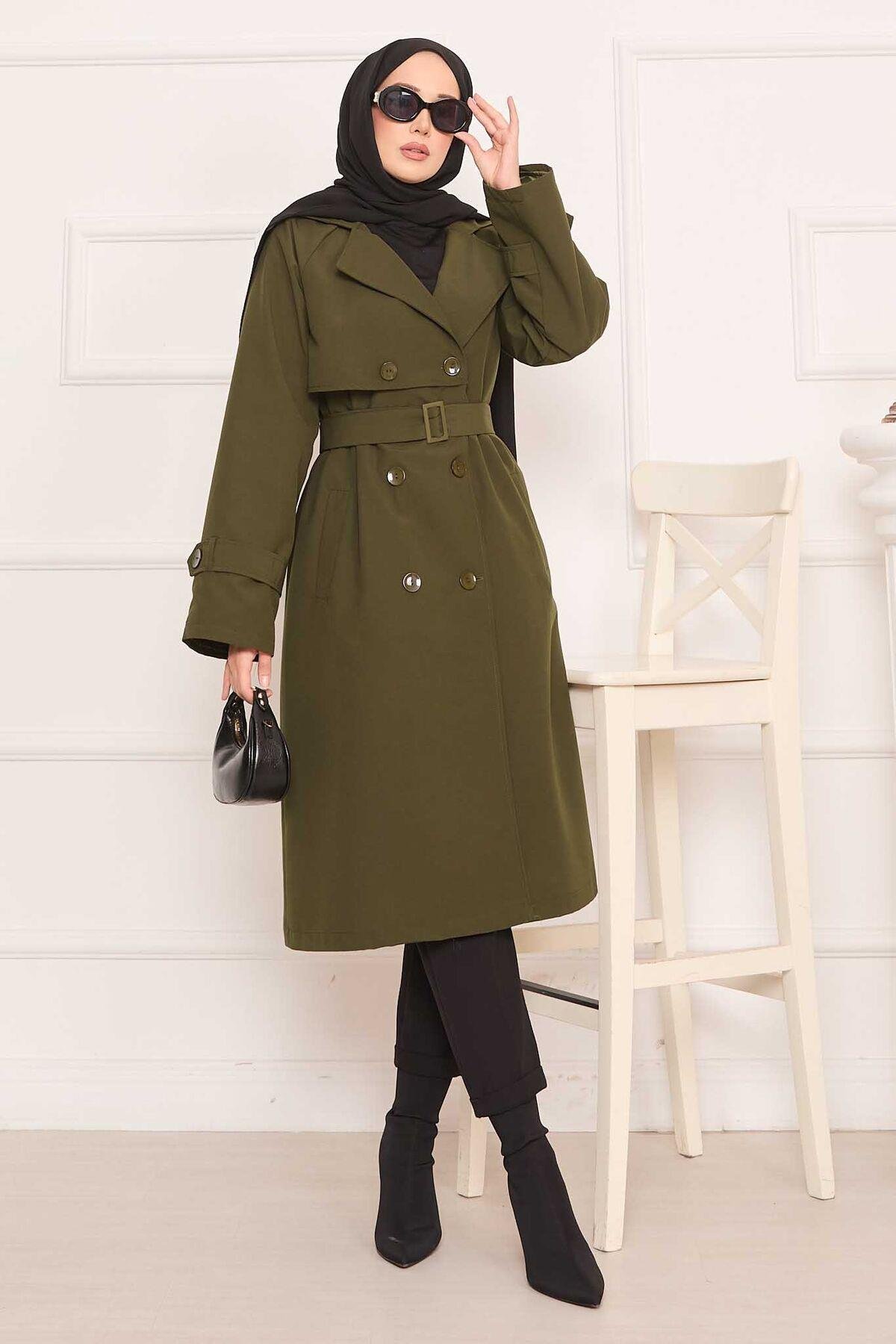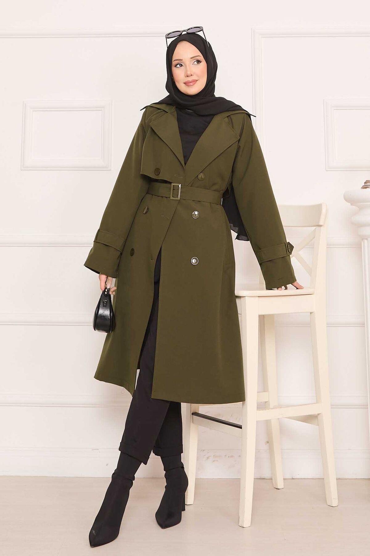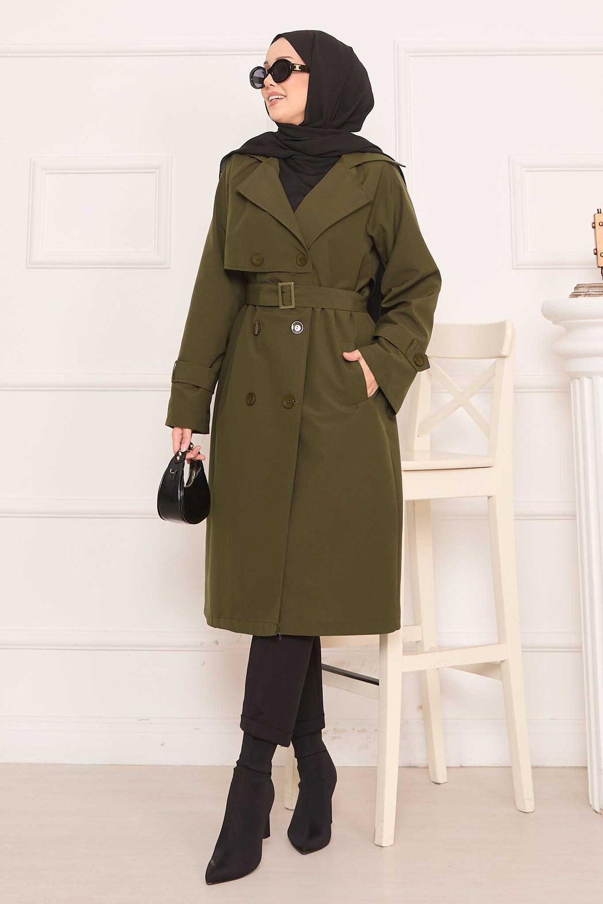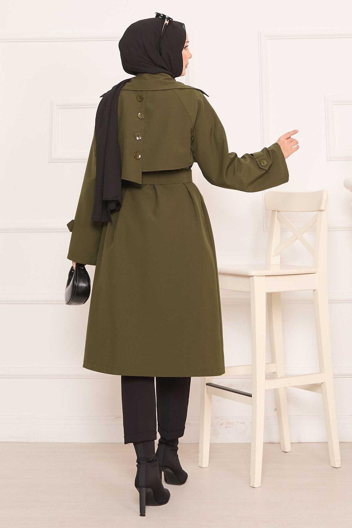 Removable Belted Hijab Trench Coat with Button Detail on the Back Khaki (125M01921181R2238)