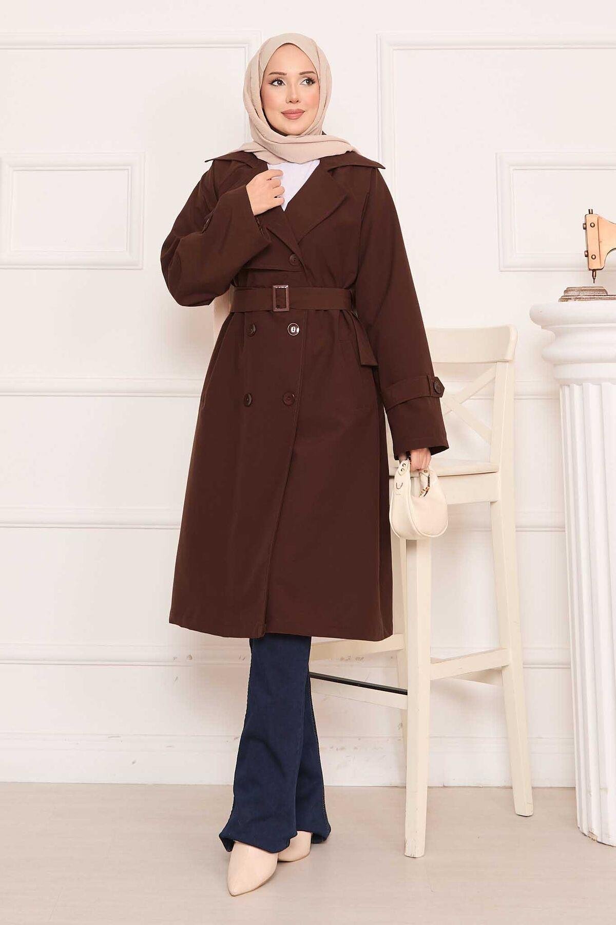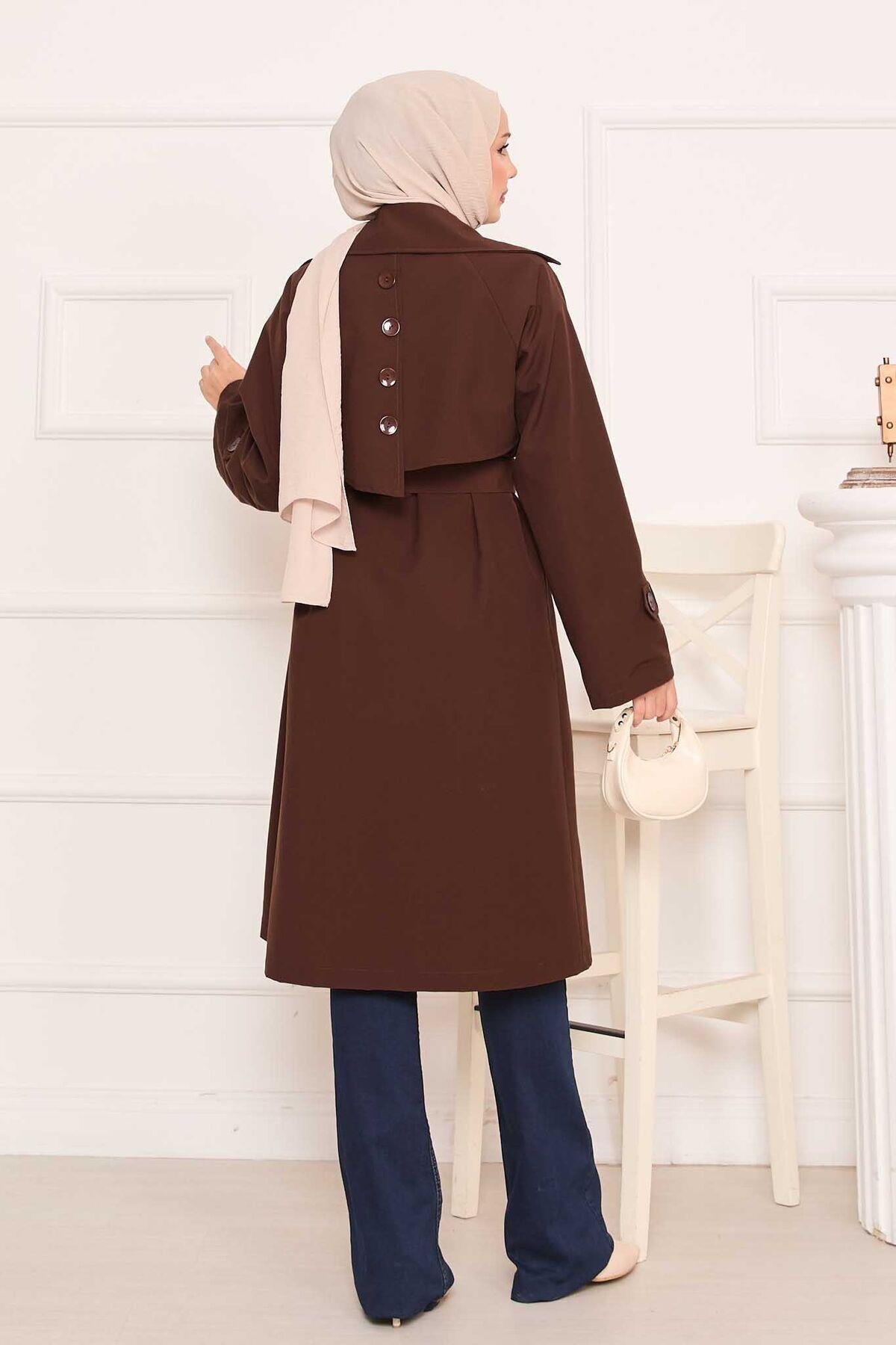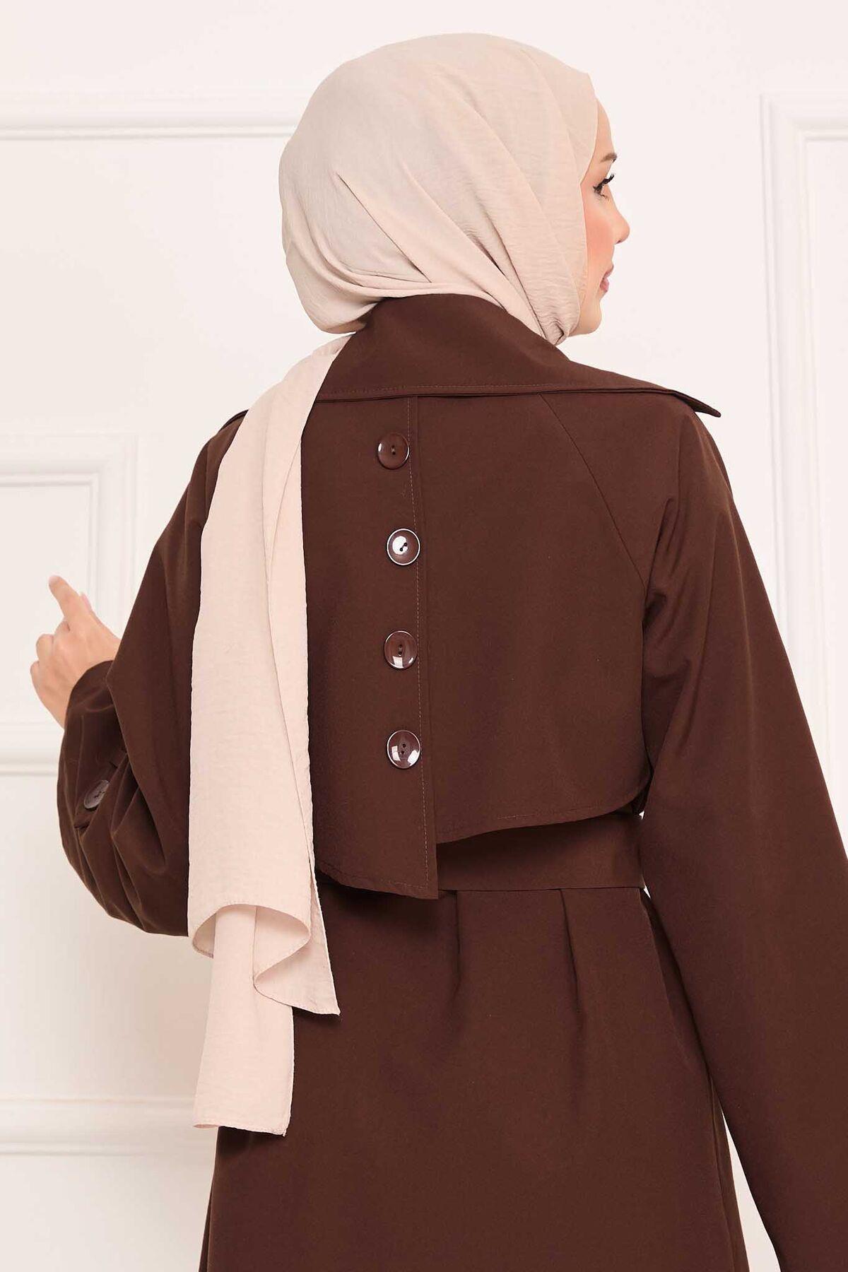 Removable Belted Hijab Trench Coat with Button Detail on the Back, Brown (125M01921181R2538)