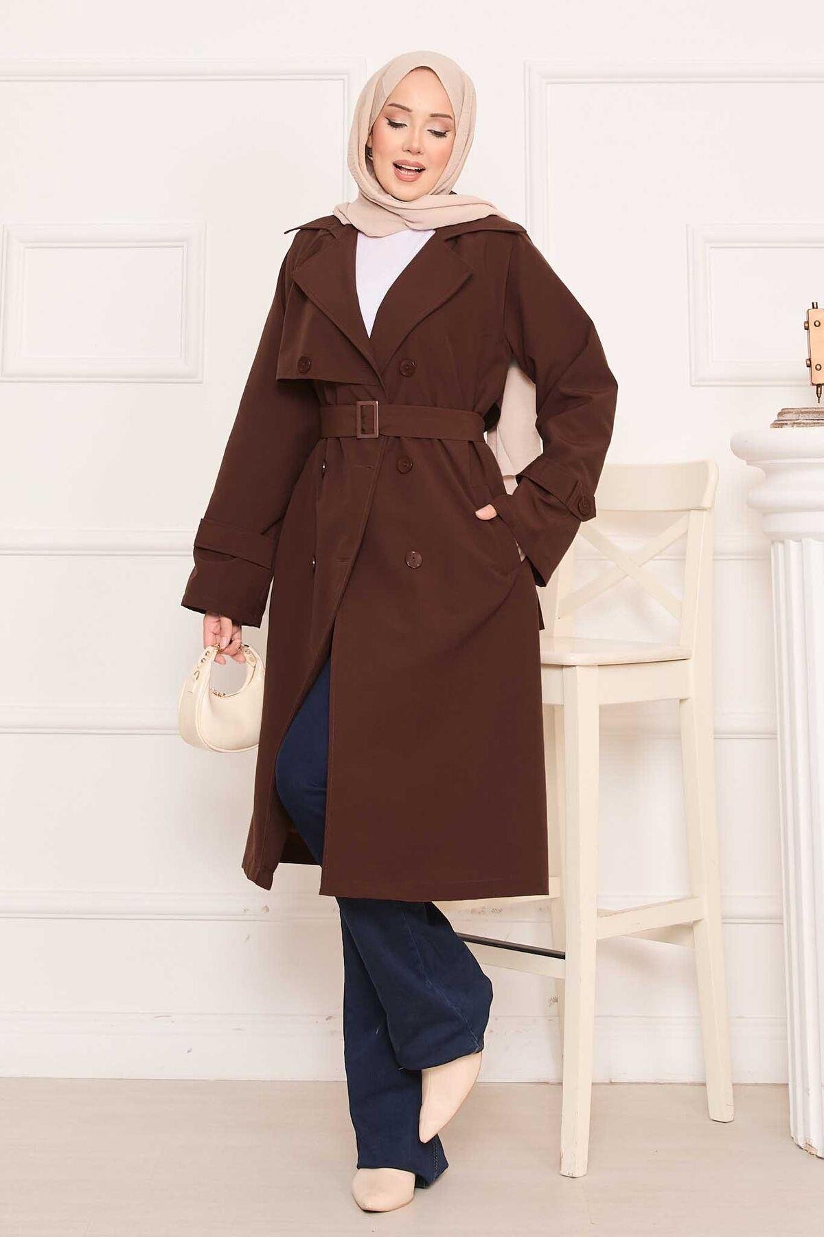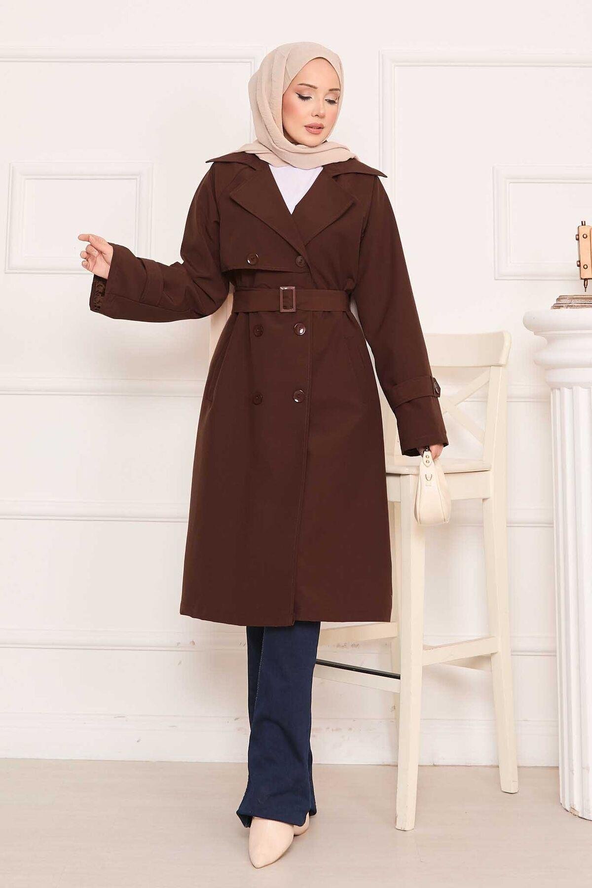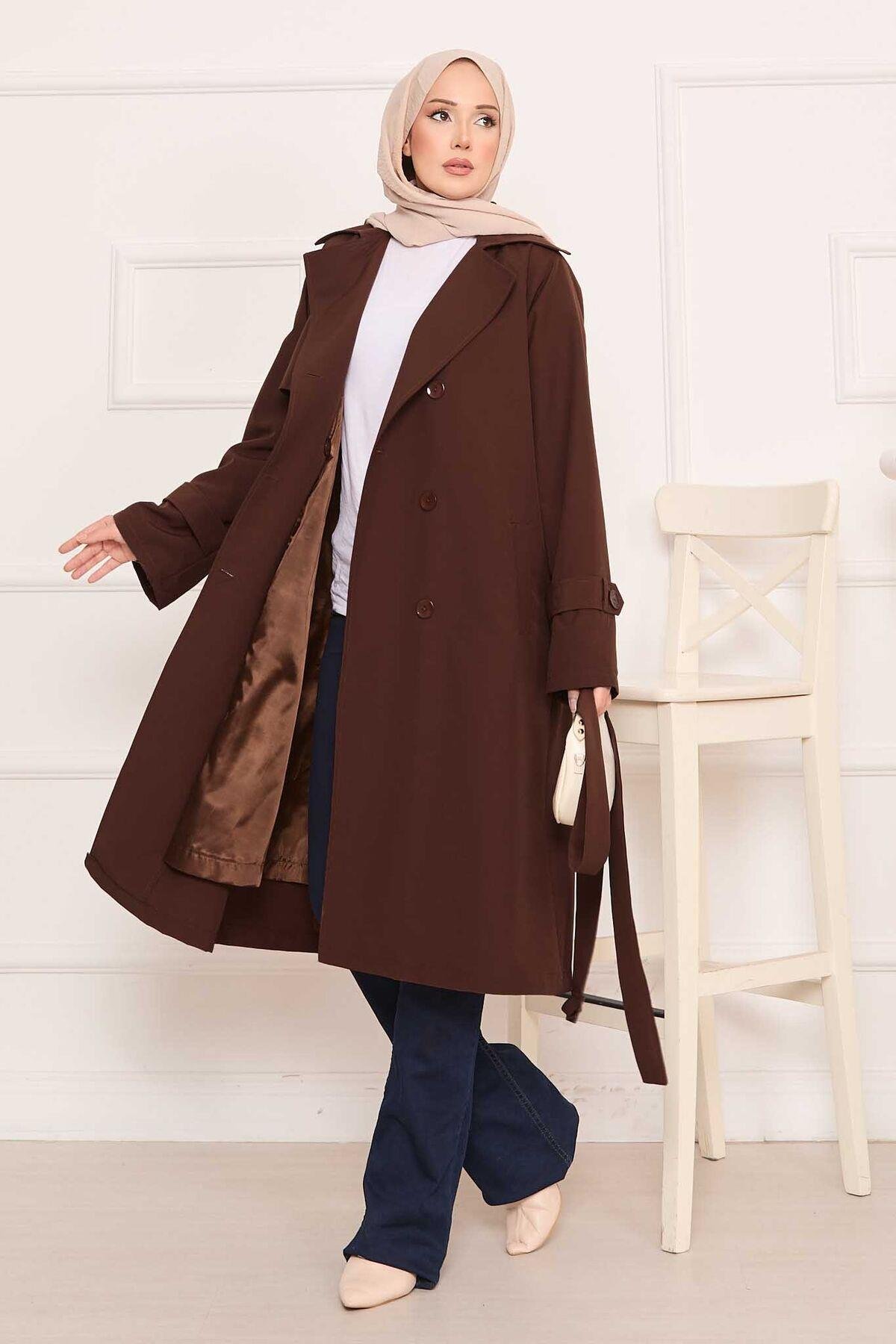 Removable Belted Hijab Trench Coat with Button Detail on the Back, Brown (125M01921181R2538)