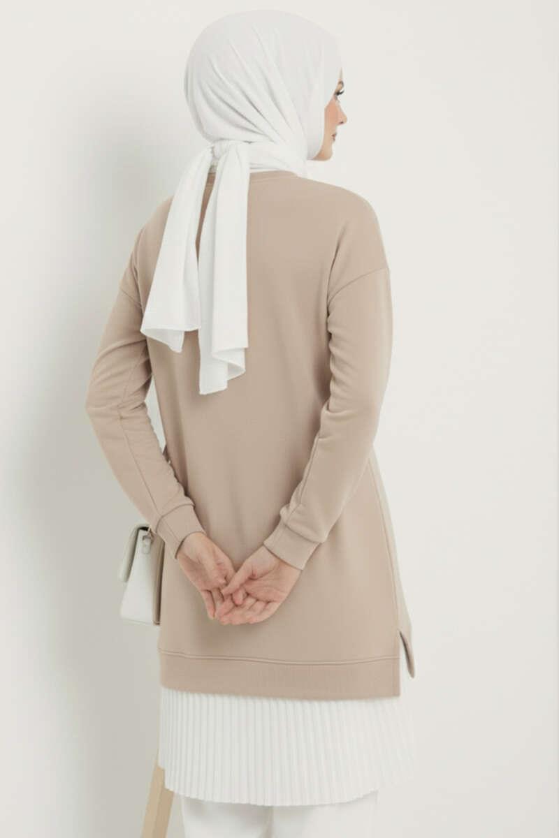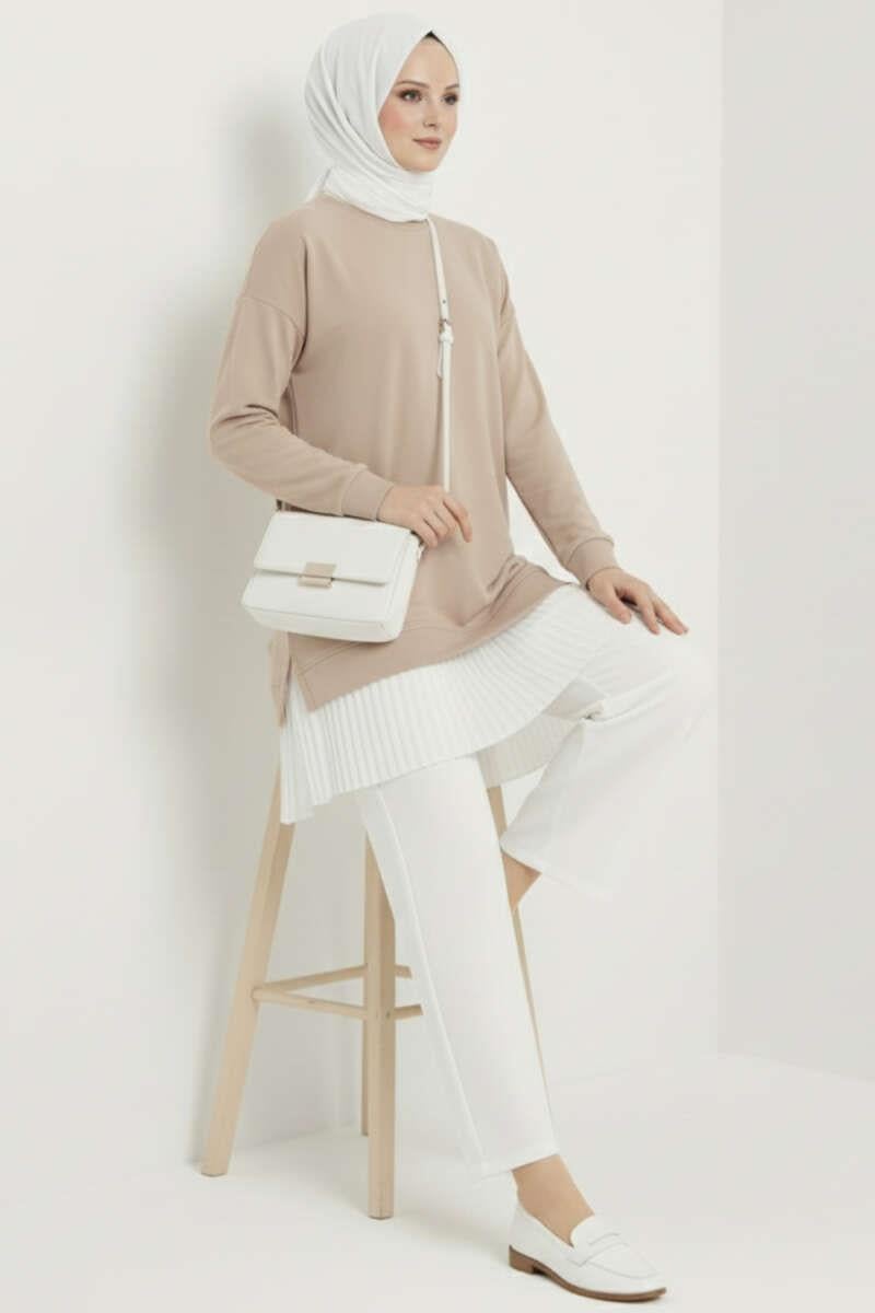Pleated Tunic with Emblem and Lower Skirt, Beige
