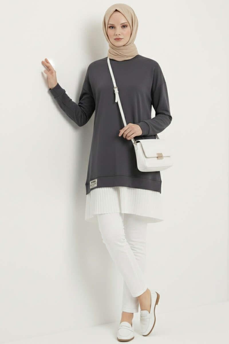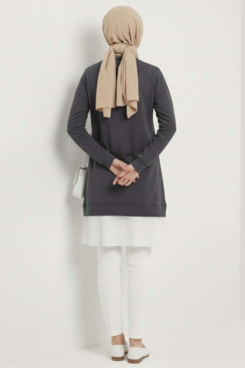 Pleated Tunic with Emblem and Lower Skirt, Smoke Color