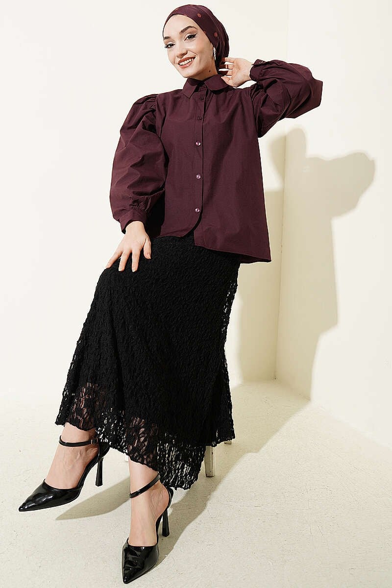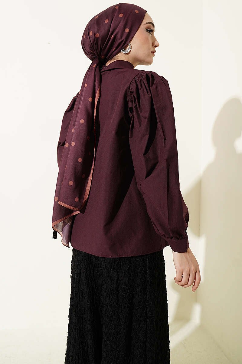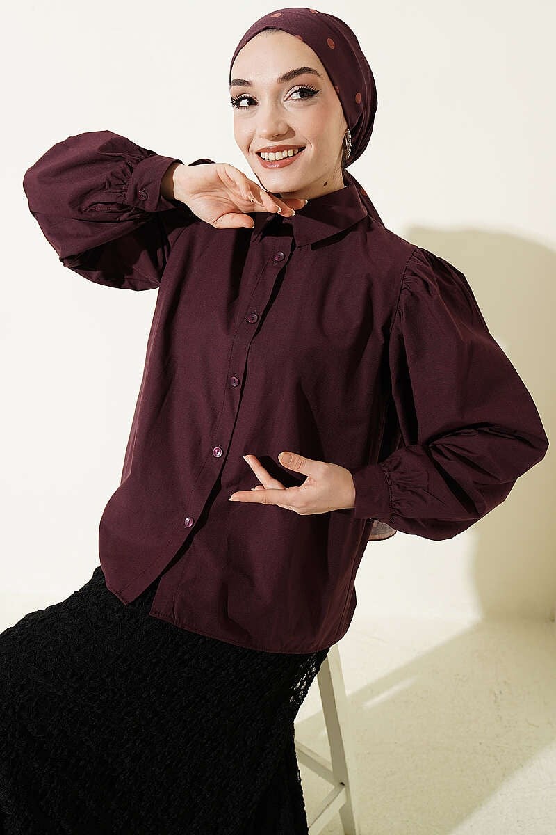 This shirt combines a classic collar form with a voluminous balloon sleeve design, offering a modern and bold silhouette. Its flowing structure starting from the shoulders and the cuff details add a sophisticated touch to the design while maximizing freedom of movement. Thanks to its short and basic cut, this piece pairs perfectly with high-waisted skirts and trousers, effortlessly elevating your everyday style. With its minimalist button details and timeless look, it offers versatile use for both office style and special occasions. Model Information: Height: 162 cm, Chest: 82 cm, Waist: 65 cm, Hips: 90 cm. The product on the model is size S/M.