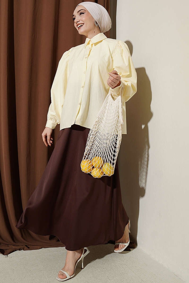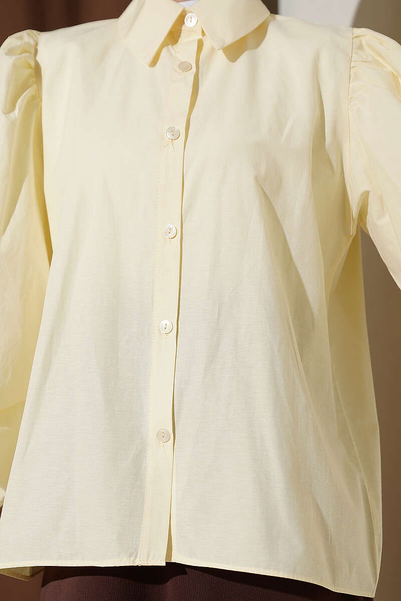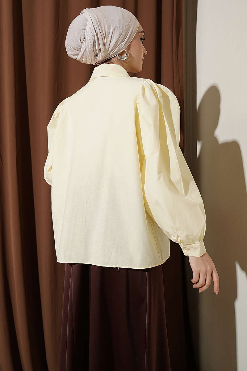 This shirt combines a classic collar form with a voluminous balloon sleeve design, offering a modern and bold silhouette. Its flowing structure starting from the shoulders and the cuff details add a sophisticated touch to the design while maximizing freedom of movement. Thanks to its short and basic cut, this piece pairs perfectly with high-waisted skirts and trousers, effortlessly elevating your everyday style. With its minimalist button details and timeless look, it offers versatile use for both office style and special occasions. Model Information: Height: 162 cm, Chest: 82 cm, Waist: 65 cm, Hips: 90 cm. The product on the model is size S/M.