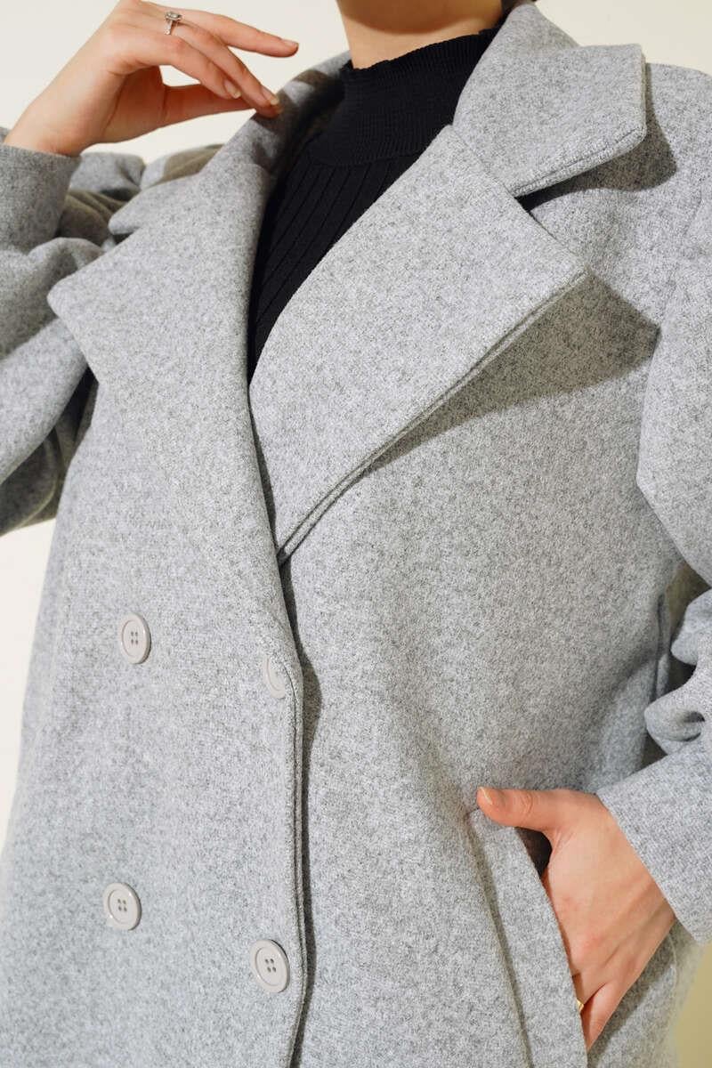 The new season cashmere coat is a balloon sleeve model. Our coat has a double-breasted collar . Our coat has five buttons in total, four on the front and one inside. Our coat is belted and does not have a belt loop. It is lined inside. Pockets can be used. Our coat will both add elegance to your elegance and warm you up.