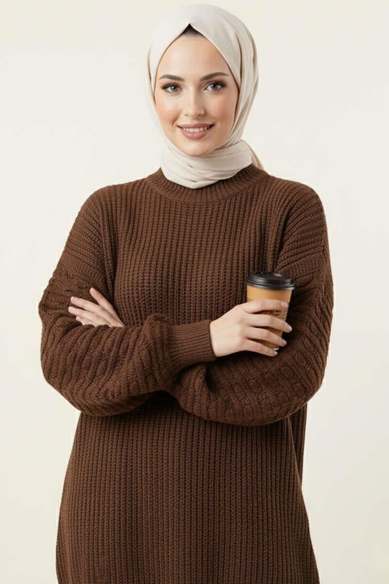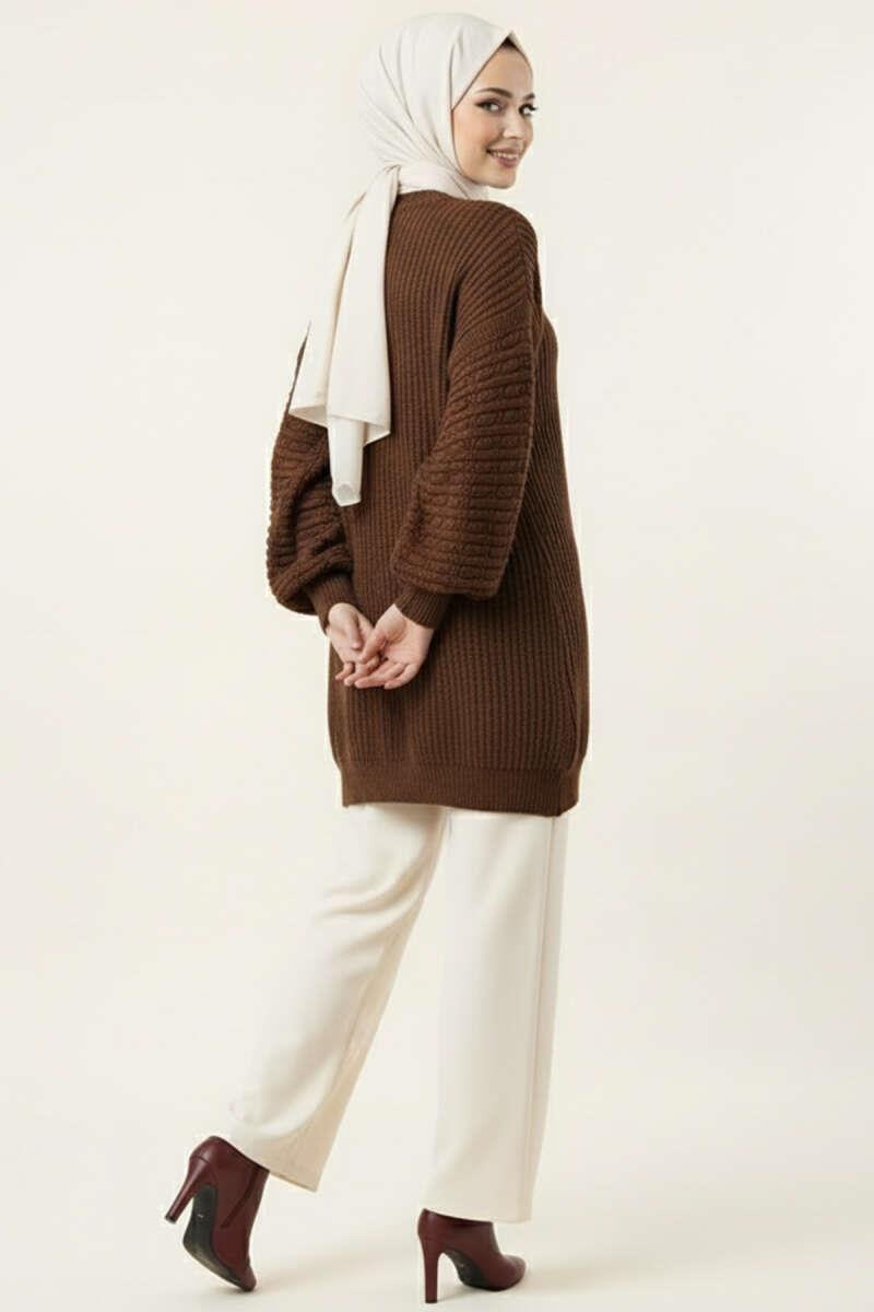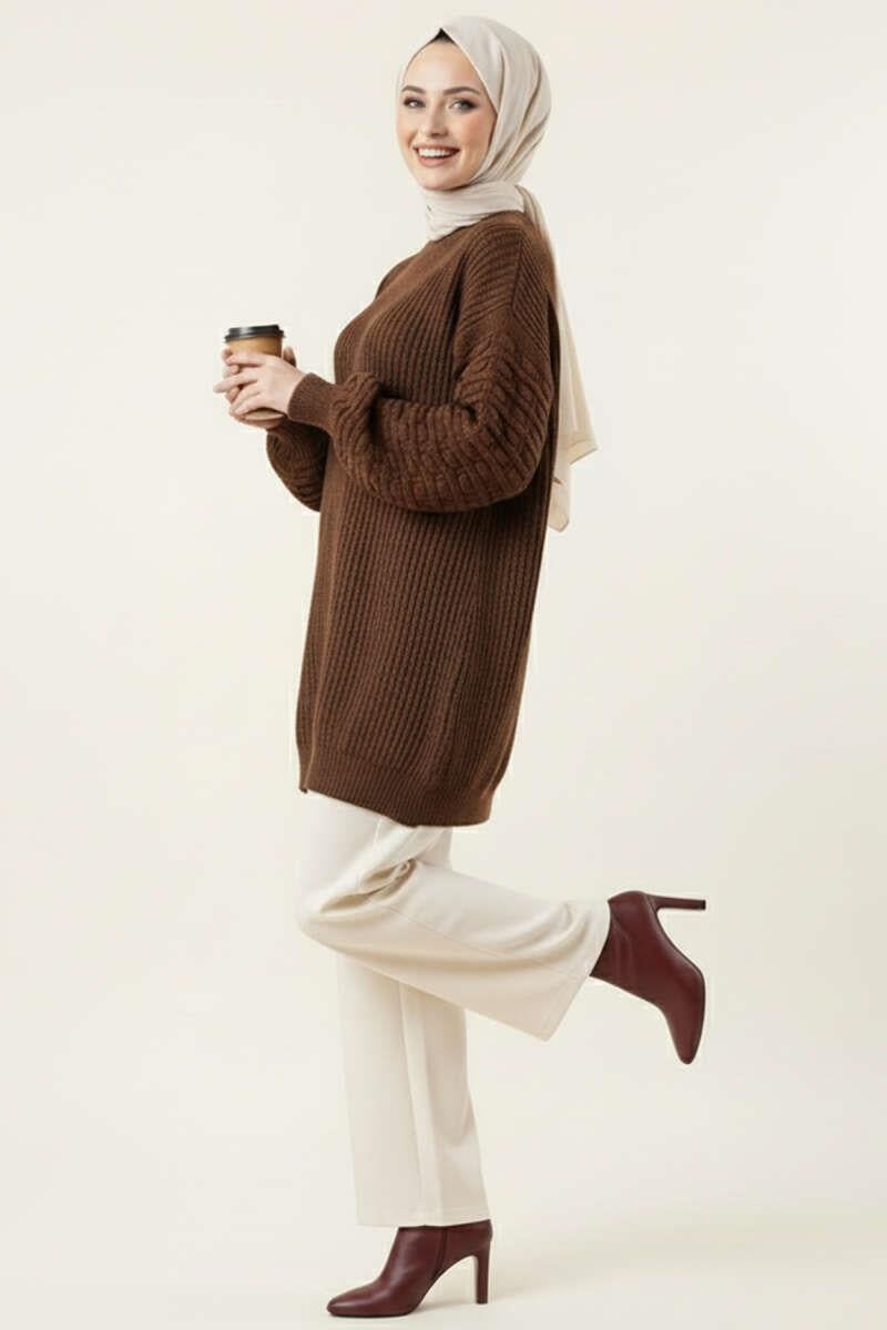 Balloon Sleeve Embossed Knit Tunic Brown (0875-2893-683578)