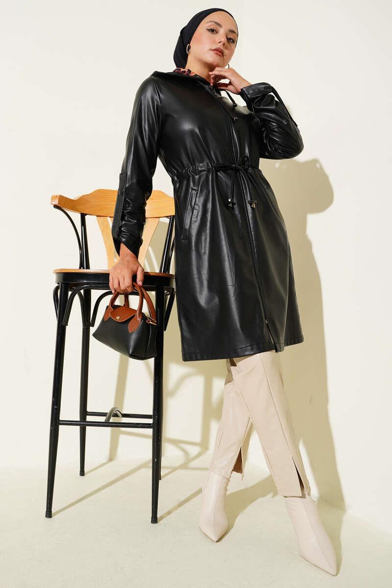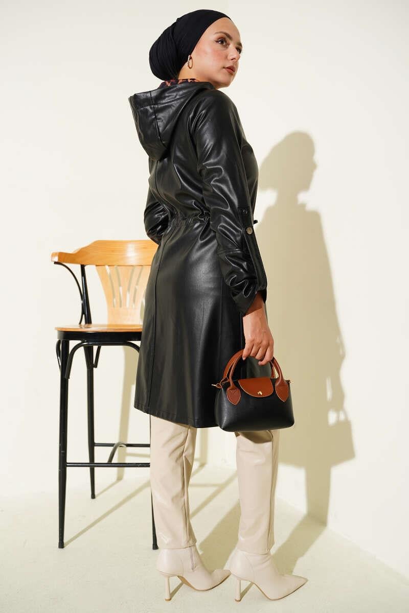 Waist Tunnel Hooded Leather Trench Coat Black (0428-2068-673803)