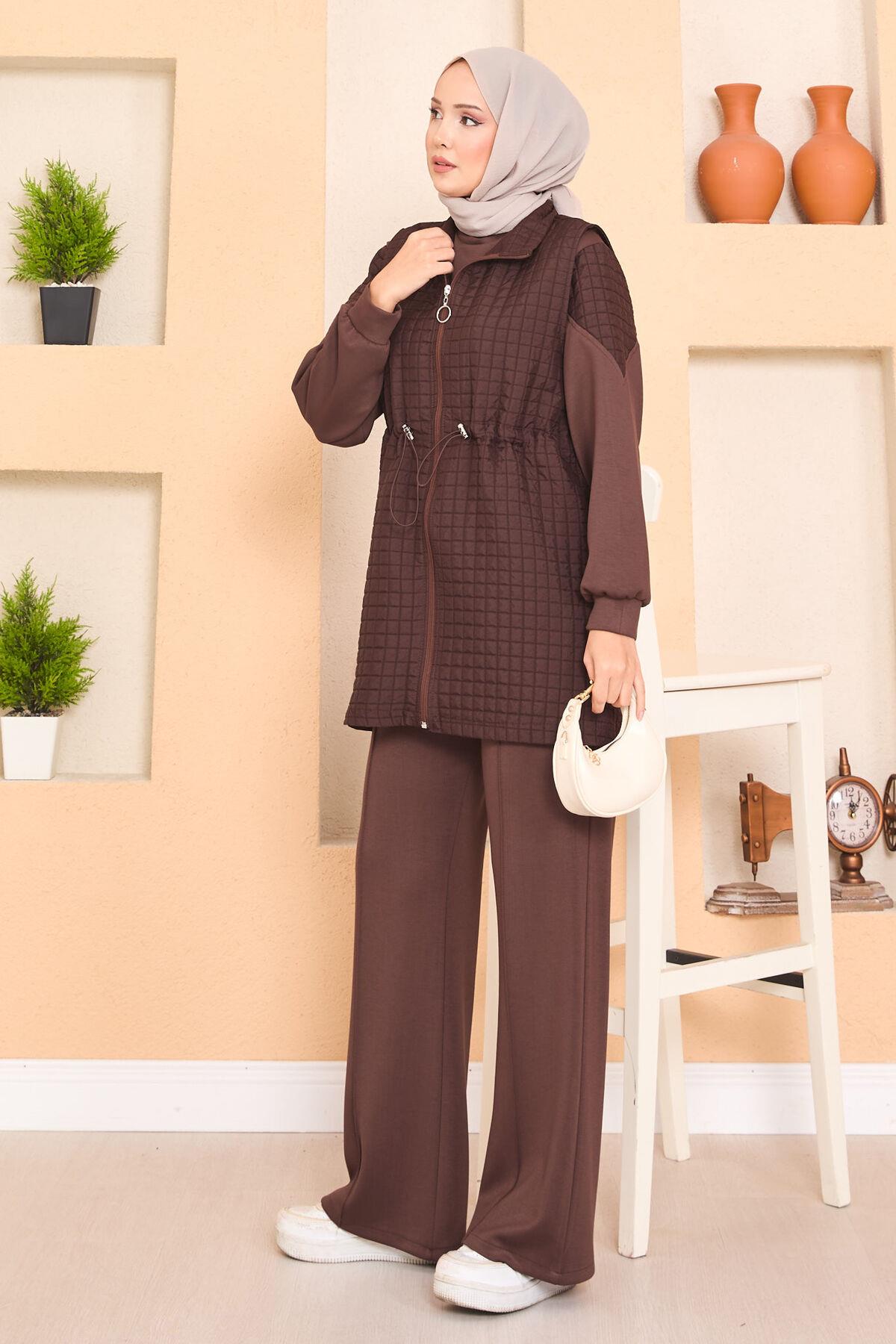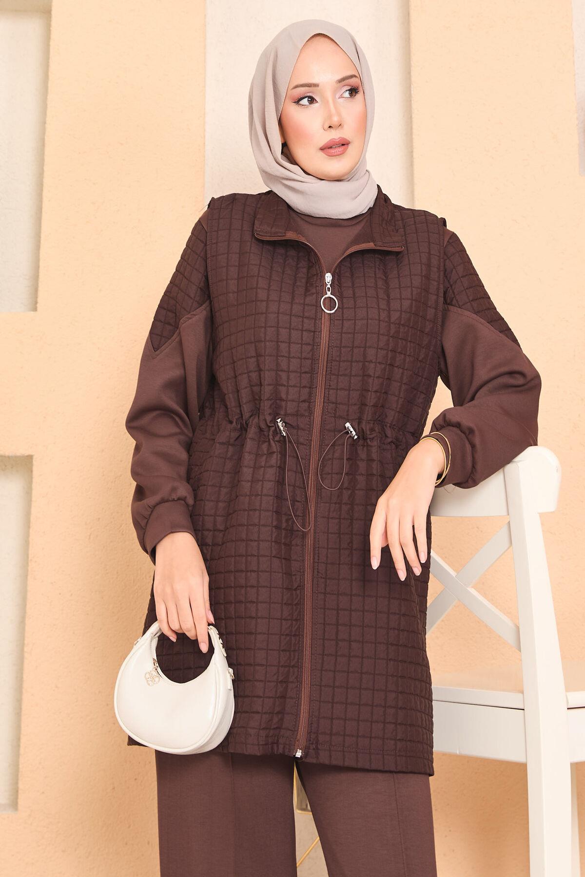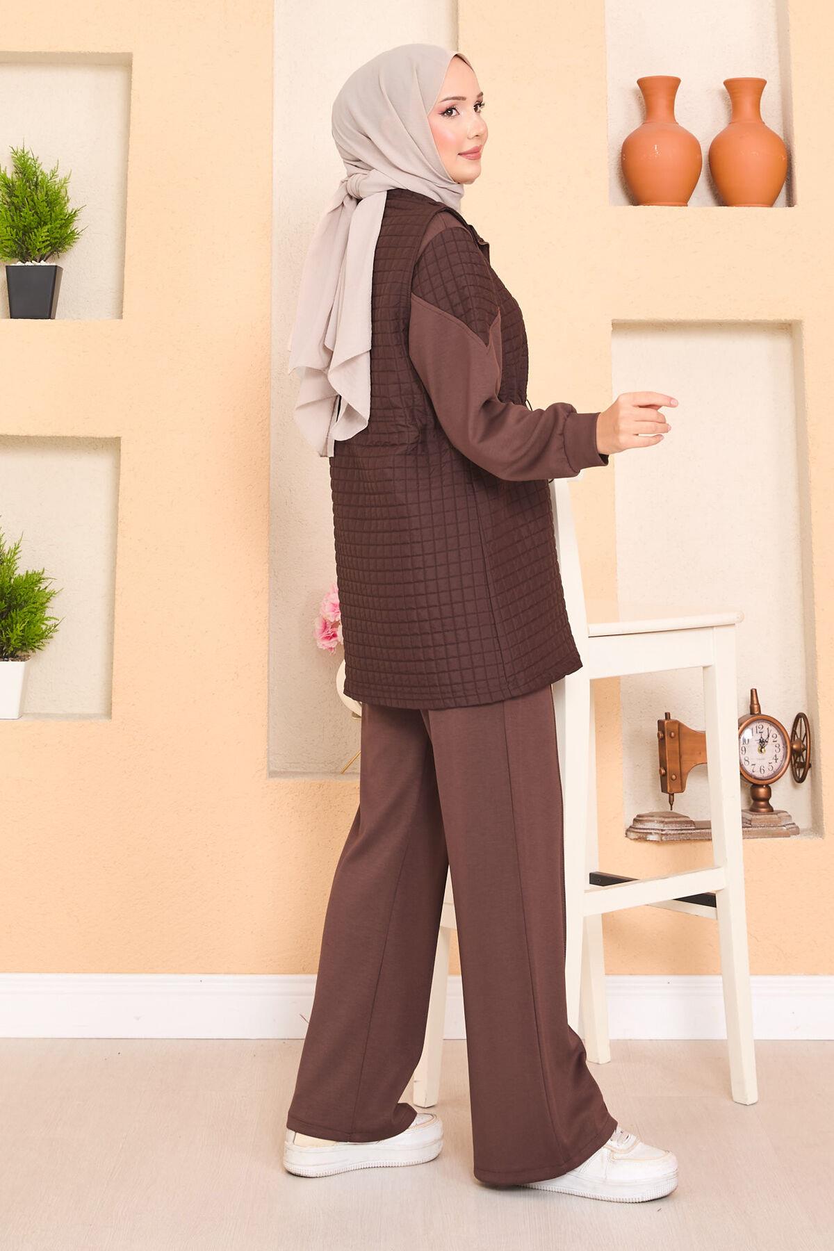 Adjustable Waist Quilted Vest Three-Piece Hijab Suit Brown (125M01721191R2538)