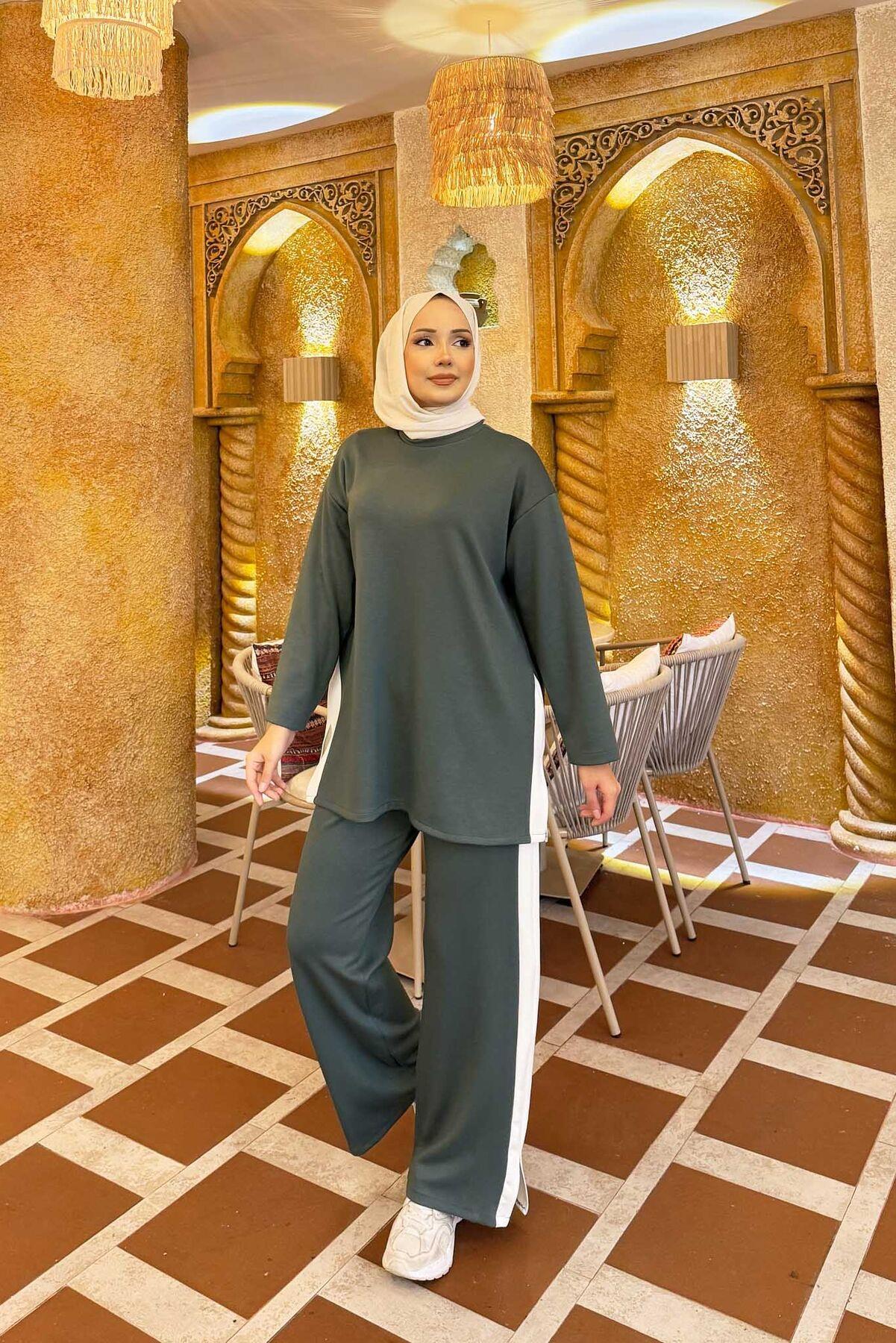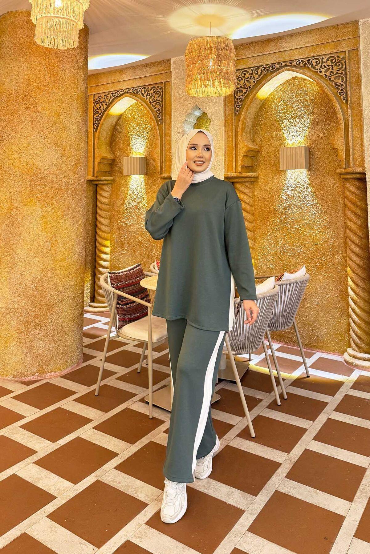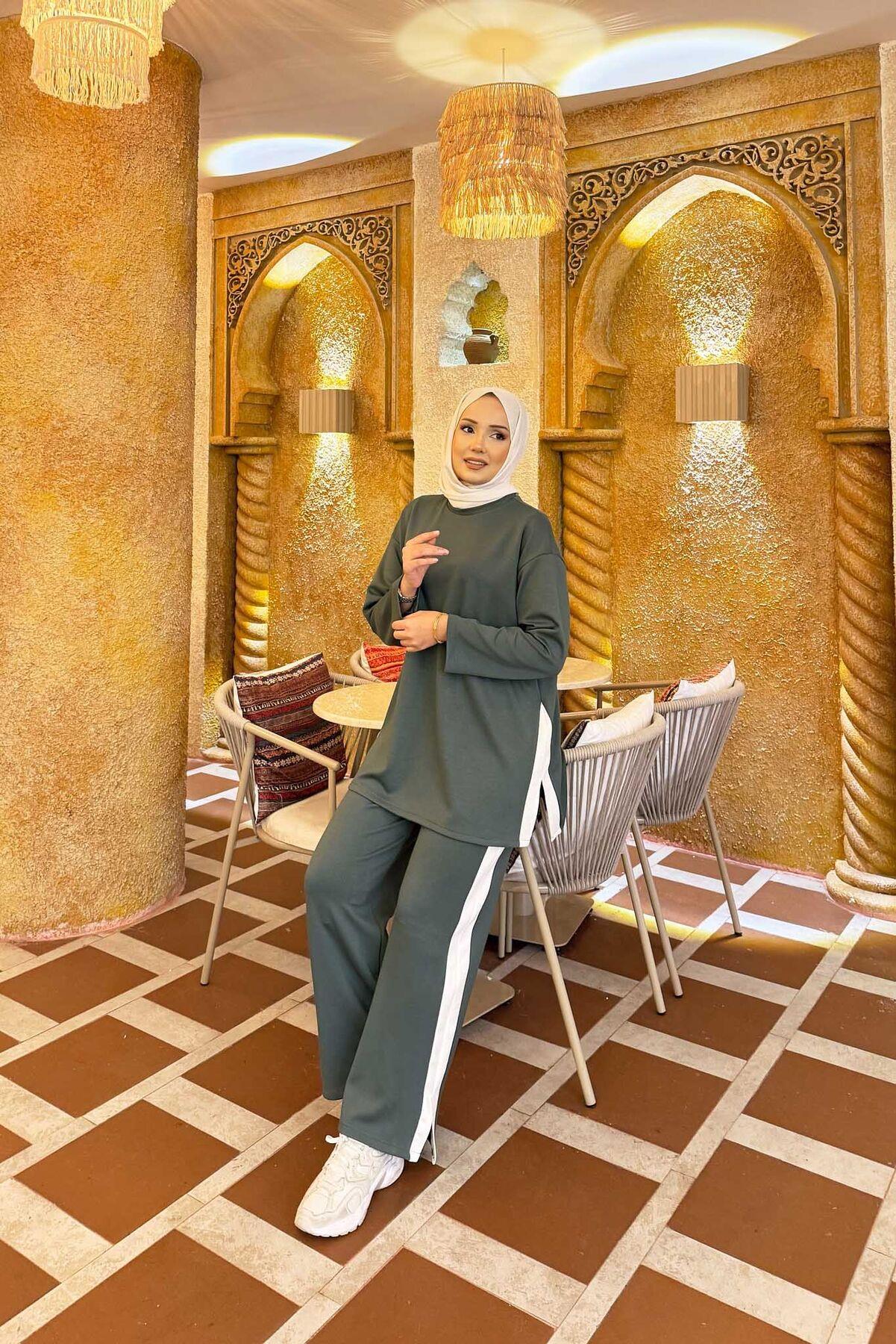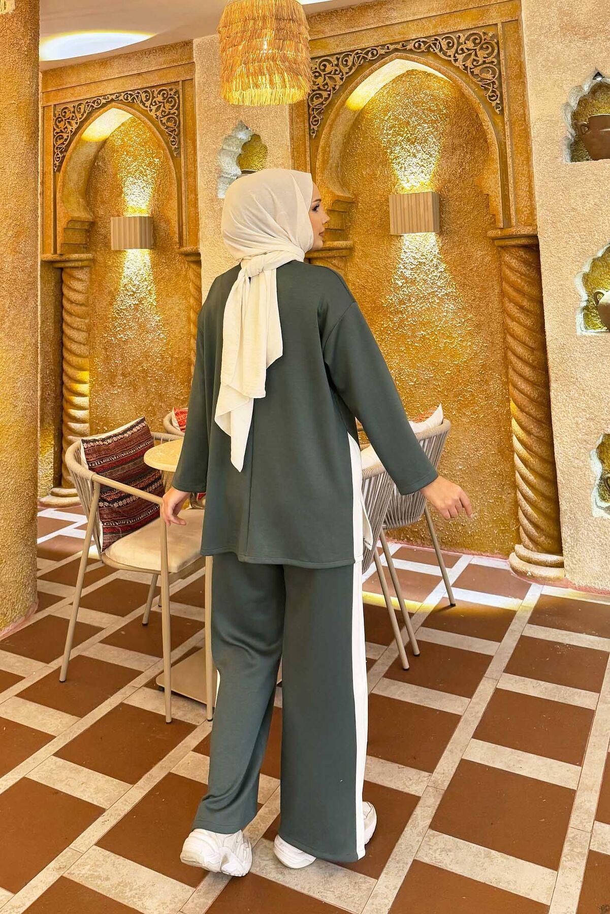 White Striped Slit Detailed 2 Piece Set, Almond Green (125M00621187R821)