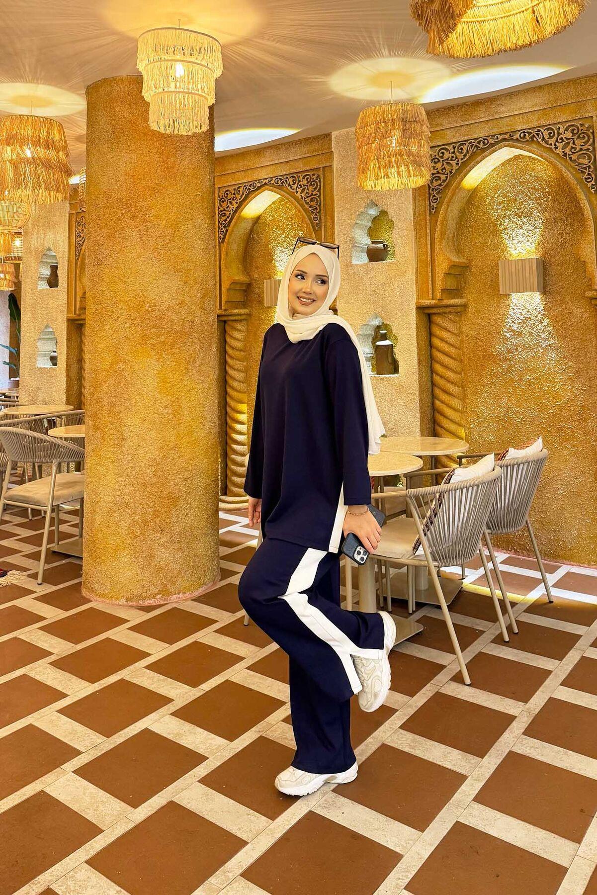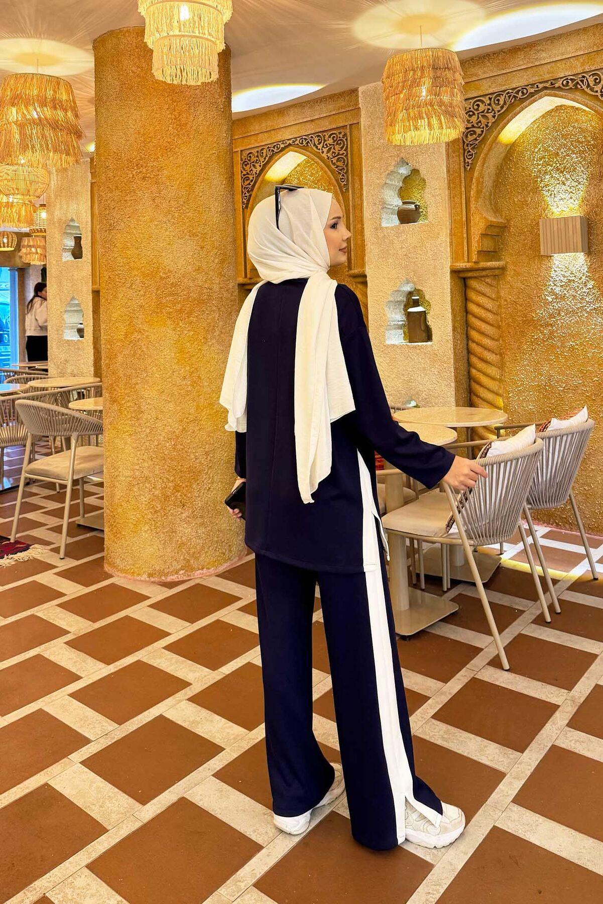 White Striped Slit Detailed 2 Piece Set Navy Blue (125M00621187R331)