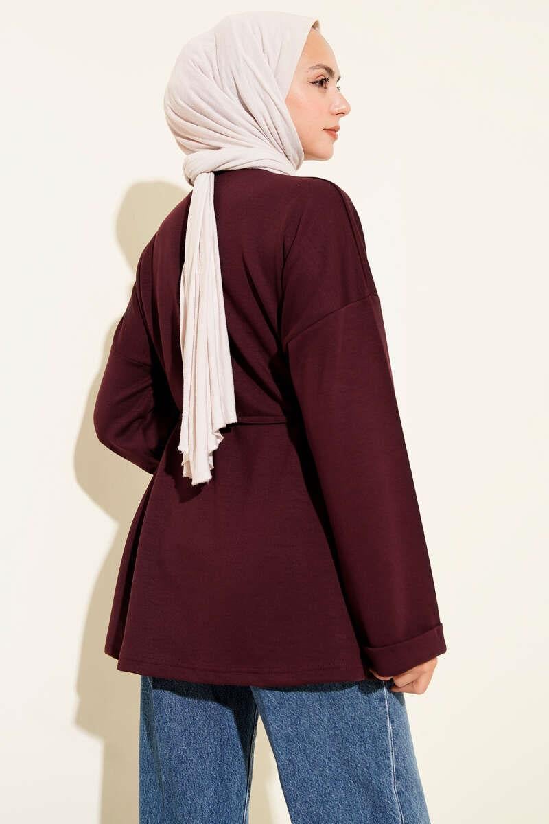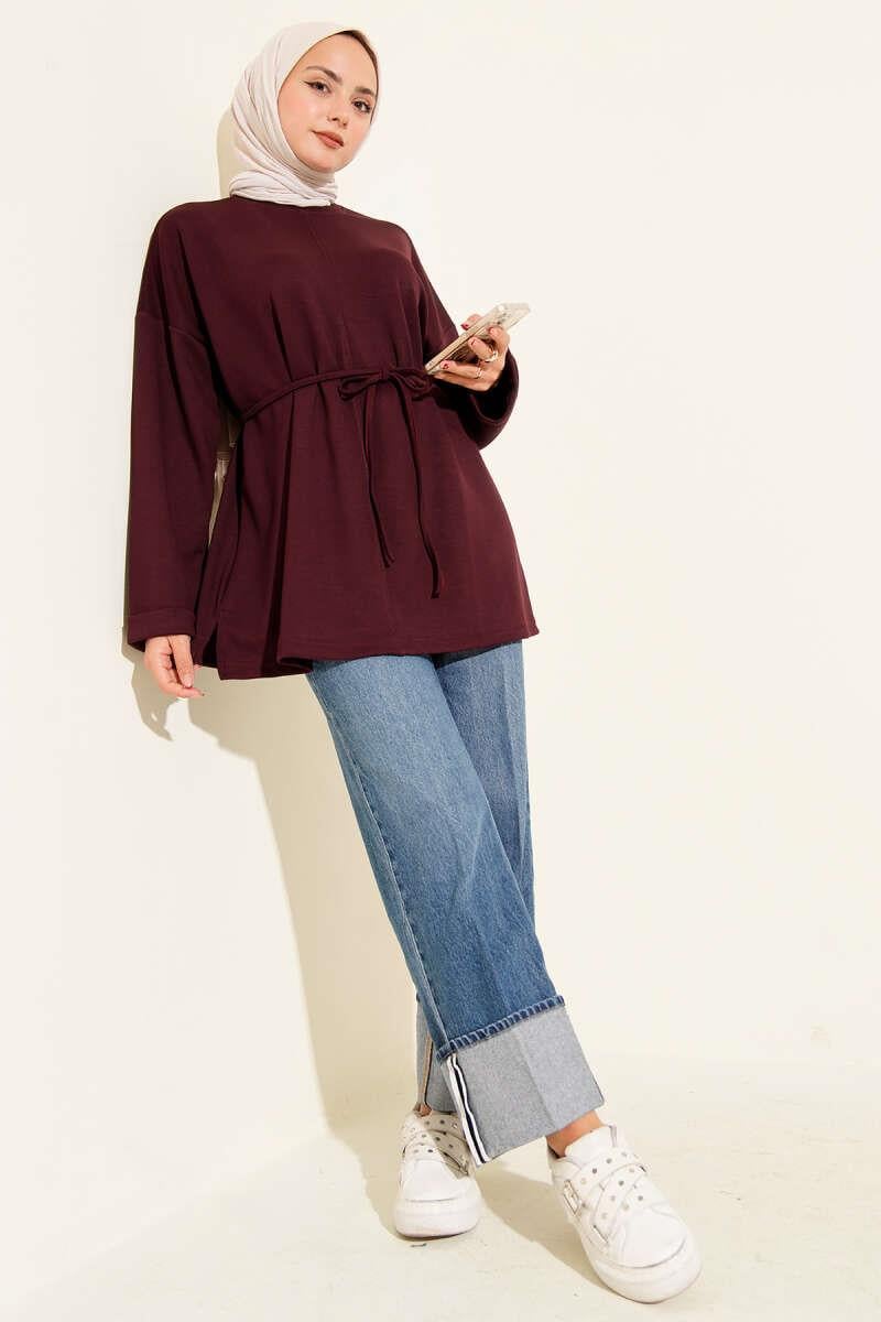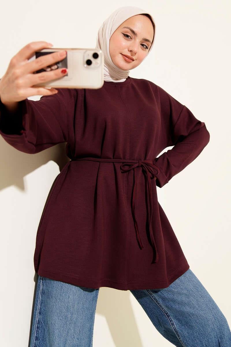 Crew Neck Rope Belted Tunic Burgundy ( 0753-2929-678848)
