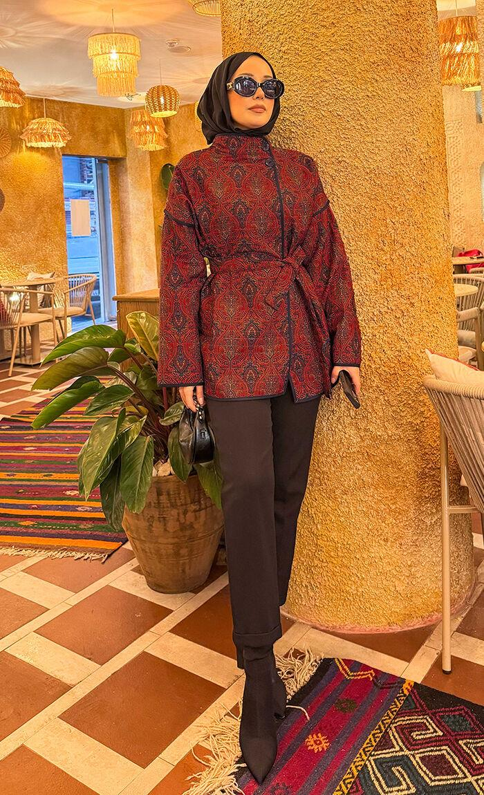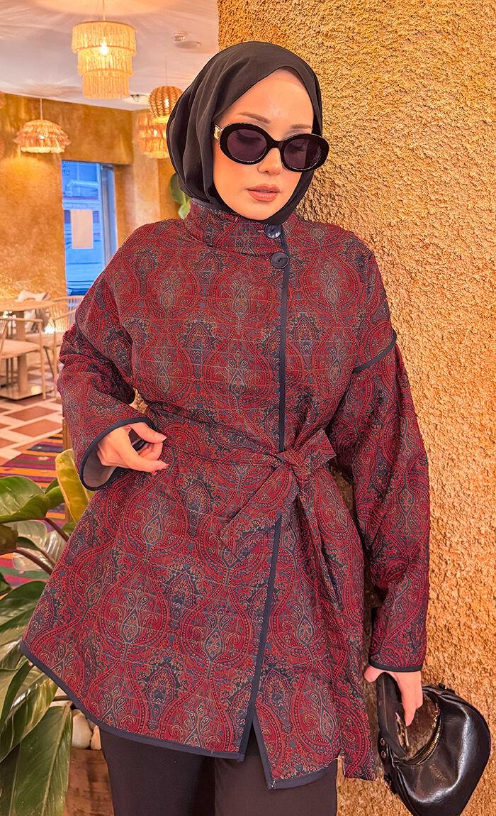 • The product is in Autumn & Winter fashion. It has a removable belt and button detail on the collar. Ethnic patterned quilted jacket.