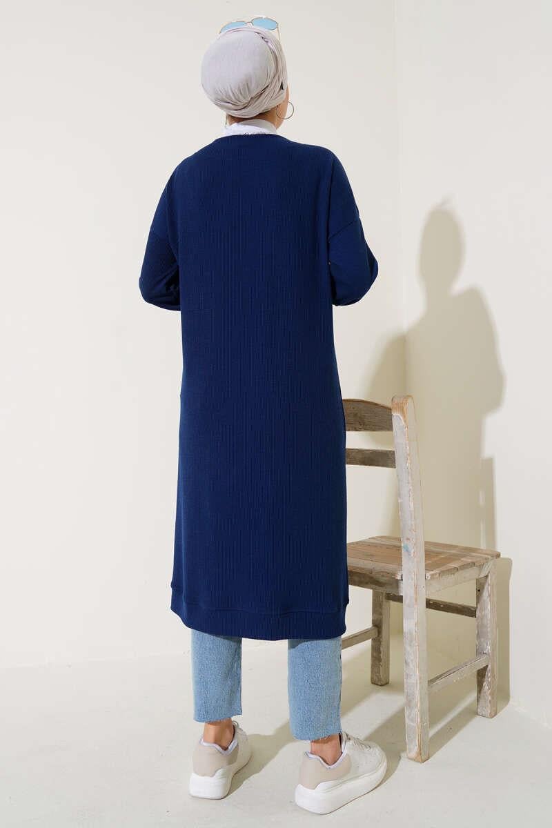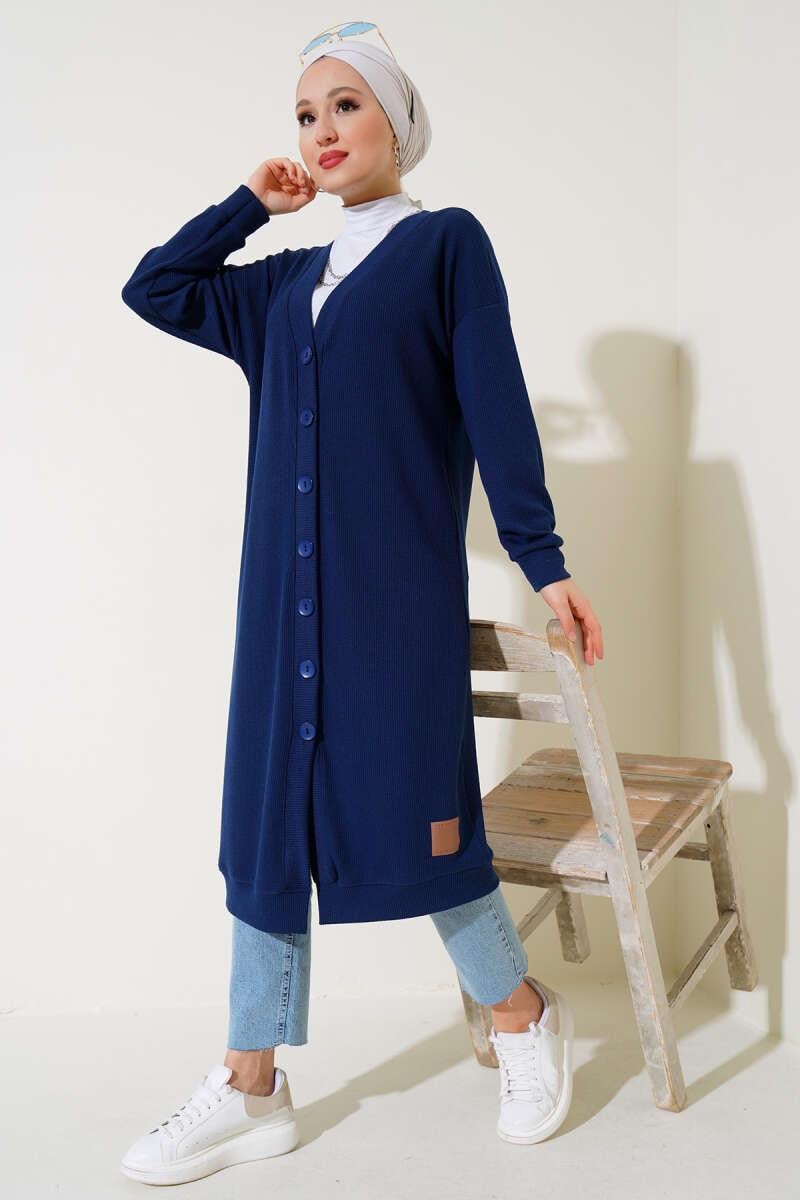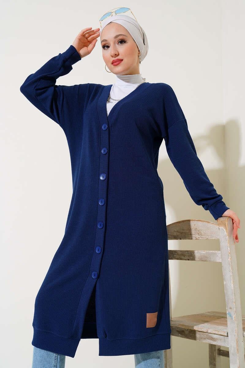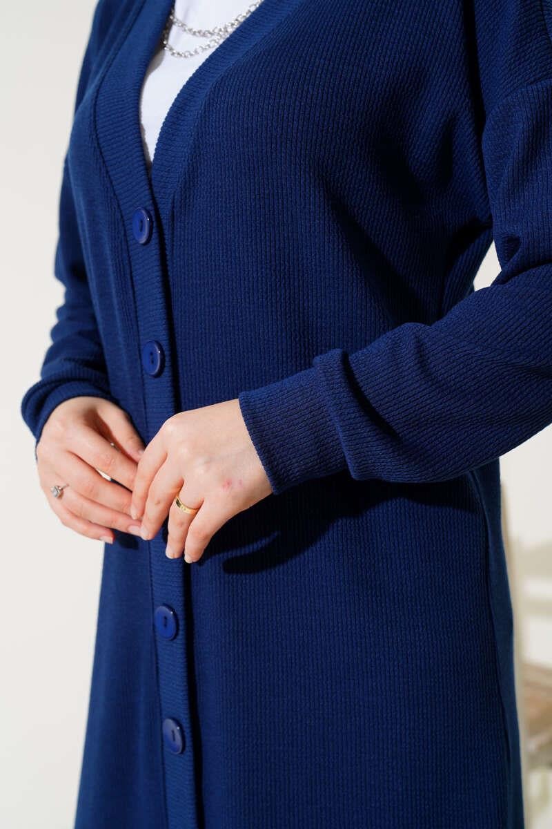 Buttoned Ribbed Long Cardigan Navy Blue (0319-1011-581313)