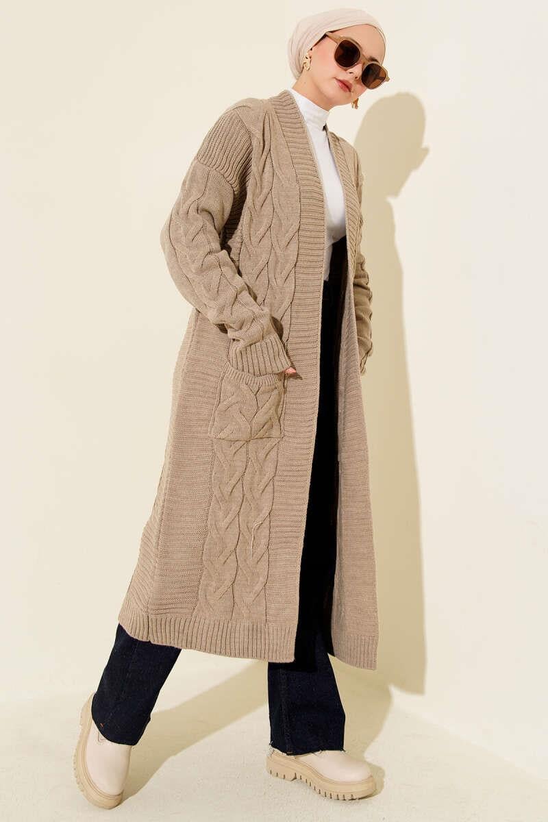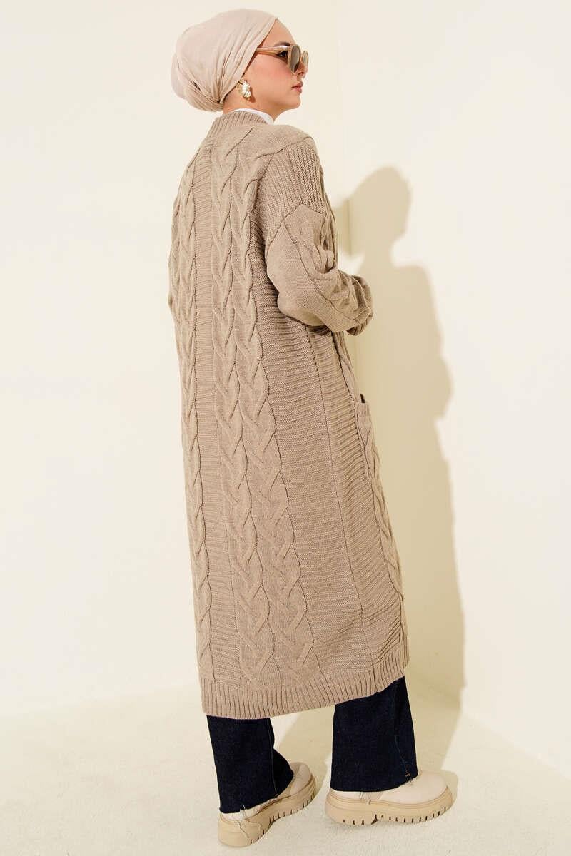 Knitted Patterned Long Mink Cardigan with Pockets (0875-2817-684463)