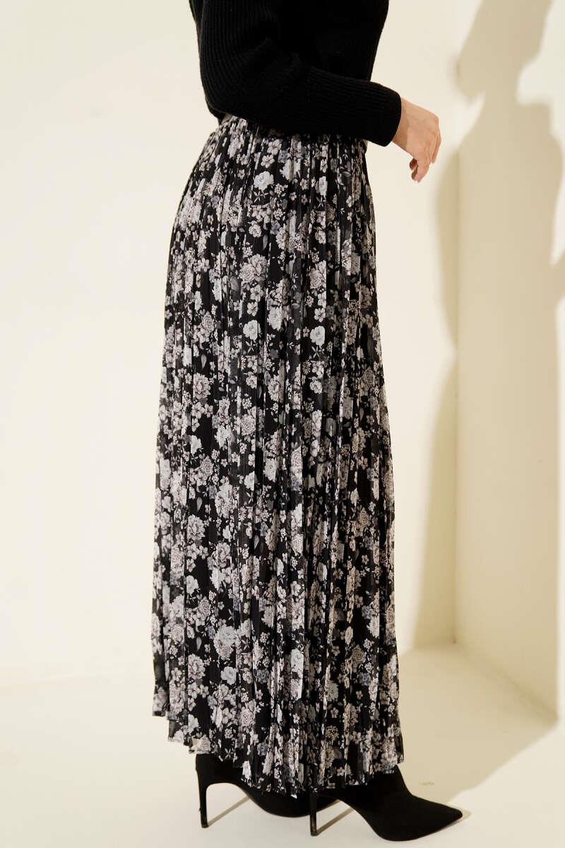 Floral Patterned Belted Pleated Skirt Black (0262-4408-711883)