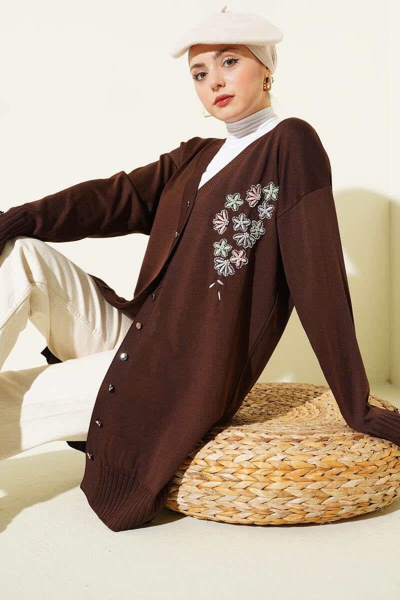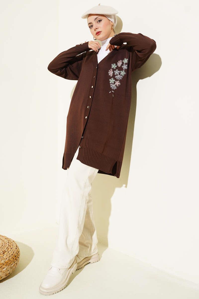 Floral Embroidered Buttoned Mercerized Cardigan Brown (6999-3280-696708)
