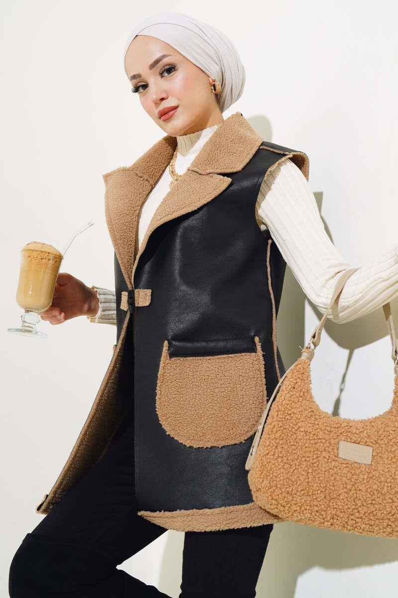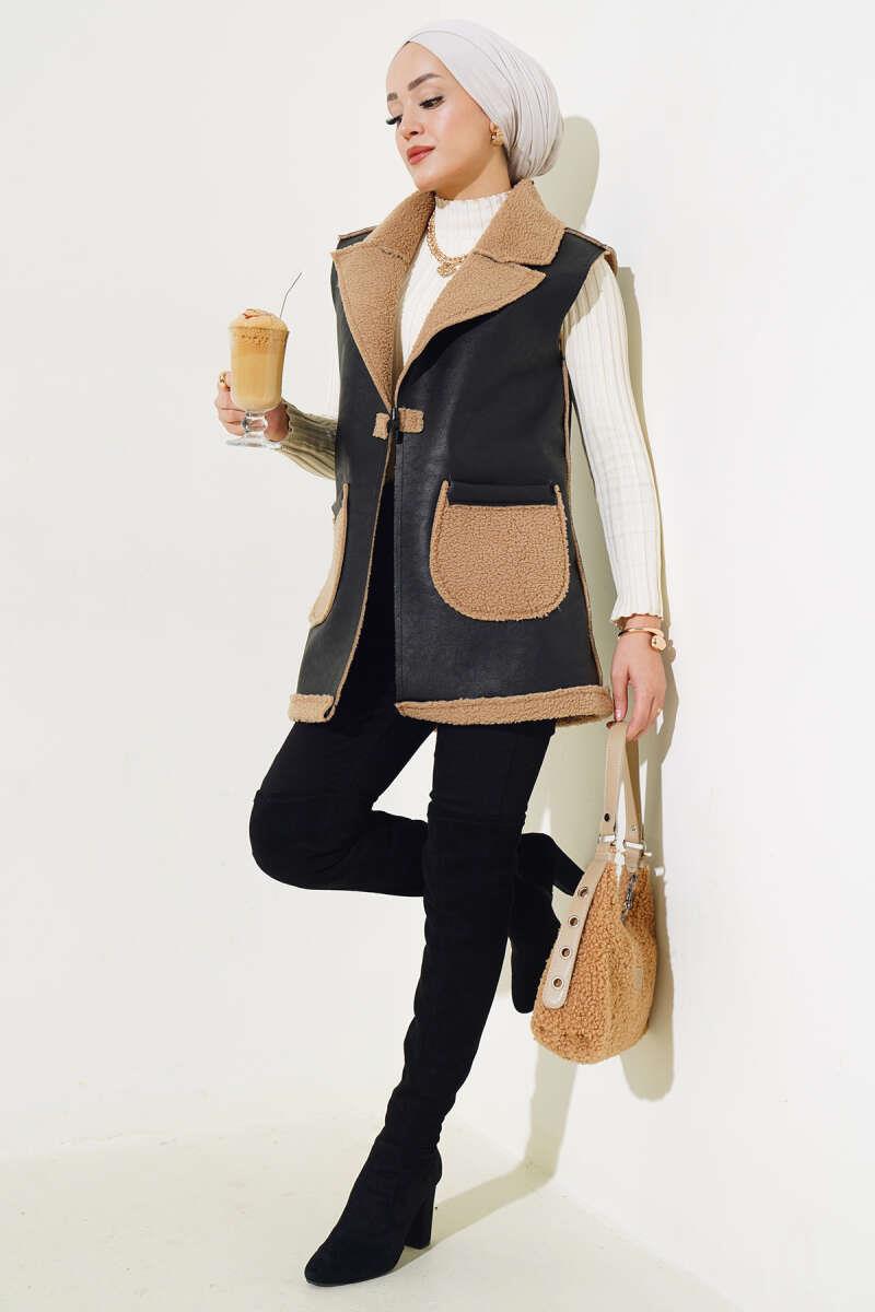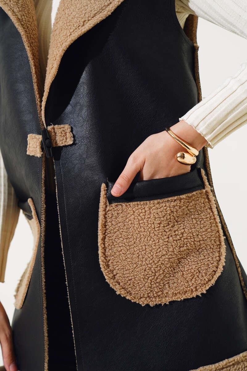 Double Pocket Fur Leather Vest Black Beige (8086-9023-572215)