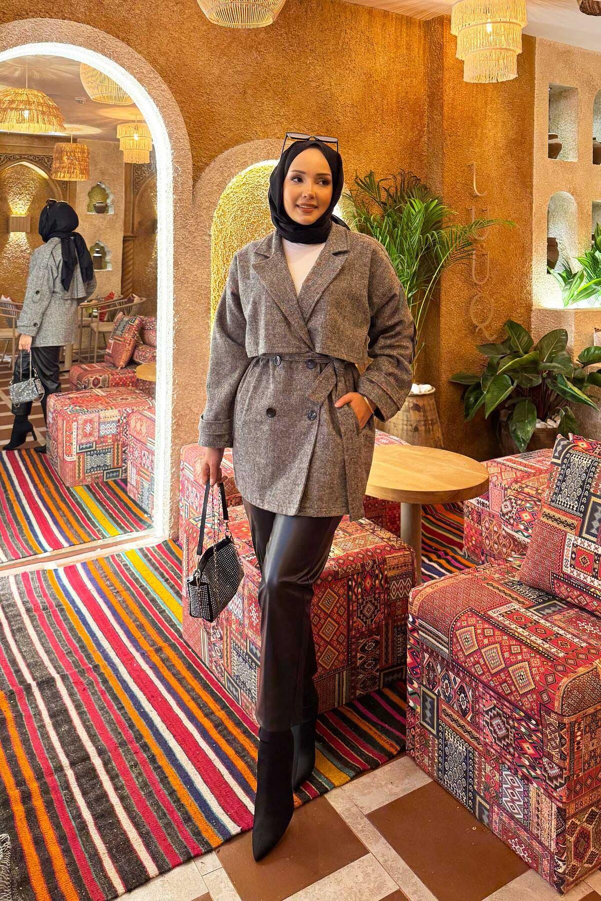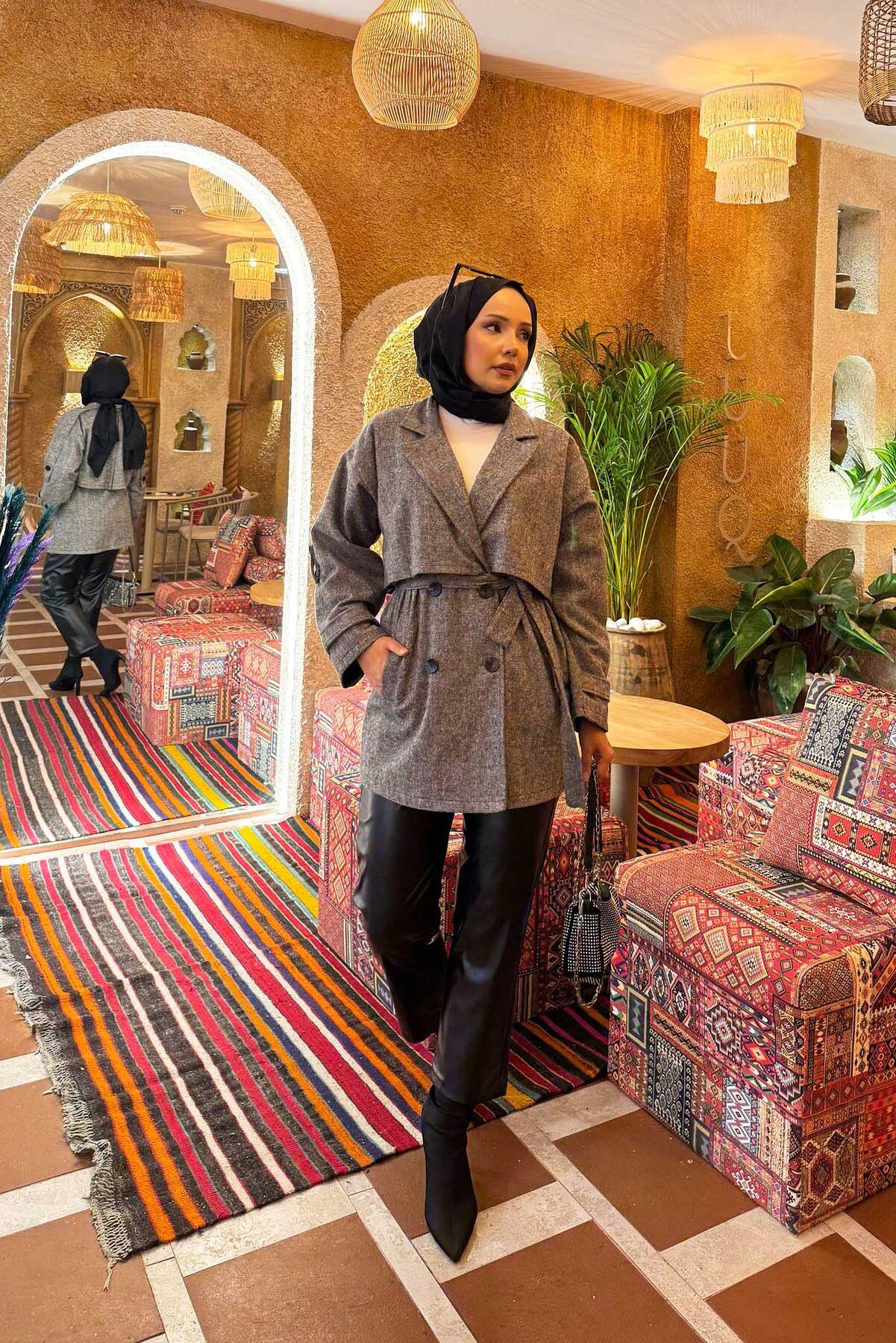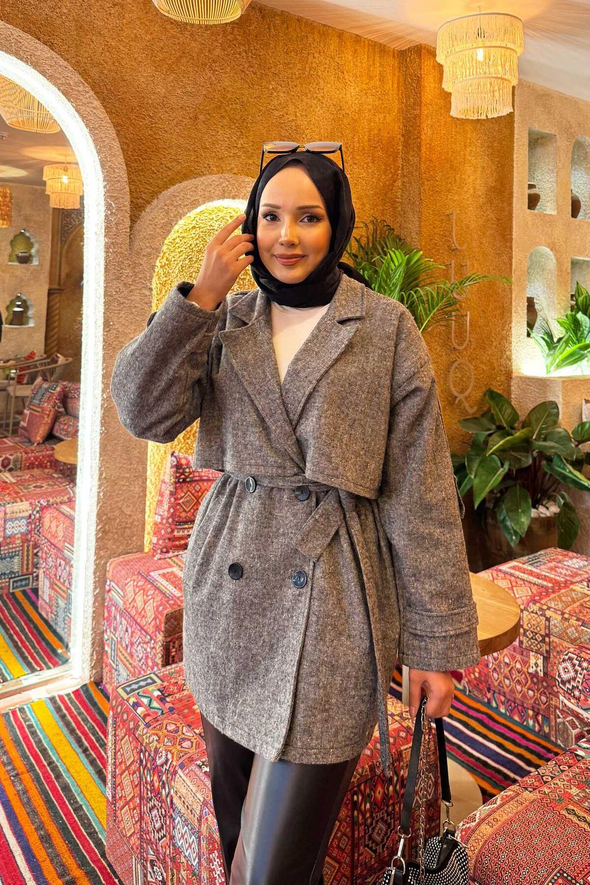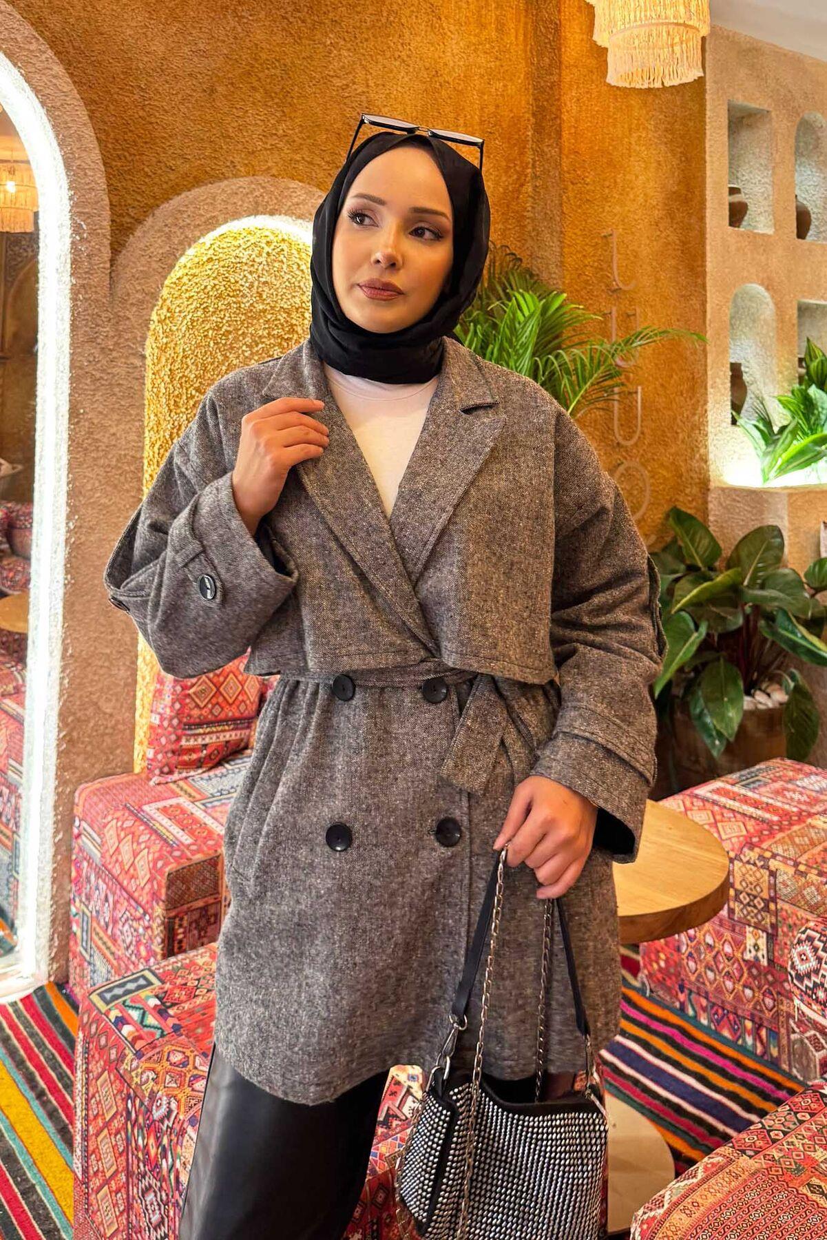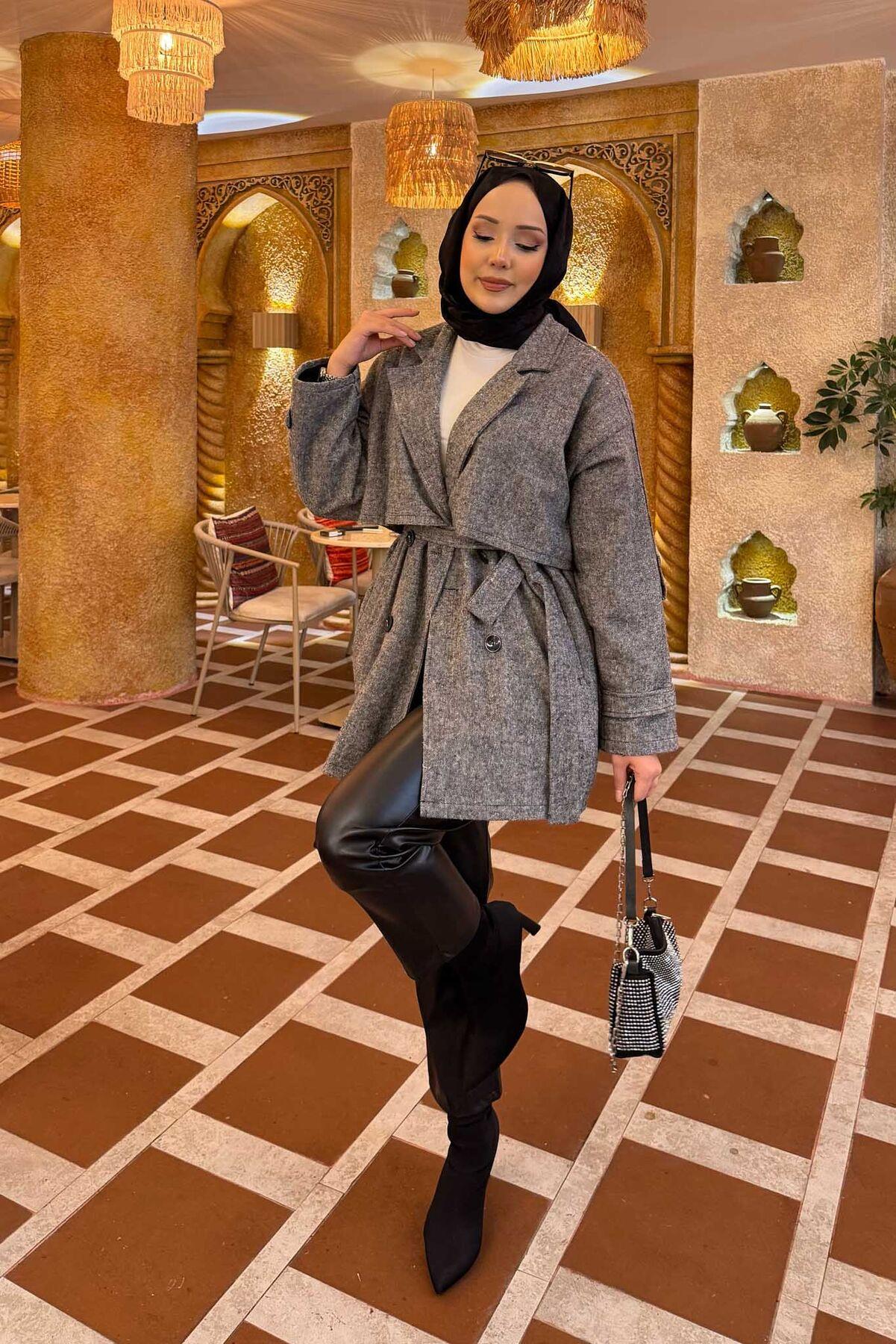 • The product is in Autumn & Winter fashion. It has side pockets with buttons in the front. It has a removable belt at the waist. It has aller detail. Lined trench coat with button details on the sleeve cuffs and shoulders