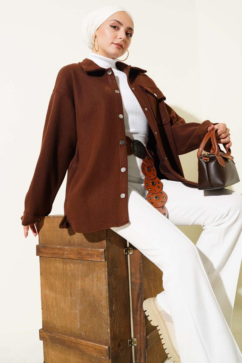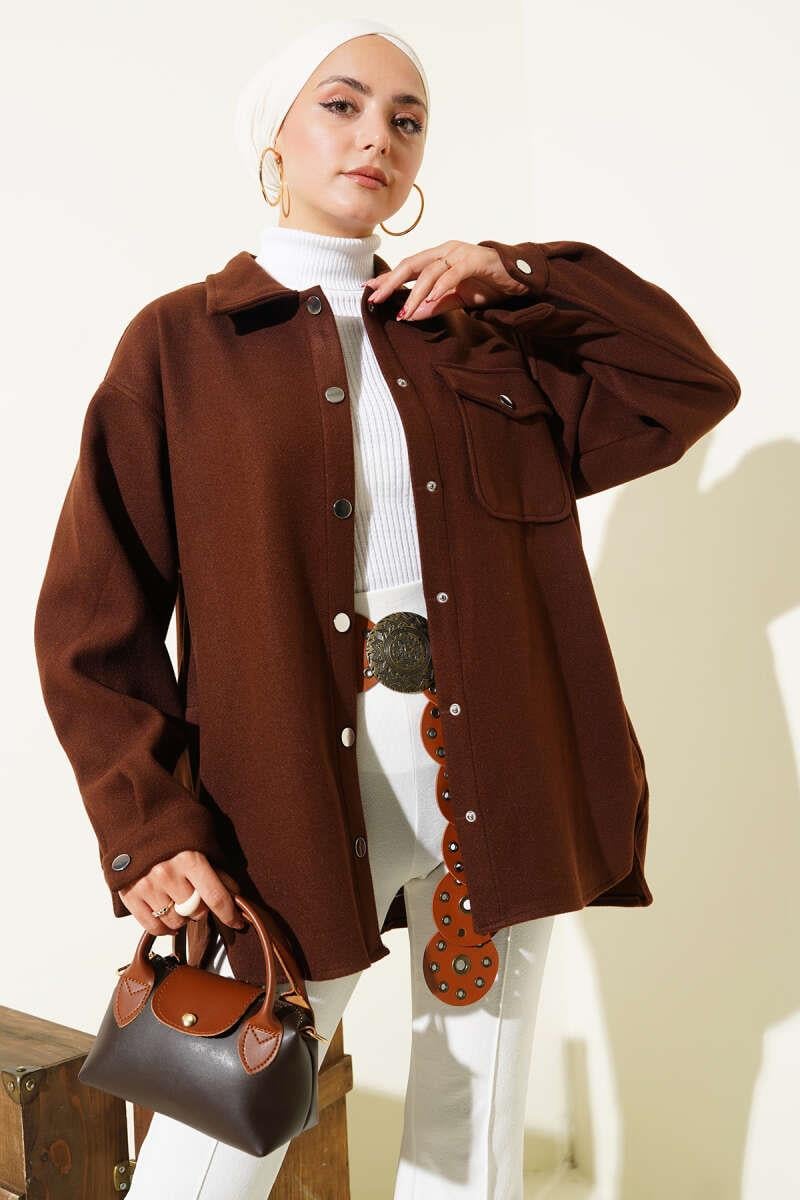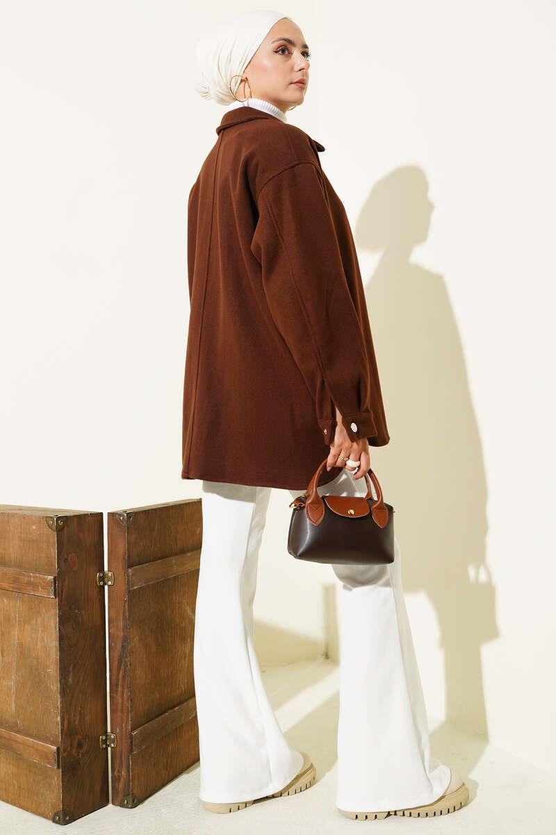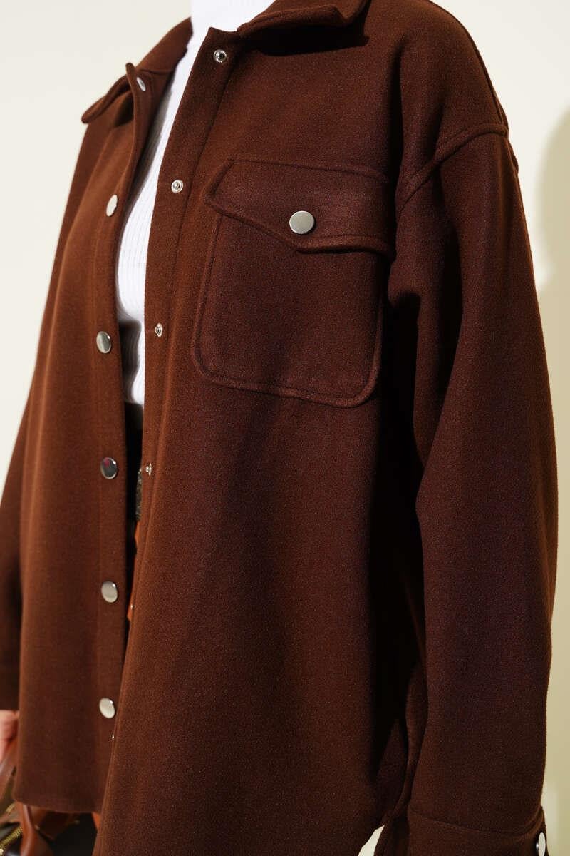 Snap Button Shirt Collar Cashmere Jacket Brown (0999-6446-678589)