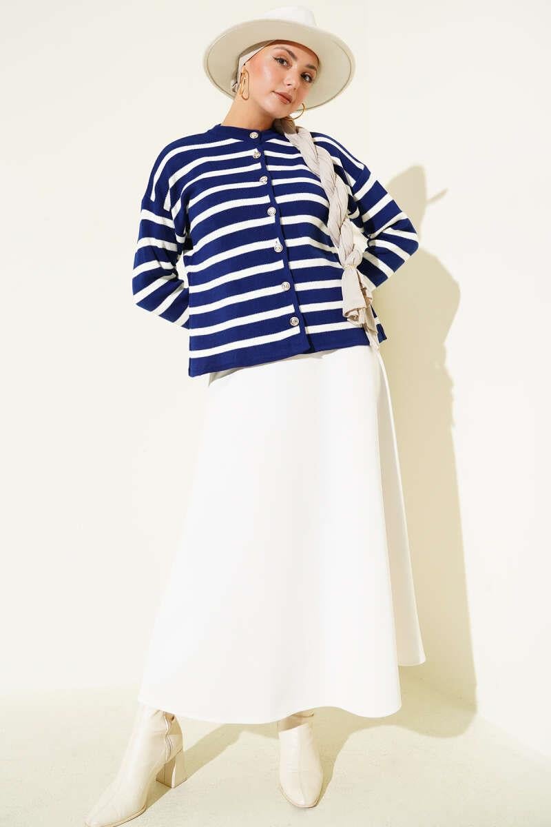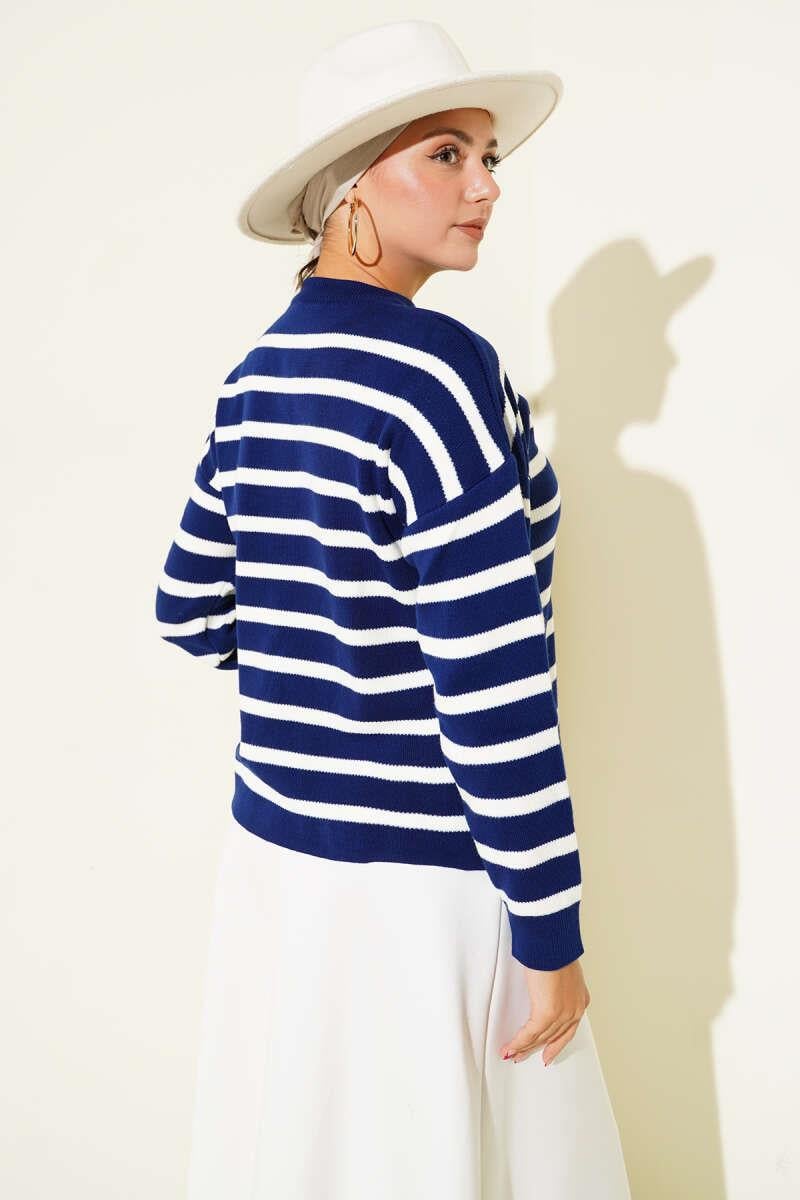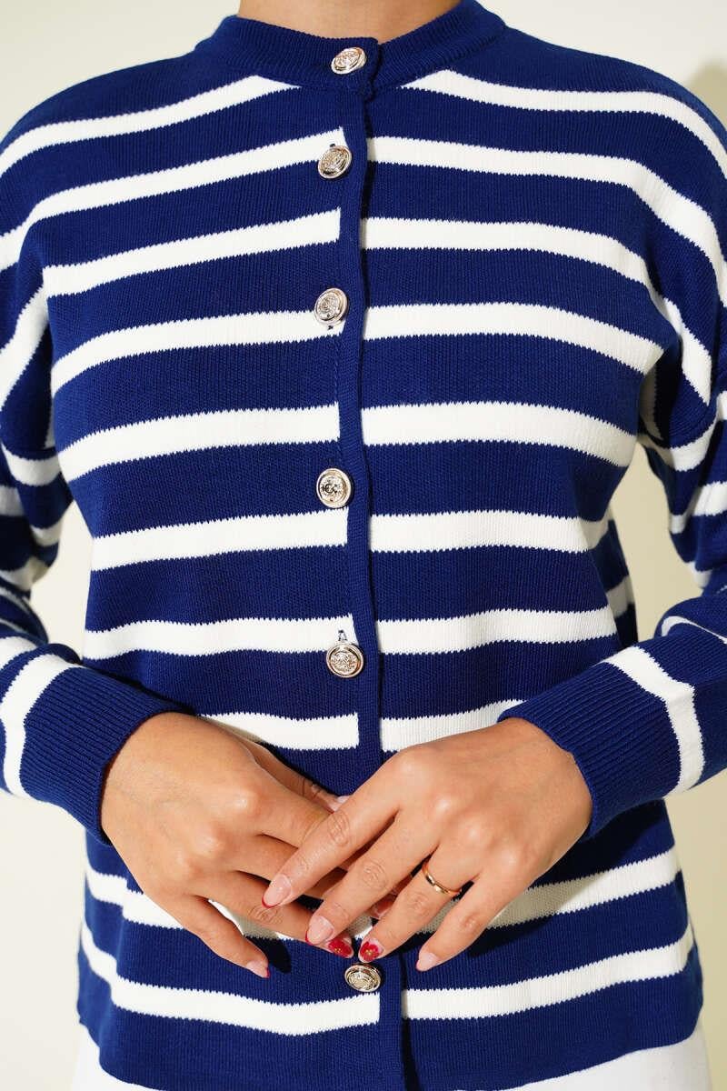 Striped Button Detailed Short Knit Cardigan Navy Blue (0875-7035-669947)