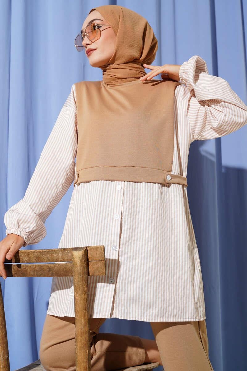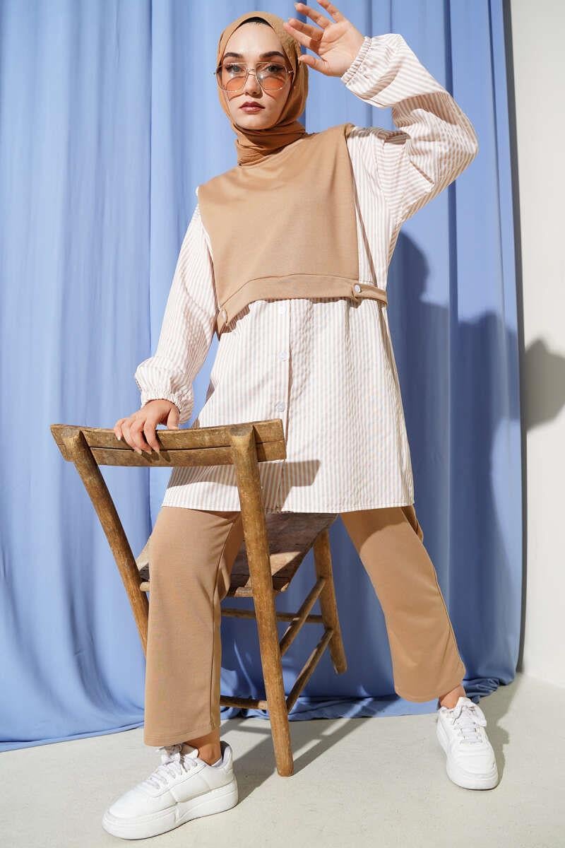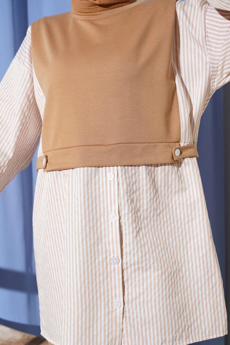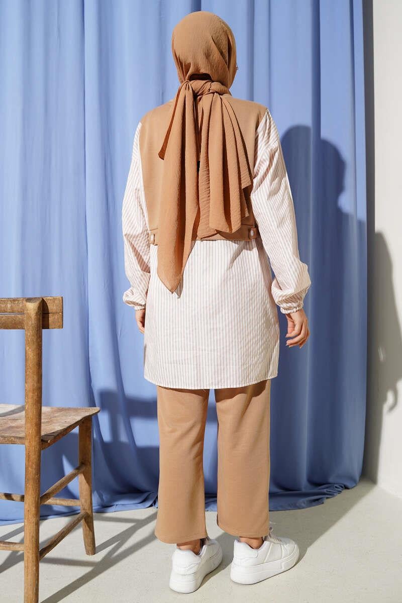 Striped Shirt Garnished 2 Piece Set Latte (0319-1128-672953)