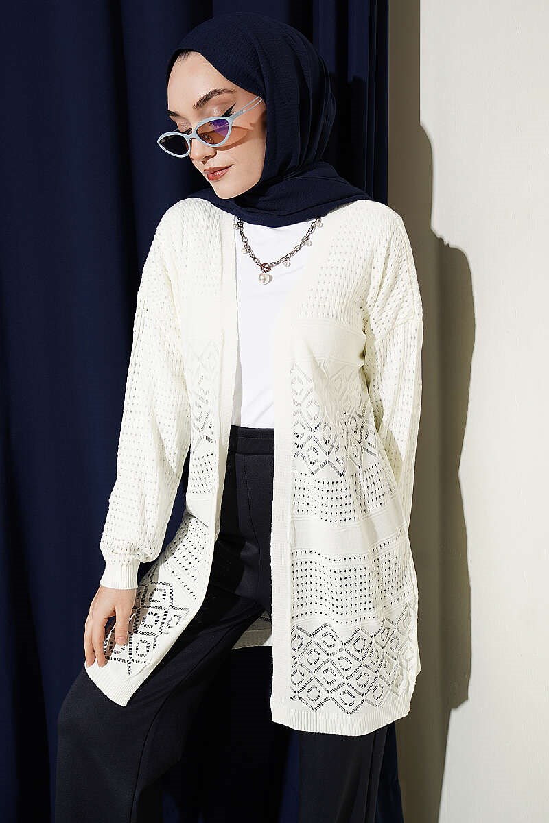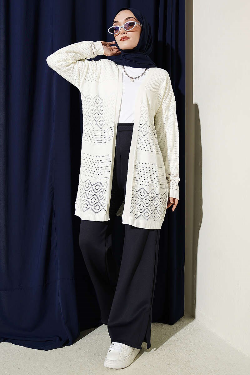 Patterned Openwork Basic Knit Cardigan, Ecru (8374-9824-746022)