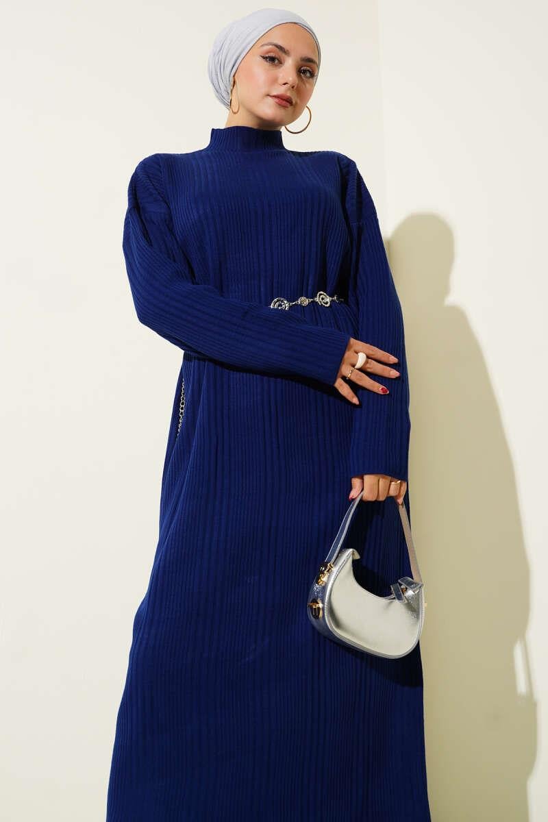 Stand Collar Ribbed Knit Dress Navy Blue (0875-6078-670024)
