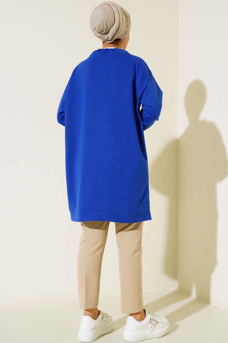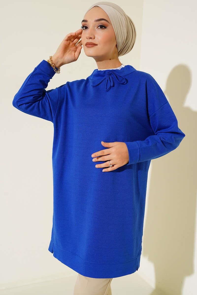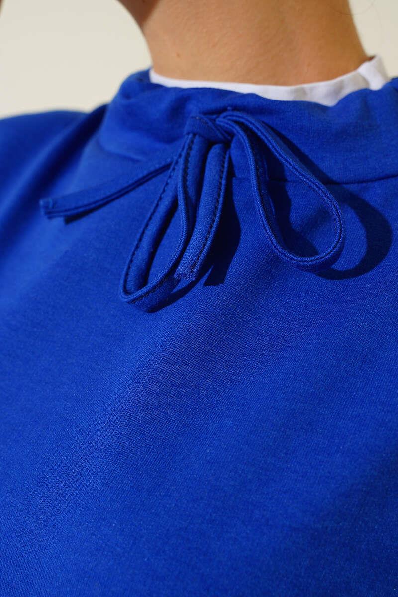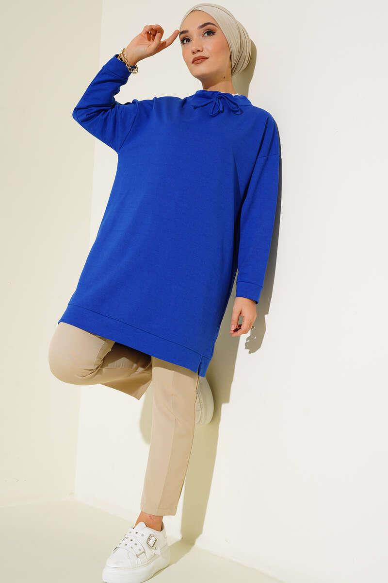 New season Our tunic will be a complementary piece in a sporty combination with its high collar model. The collar of our loose, low-shoulder tunic should be tied with a rope. There are mini slits at the hems.