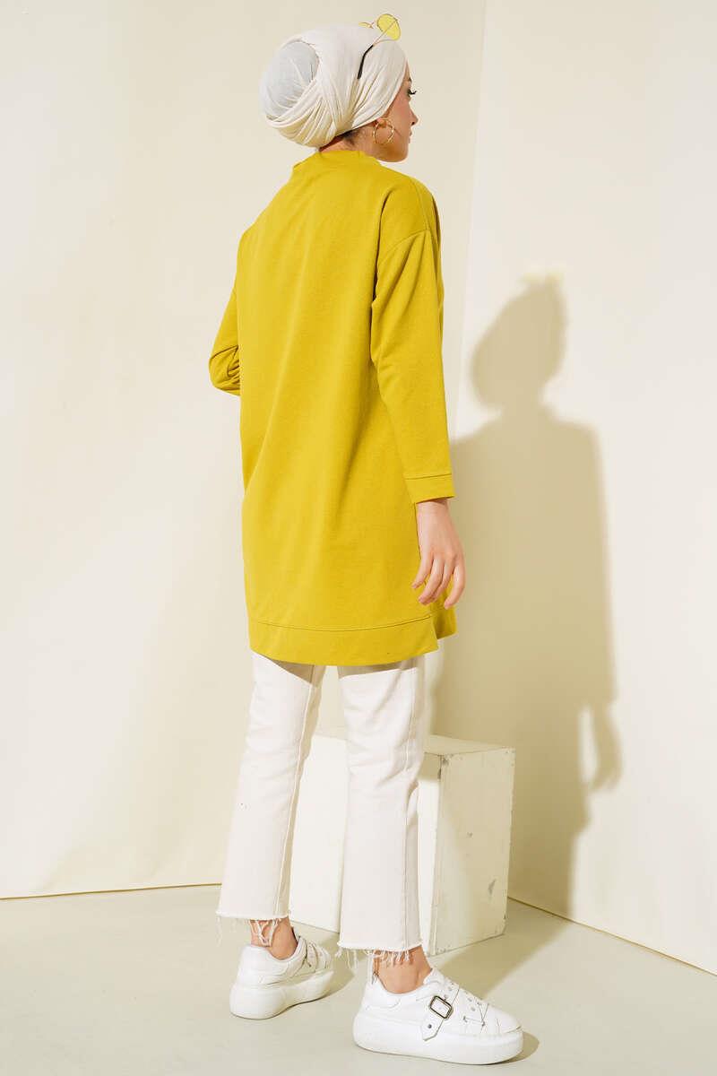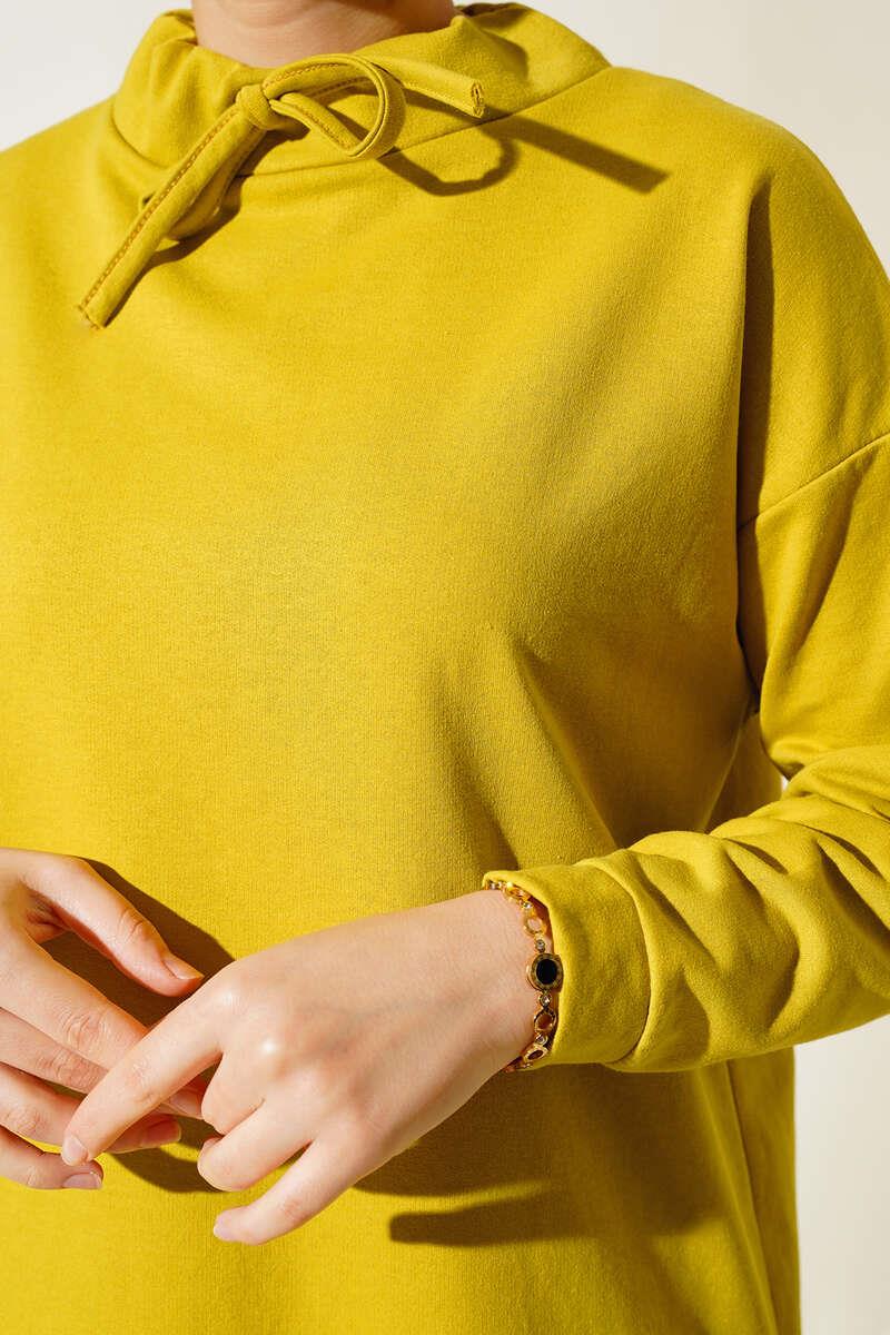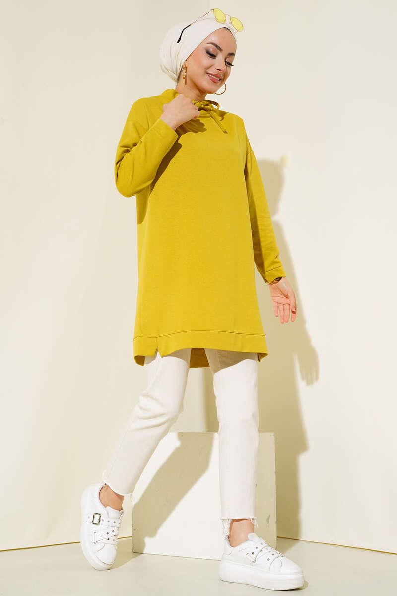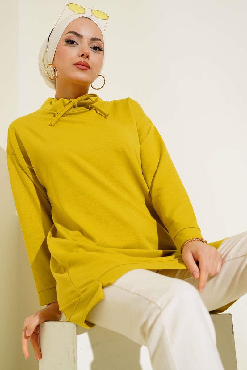 New season Our tunic will be a complementary piece in a sporty combination with its high collar model. The collar of our off-shoulder, loose tunic should be tied with a rope. There are mini slits at the hems.