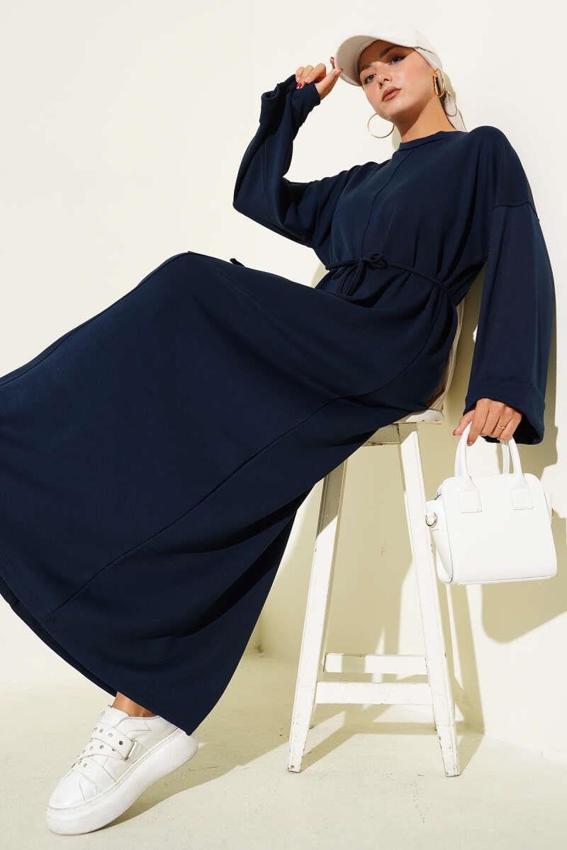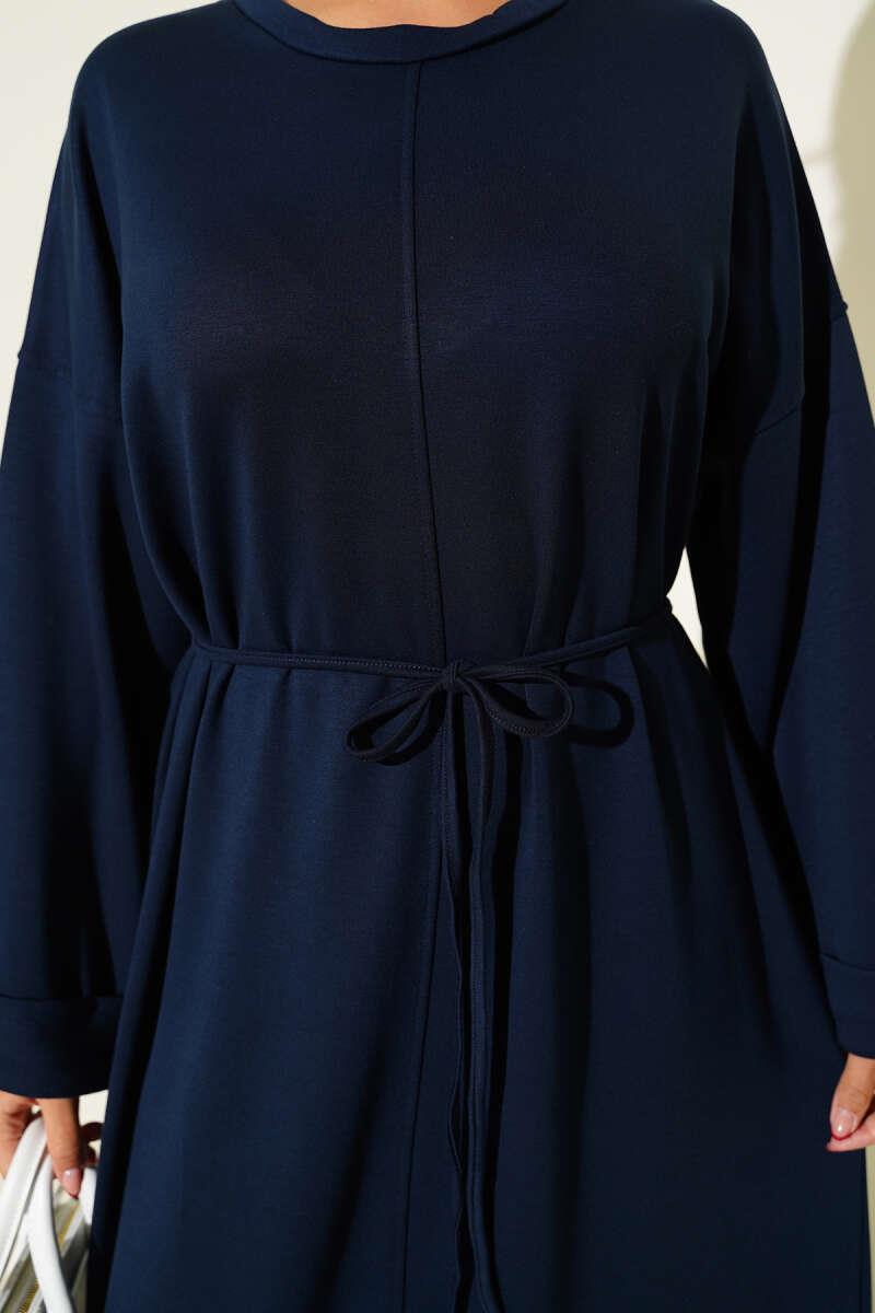 Double Sleeve Loose Rope Belted Dress Navy Blue (0853-8904-673310)