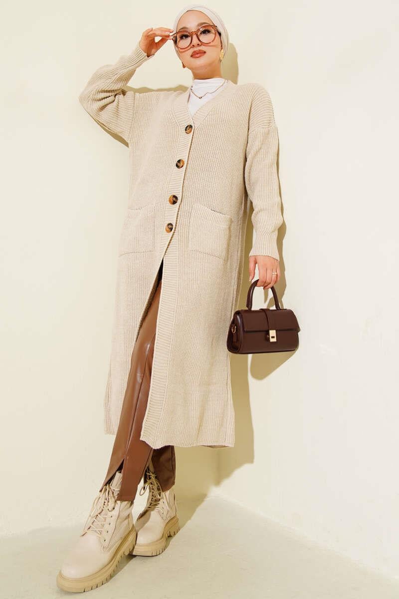 Buttoned Pocket Long Knitted Cardigan Beige (0875-2892-669749)