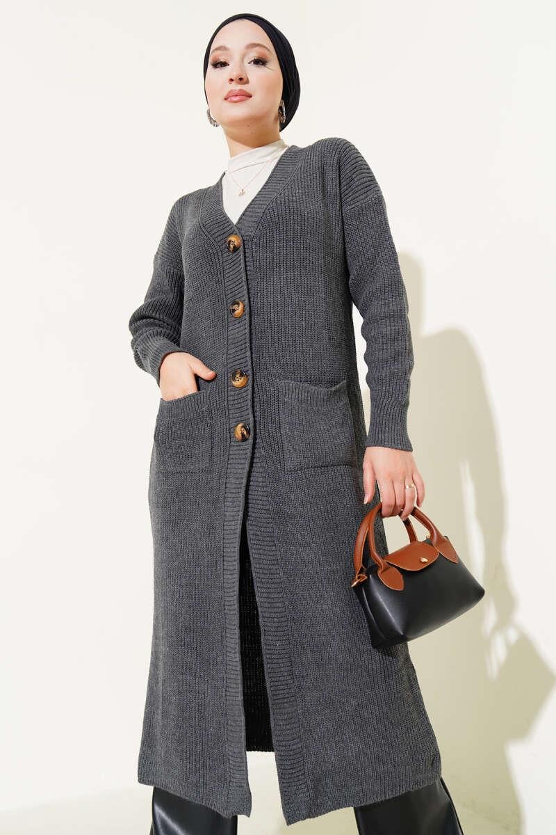 Long Knitted Cardigan with Buttons and Pockets, Smoke (0875-2892-669752)