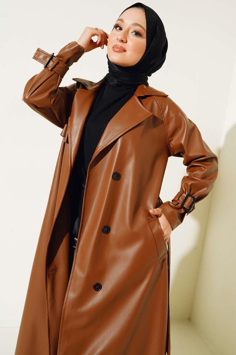 Our new season leather trench coat model is unlined. Our trench coat has a belted waist and belted wrists. Two pockets can be used. Our double-breasted trench coat has three buttons.