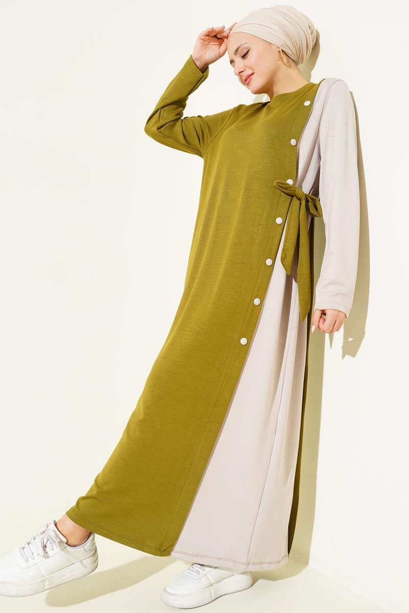 Buttoned Side-Tie Crew Neck Dress in Olive Green (0026-3203-696298)