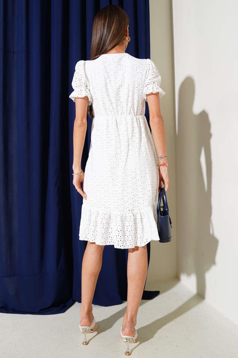 Our new season broderie anglaise dress has inner lining. The shoulders and sleeve ends of our short sleeve dress are elastic. The waist of our V-neck dress is elastic. It is a midi model. It is the savior piece of summer and spring months.