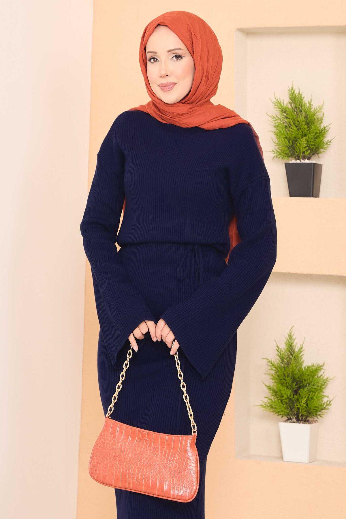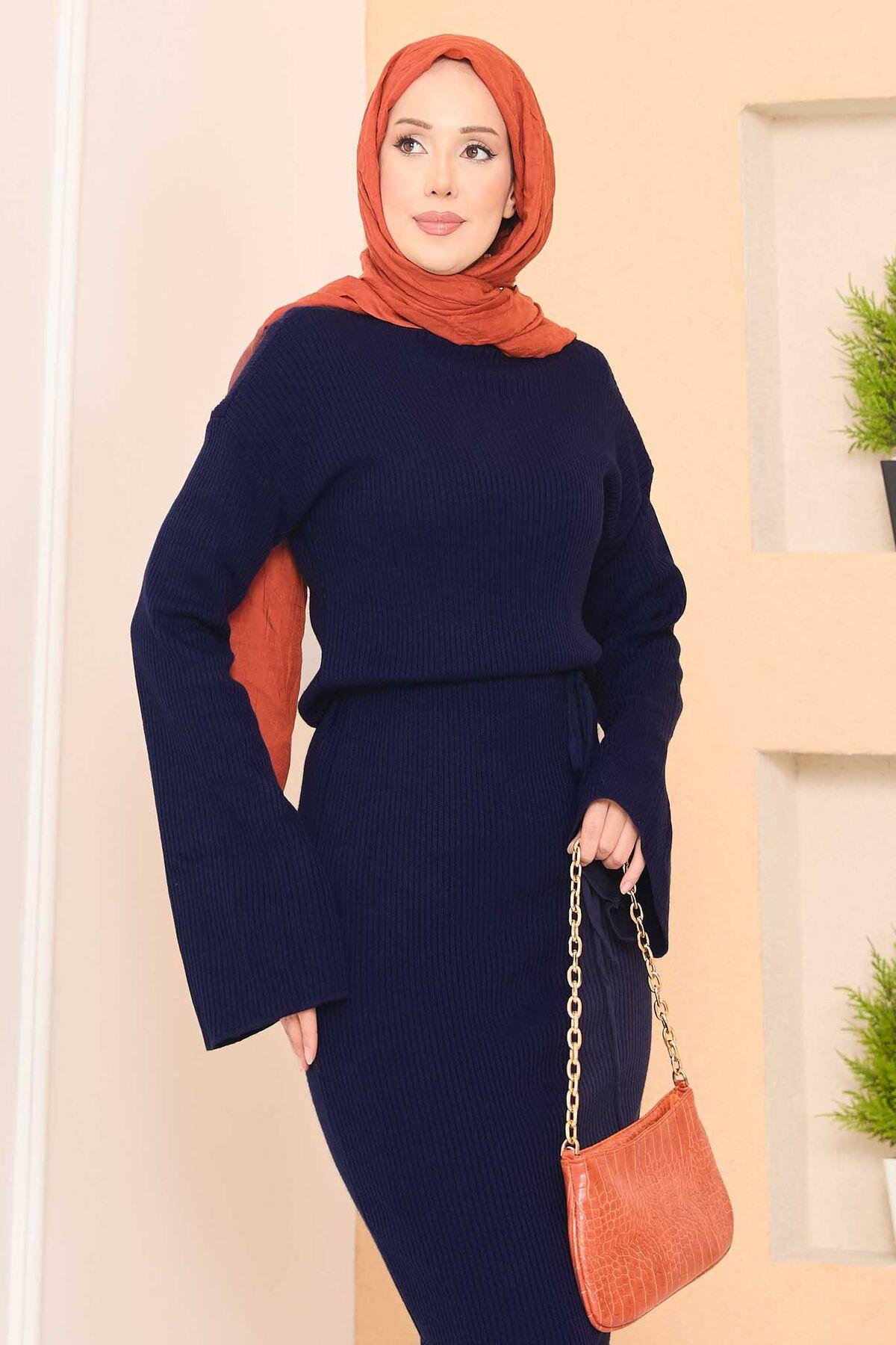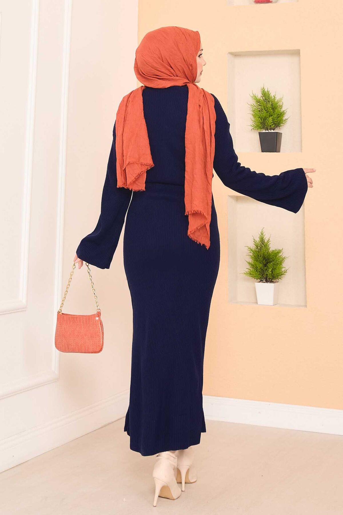 Wide-Sleeve Ribbed Hijab Knit Dress Navy Blue (125M00816623R33STD)