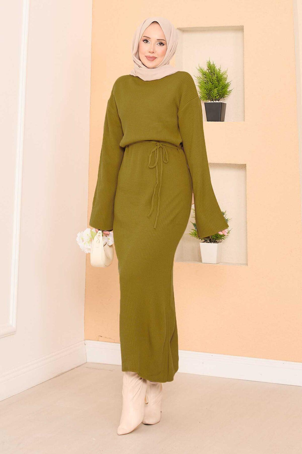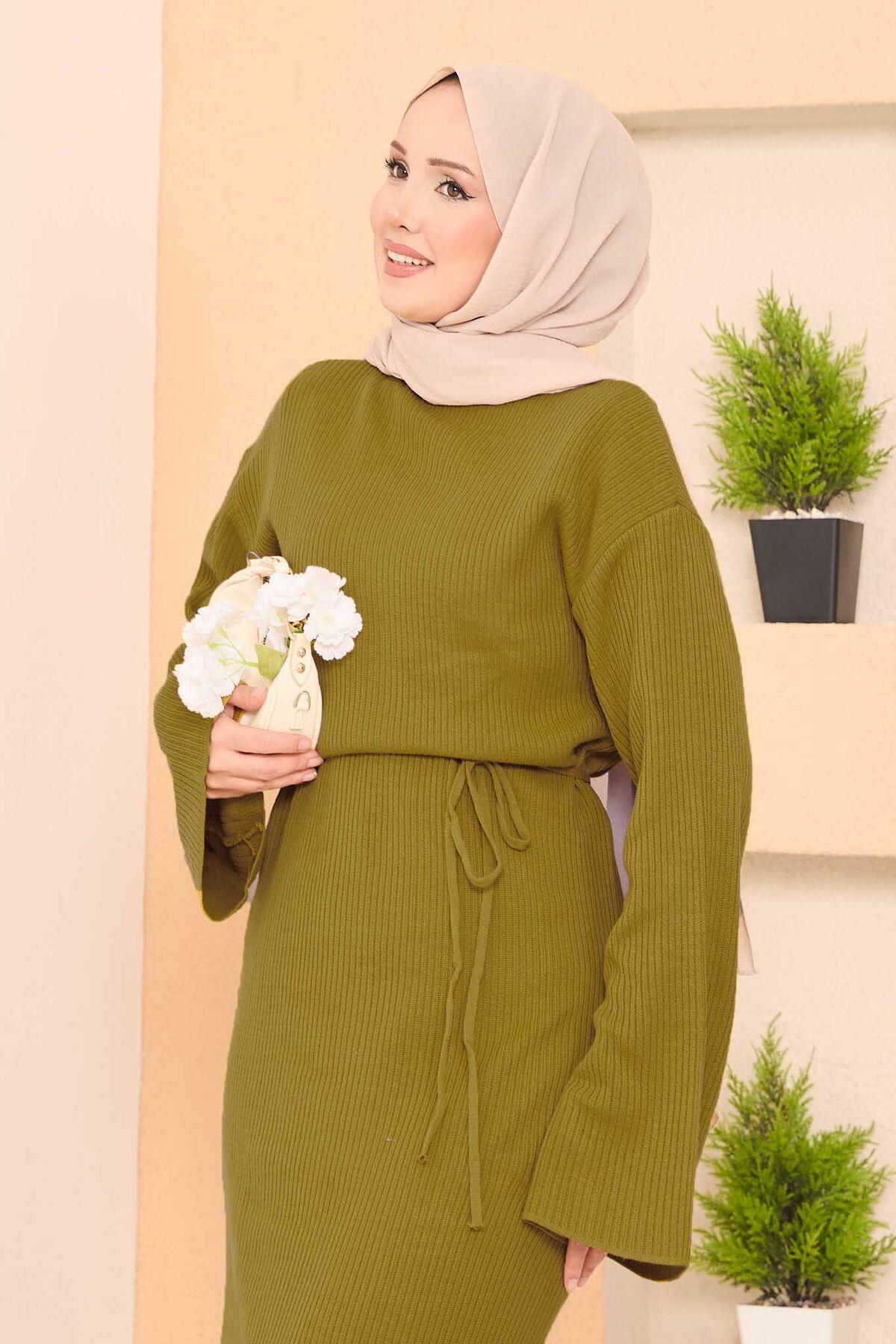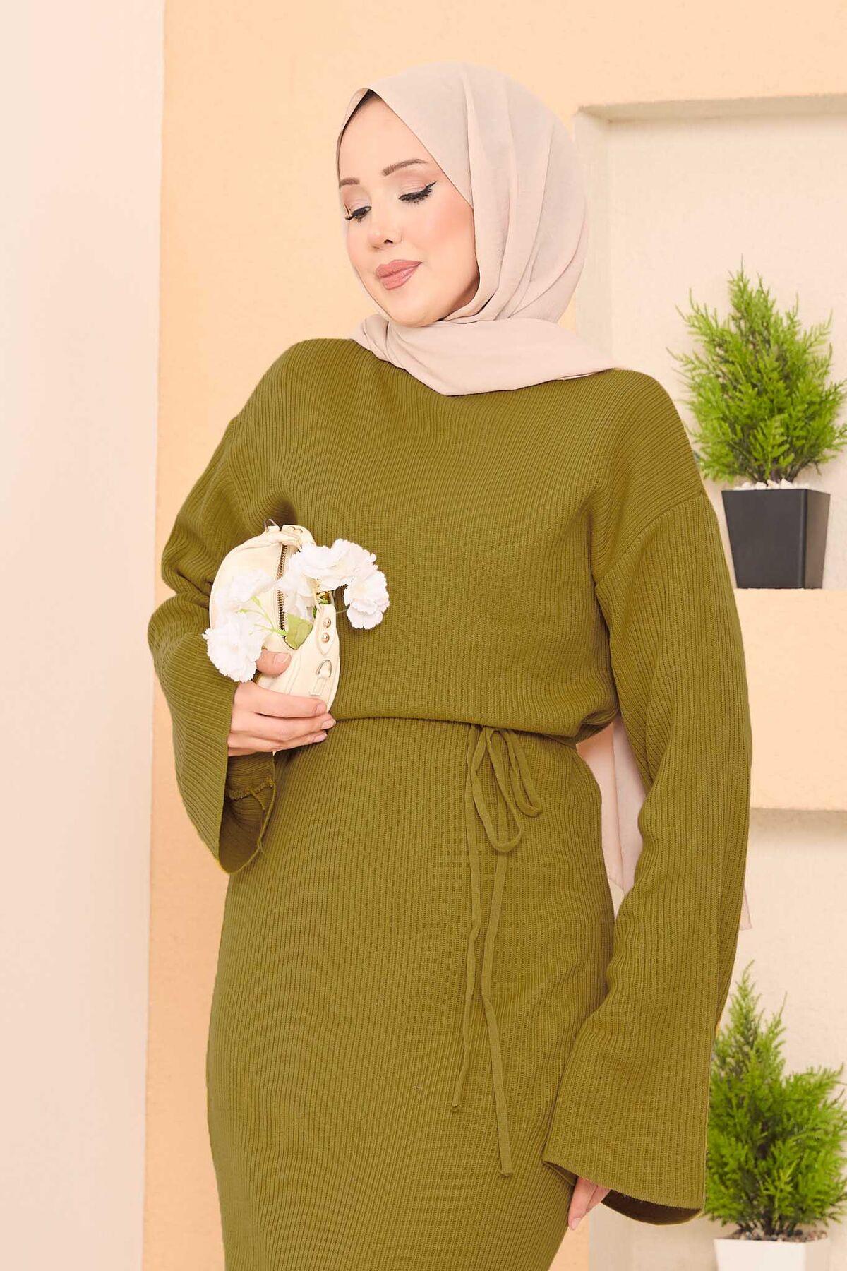 • Product is for the autumn-winter season. Long hijab dress with wide sleeves, ribbed trim, removable belt.