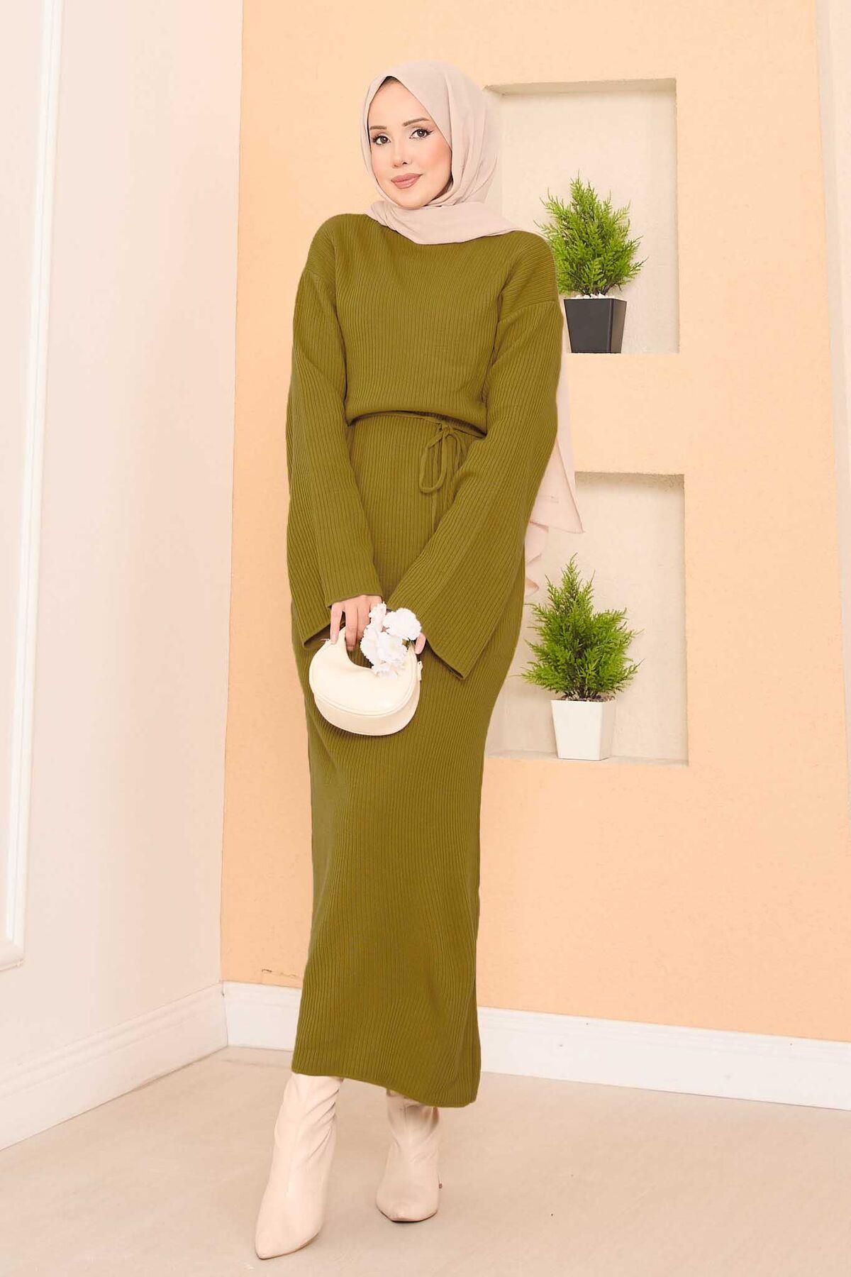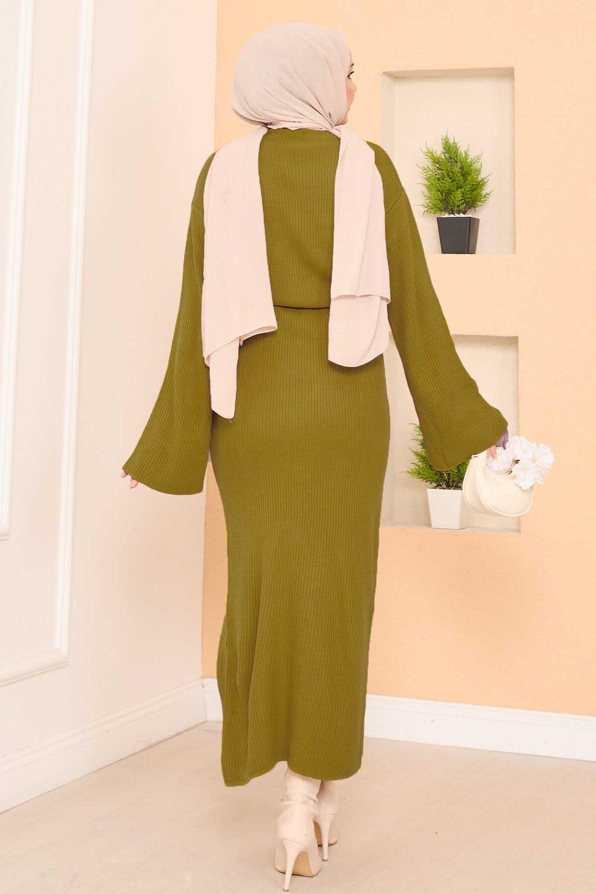 Wide-Sleeve Ribbed Hijab Knit Dress Oil Green (125M00816623R65STD)