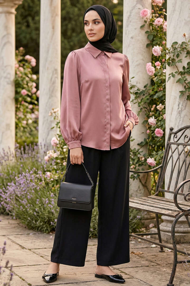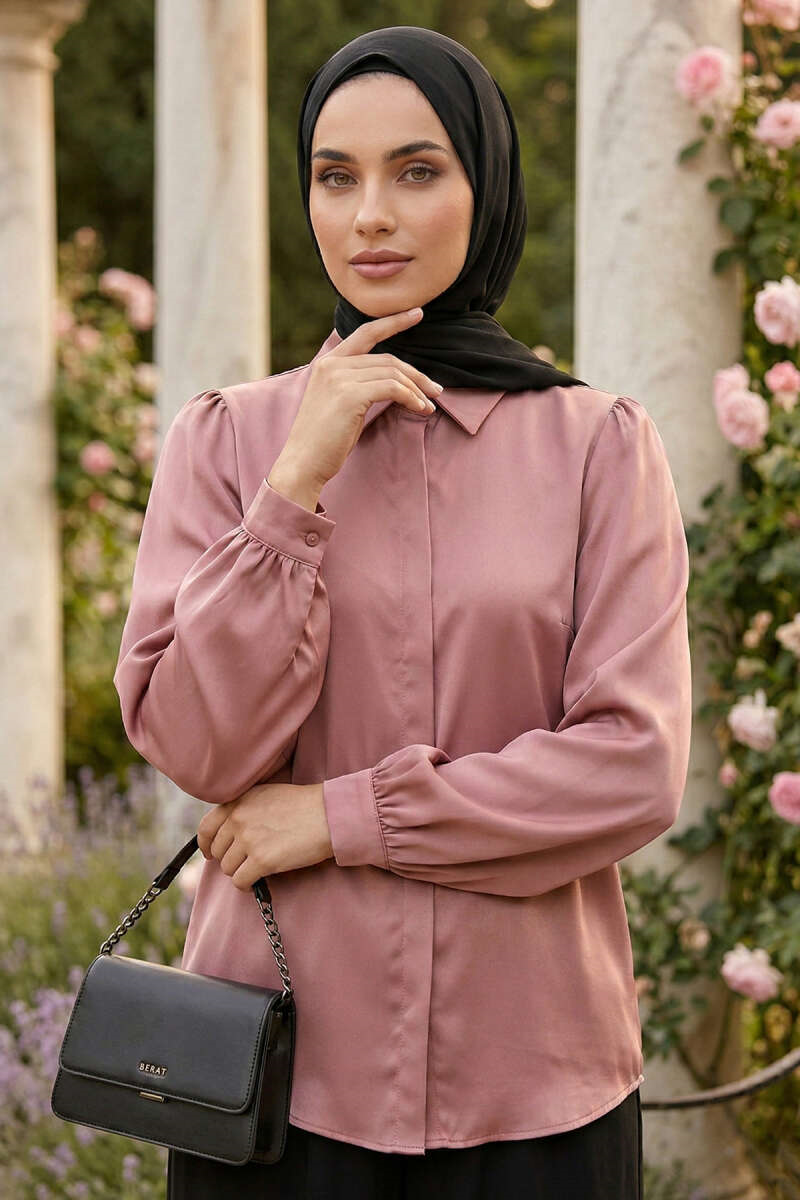 Hidden Button Basic Satin Shirt, Rose Pink (0999-5186-731195)