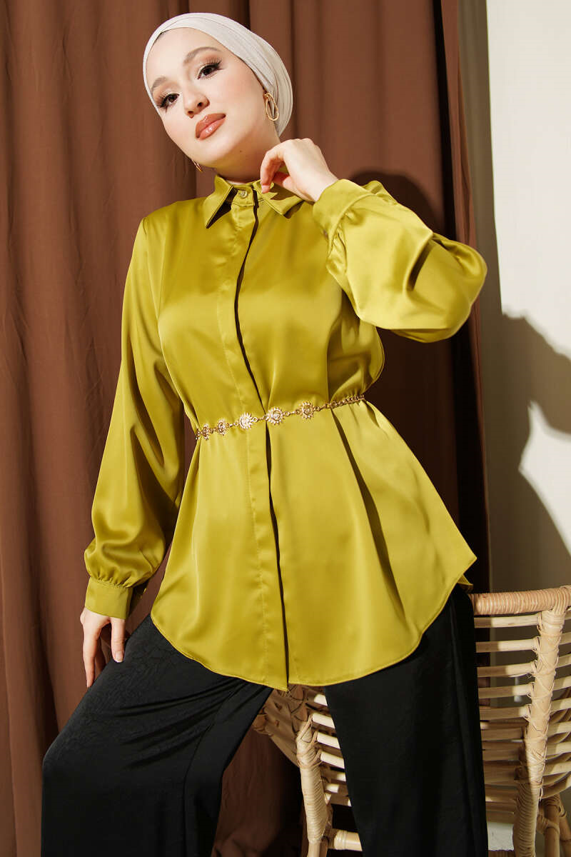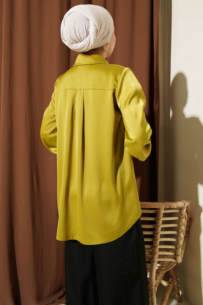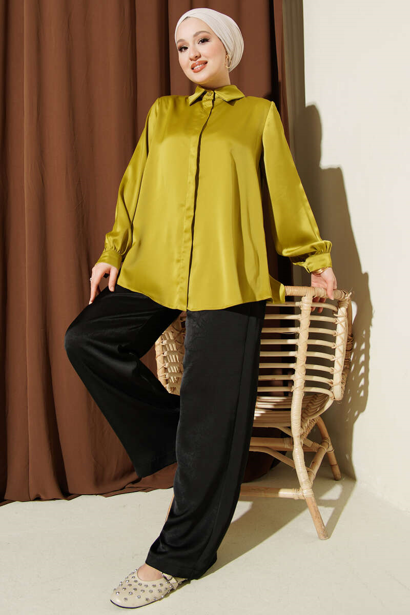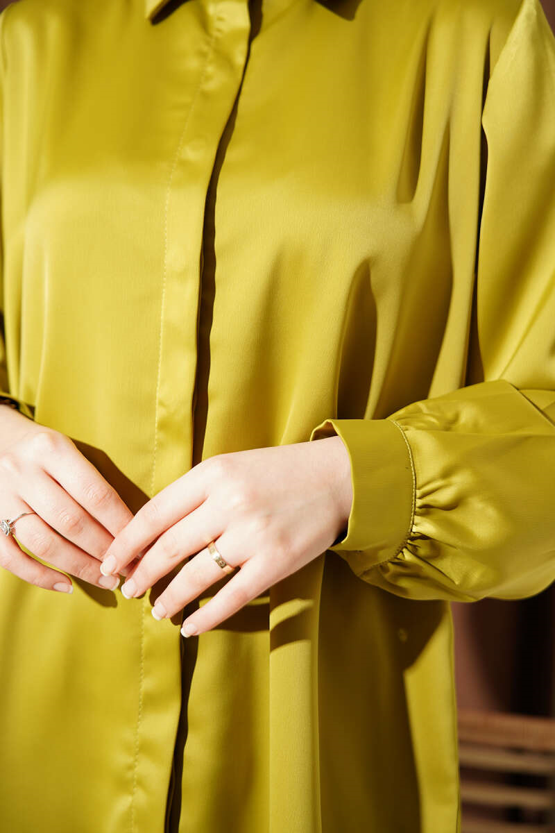Basic Satin Shirt with Concealed Buttons, Olive Green (0999-5186-724393)