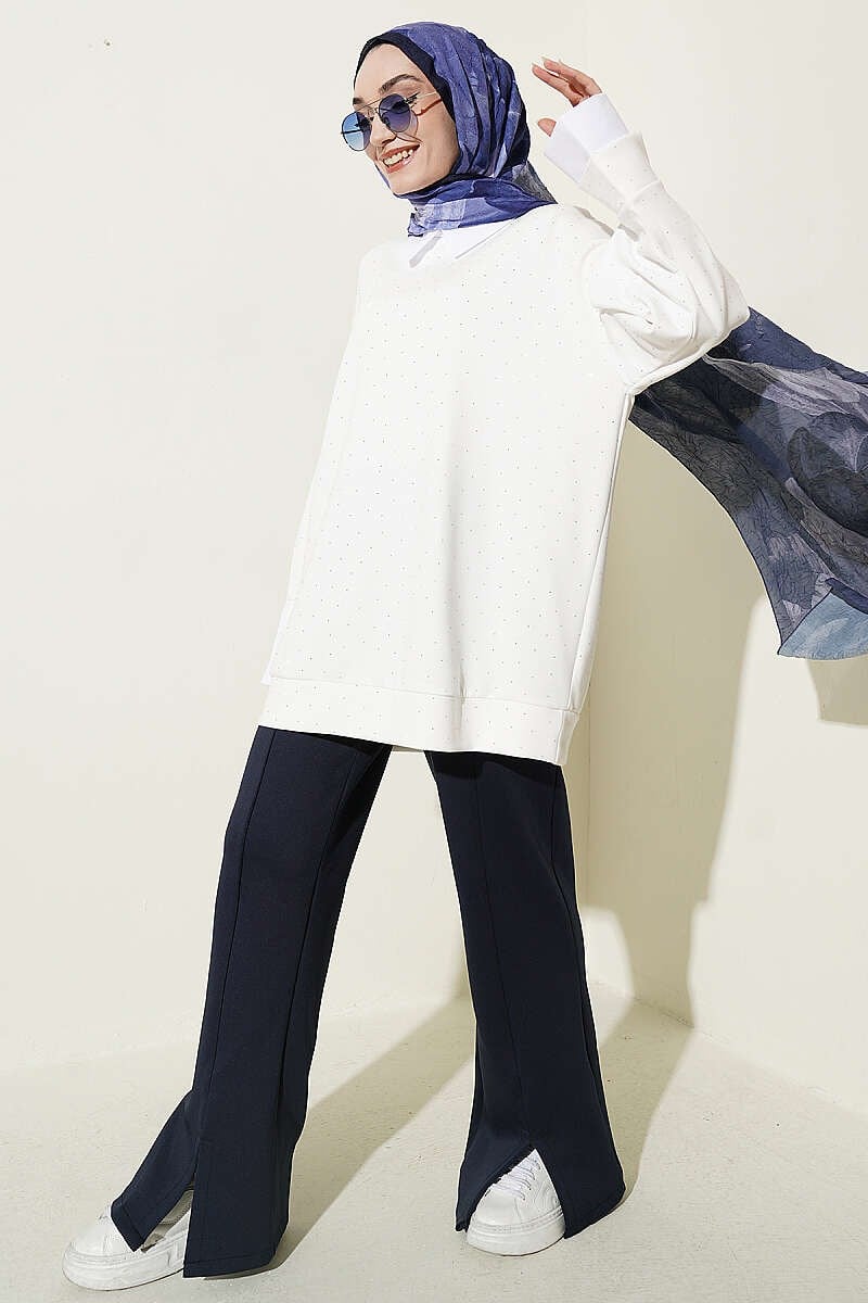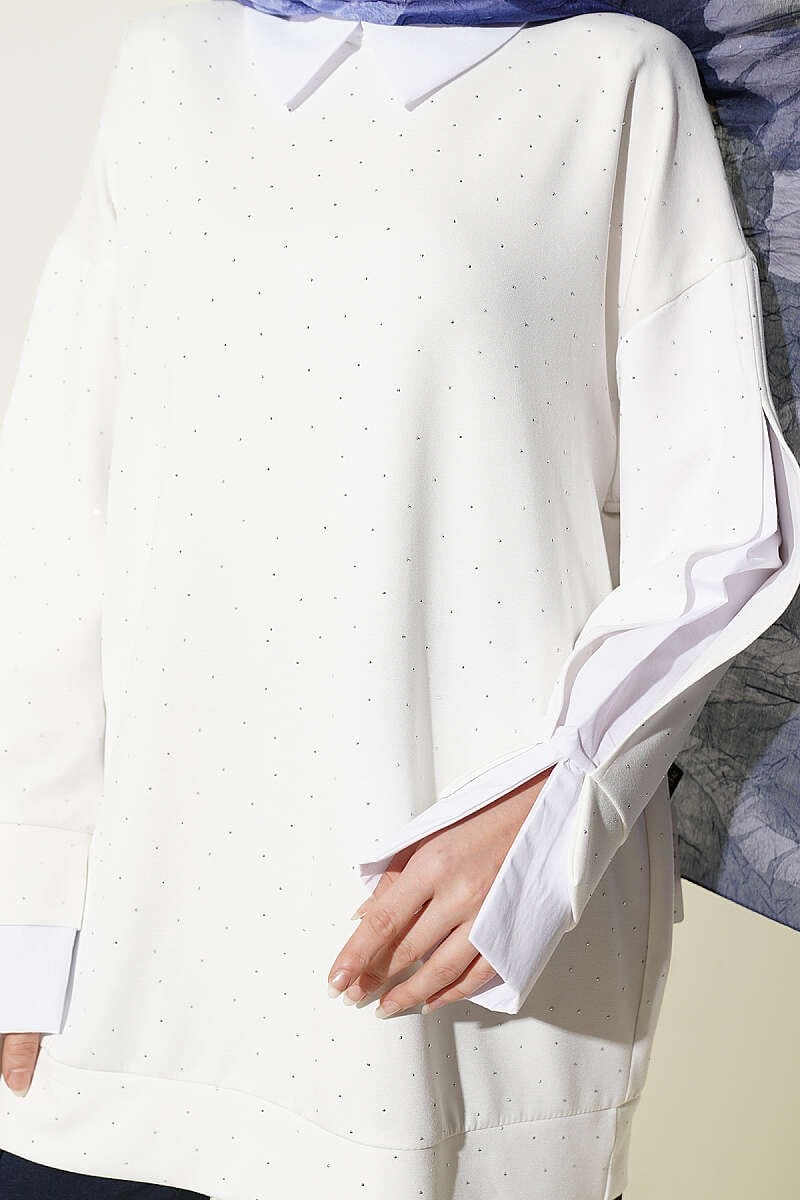 Shirt Trimmed Tunic with Stone Embellishments, Ecru (0532-8274-748201)