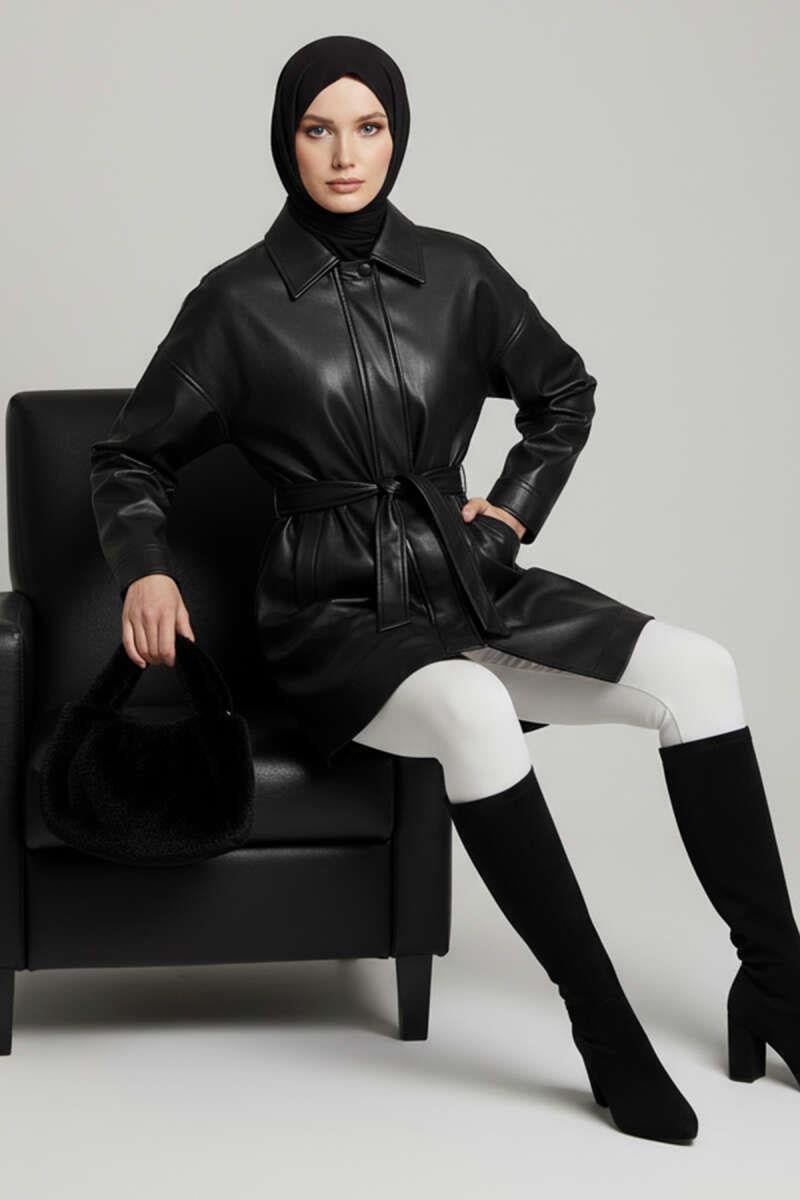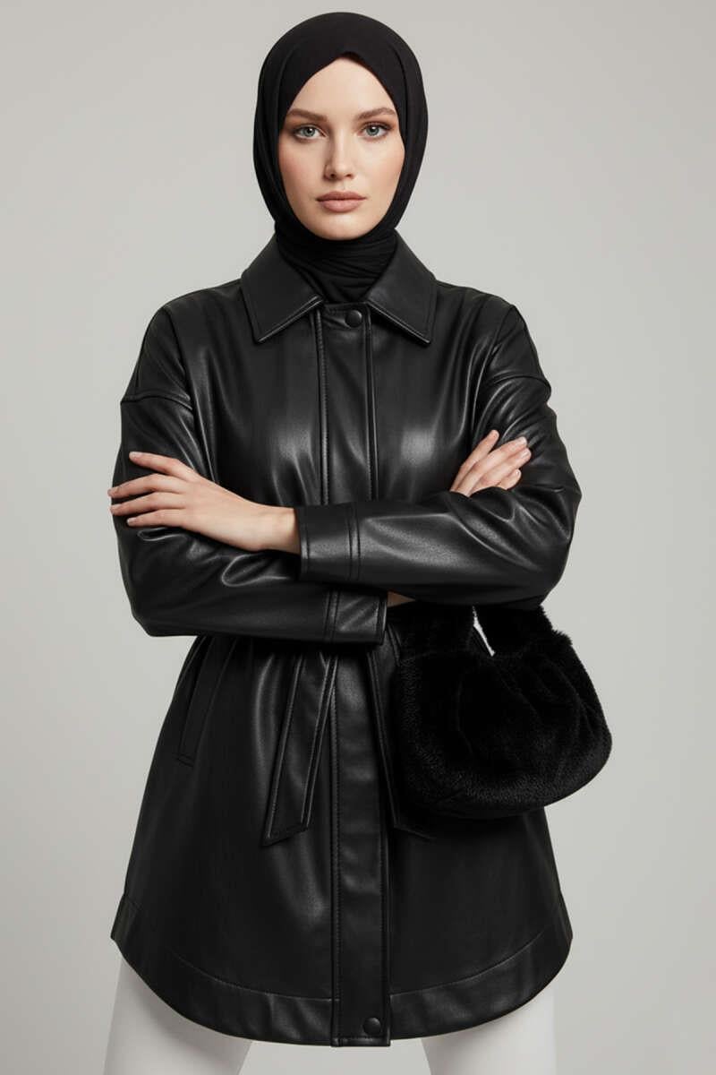 Shirt Collar Belted Leather Jacket Black (0999-6388-673467)