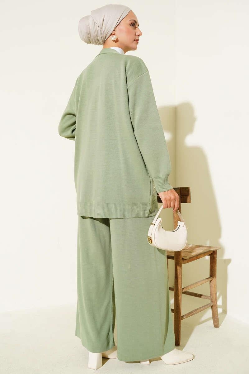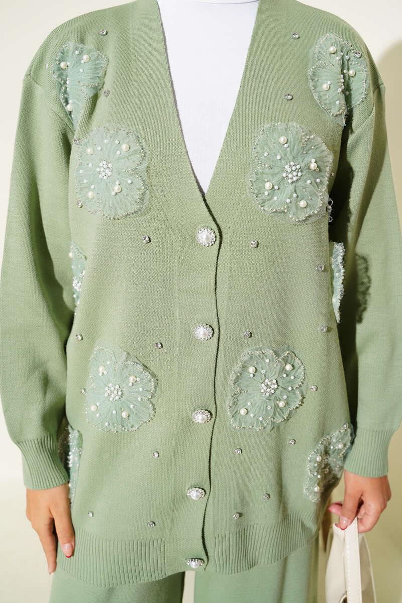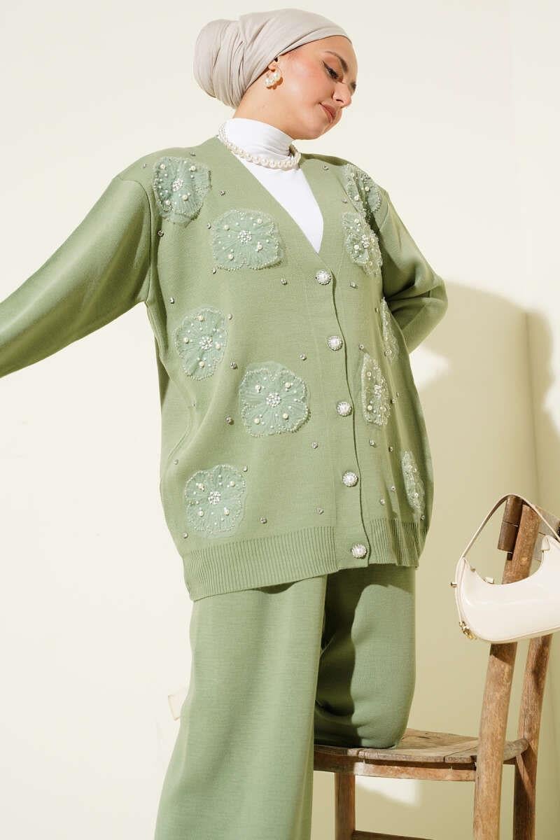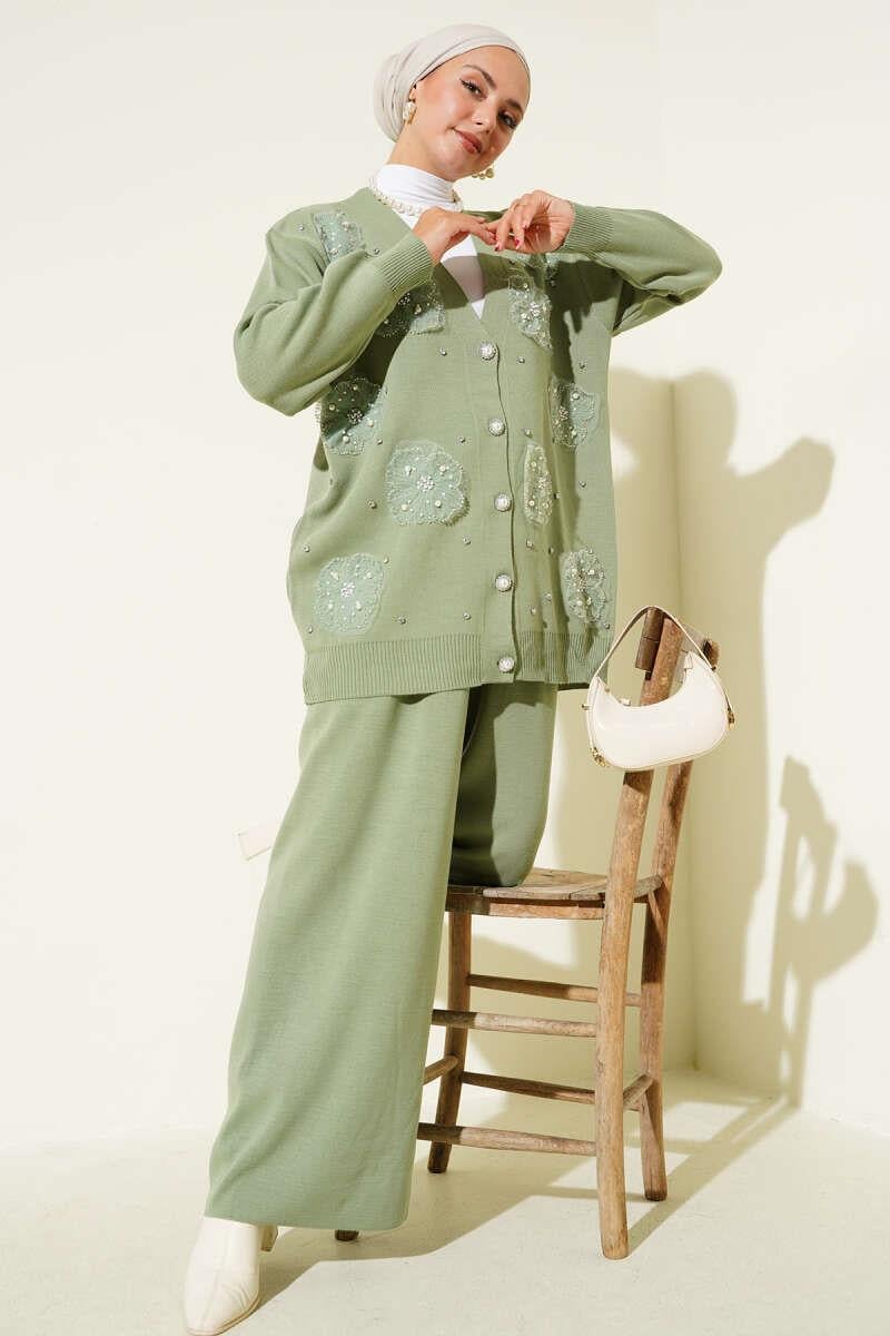 Pearl Flower Detailed Two-Piece Knitwear Set, Almond Green (0853-3155-672693)