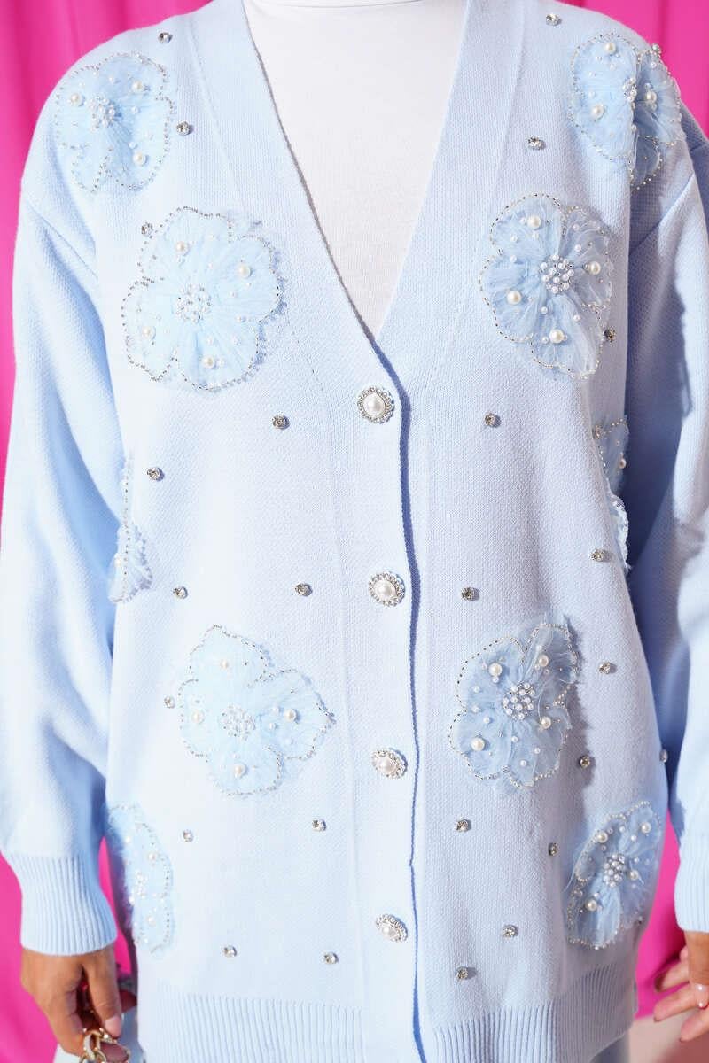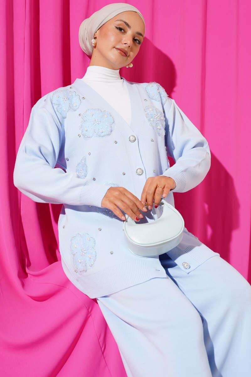Pearl Flower Detailed Two-Piece Knitwear Set Blue (0853-3155-672696)