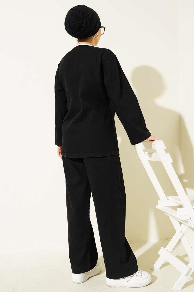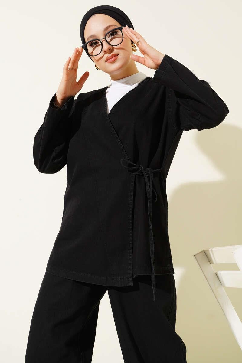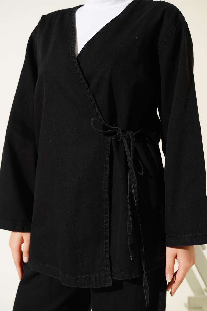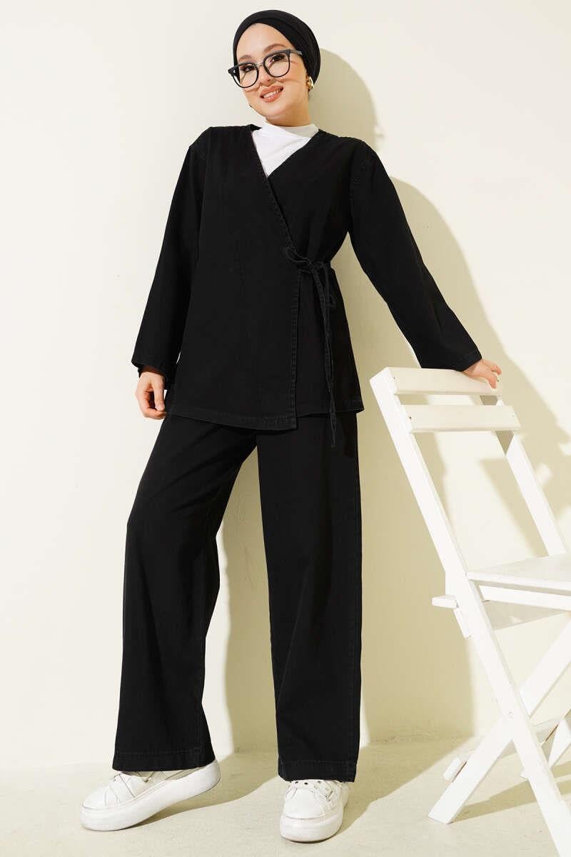 Rope-Tied V-Neck Denim 2 Piece Set Black (0999-6473-678175)