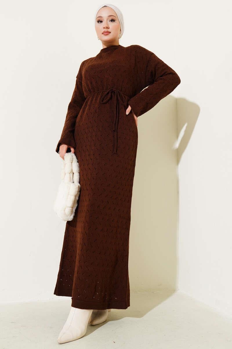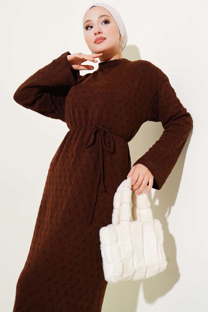 Openwork Knit Dress with Rope Belt, Brown (0875-4463-675608)