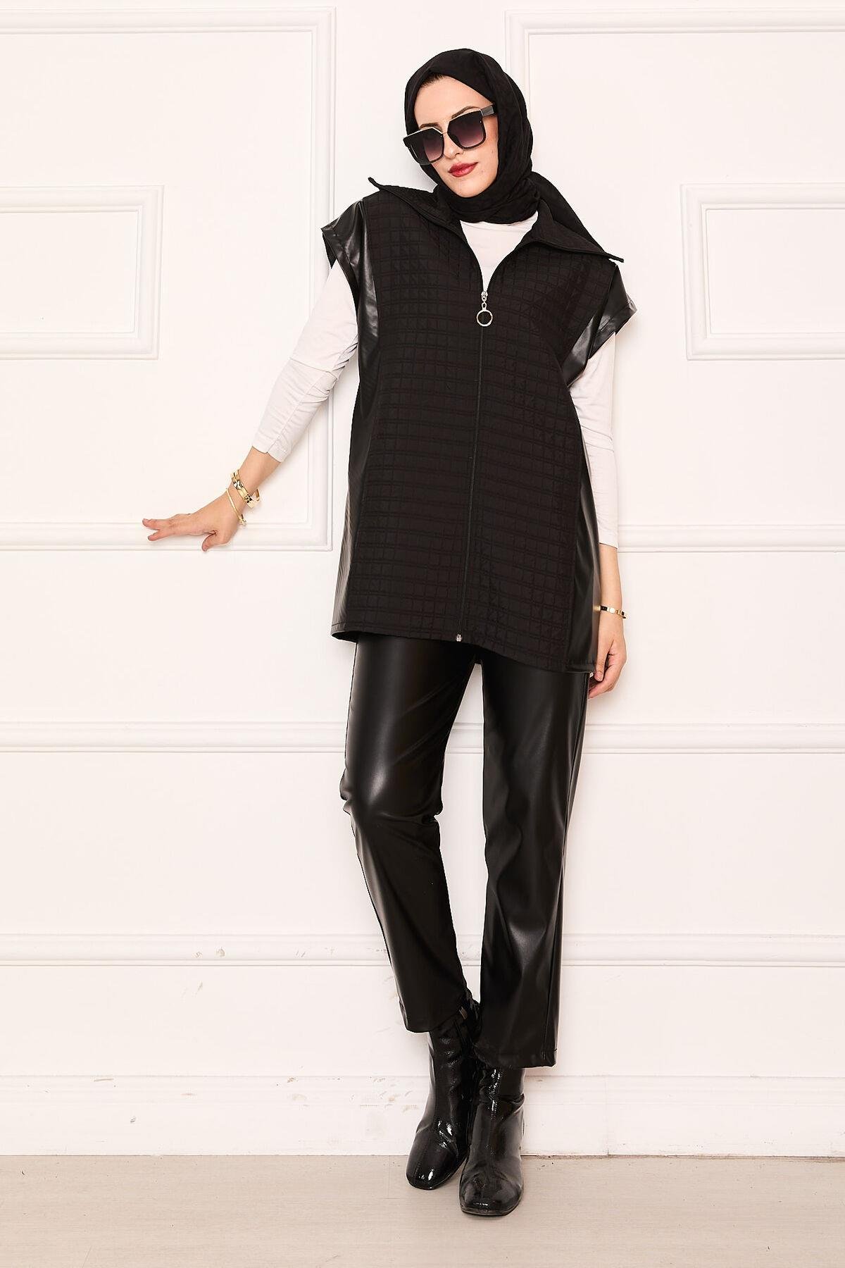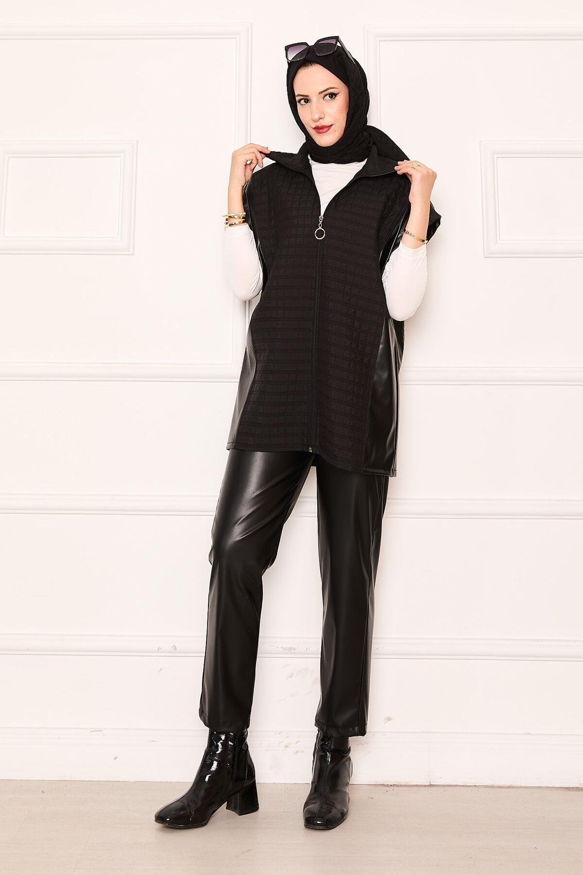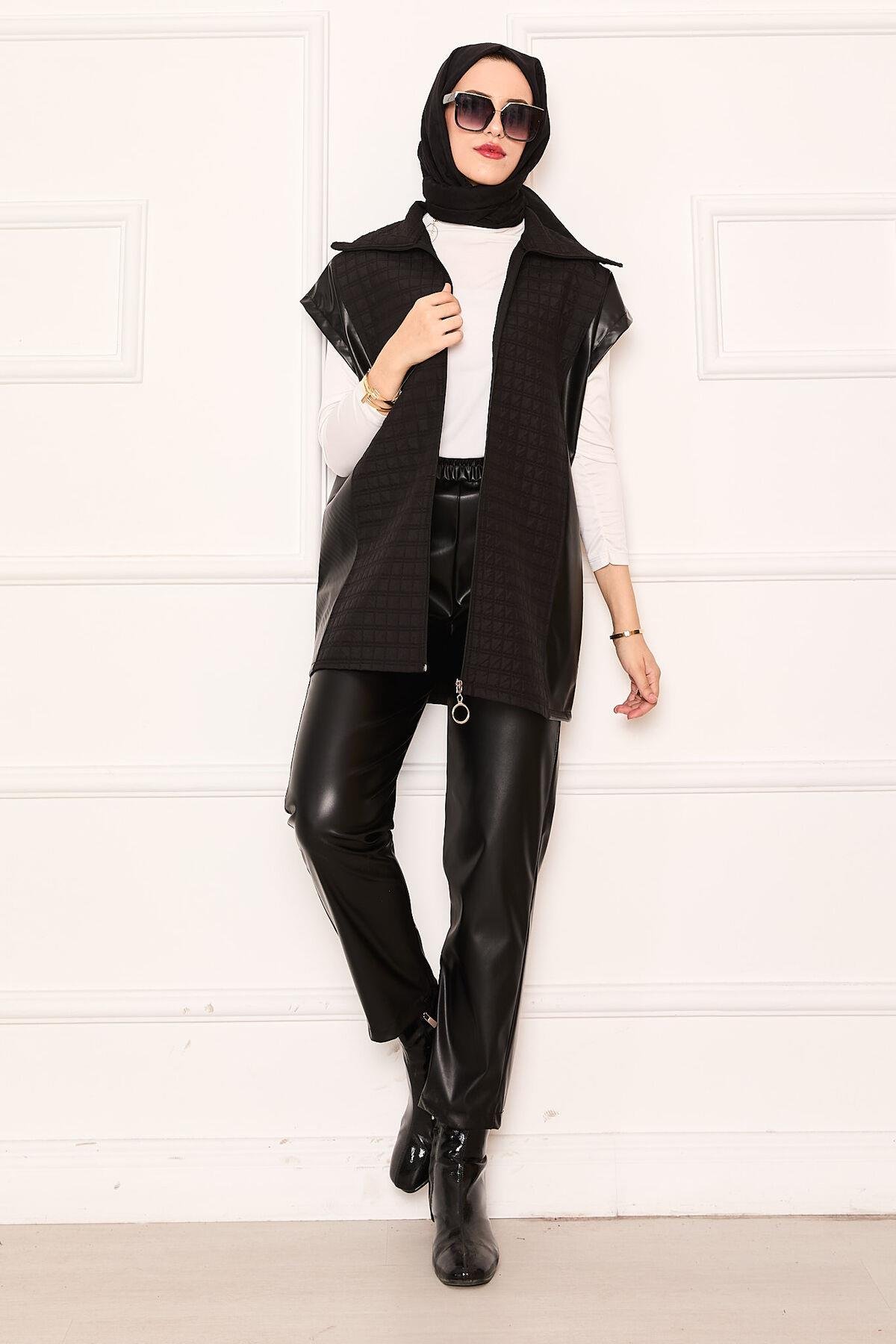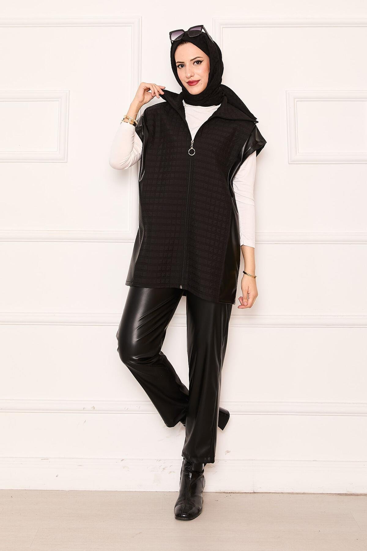• The product is seasonal. 2 Piece Set with a quilted vest, the vest has a zippered front, quilted and leather details. The trousers are crazy, elastic at the waist and have pockets.