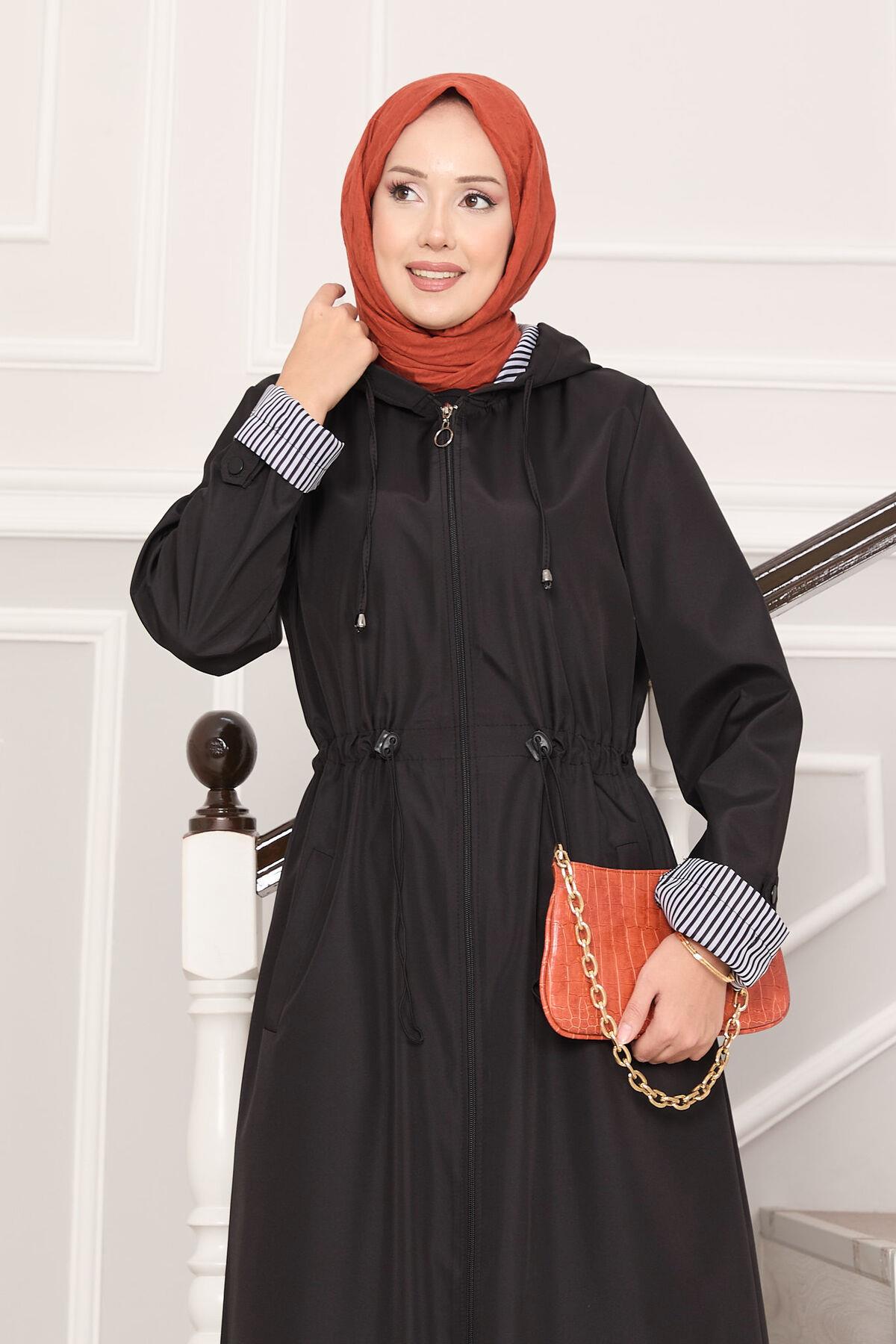 Hooded Adjustable Waist Large Long Trench Coat Black (125M01913340R5242)