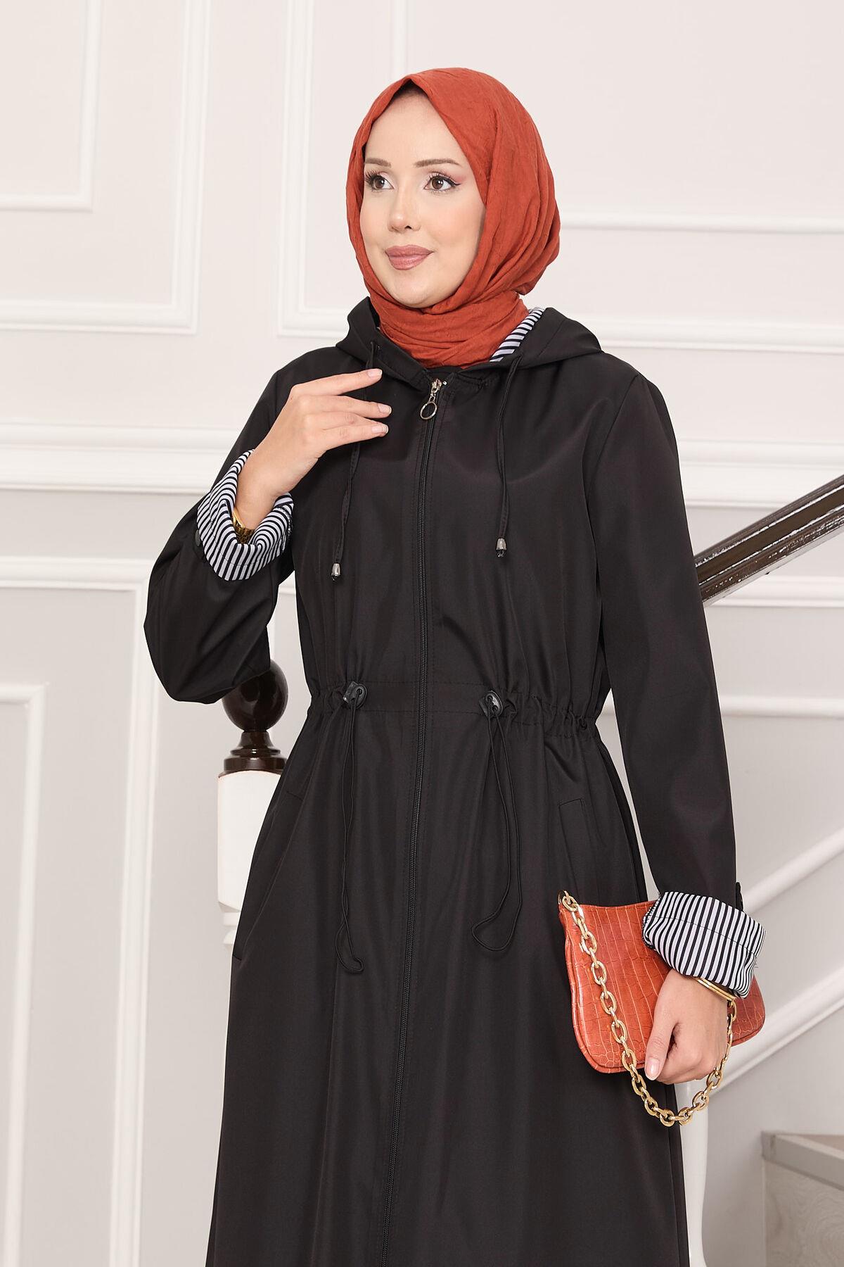 • The product is suitable for all four seasons. The product has a zipper at the neck and an adjustable waist. The sleeve cuffs are foldable and have snap fasteners. It has two side pockets on the right and left. It has a comfortable fit and a hood. The product has a striped pattern on the inside.