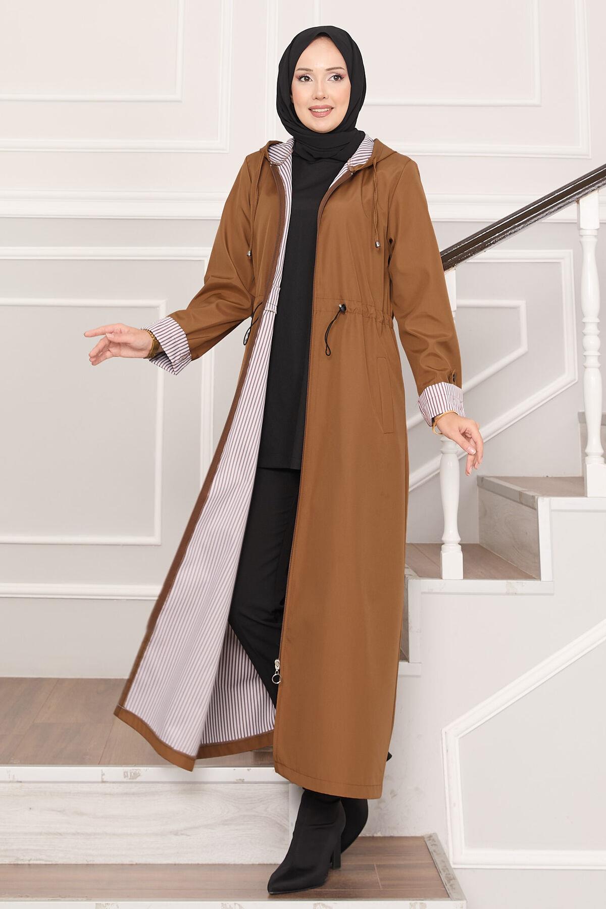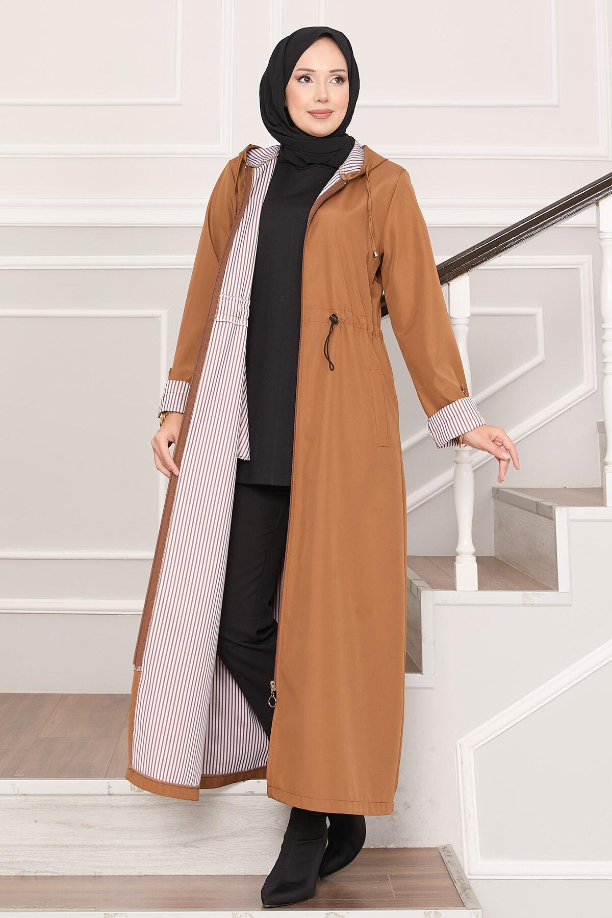 • The product is suitable for all four seasons. The product has a zipper at the neck and an adjustable waist. The sleeve cuffs are foldable and have snap fasteners. It has two side pockets on the right and left. It has a comfortable fit and a hood. The product has a striped pattern on the inside.