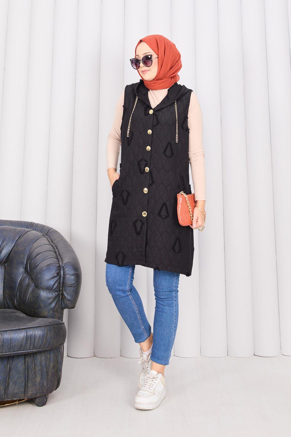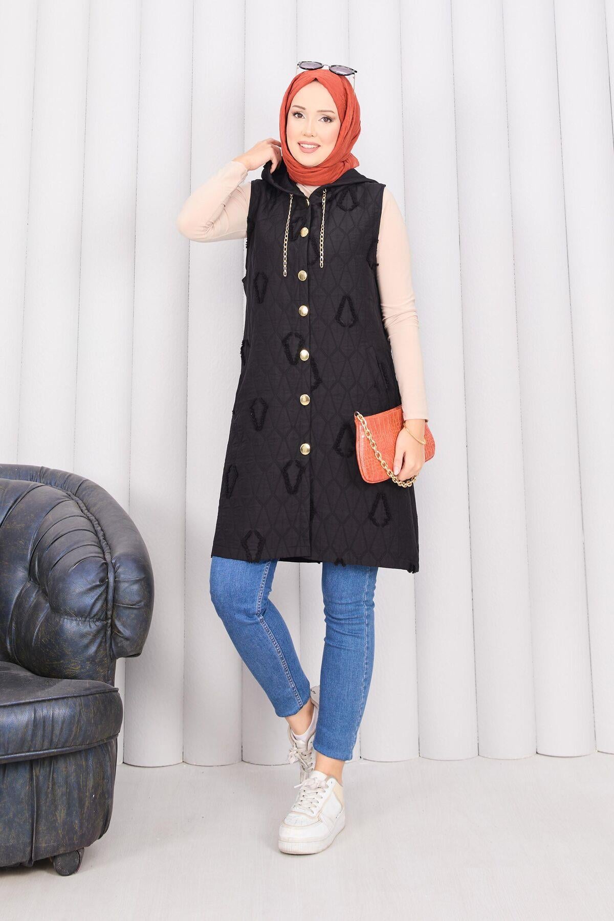 Hooded Buttoned Hijab Quilted Vest Black (125M00921220R5238)